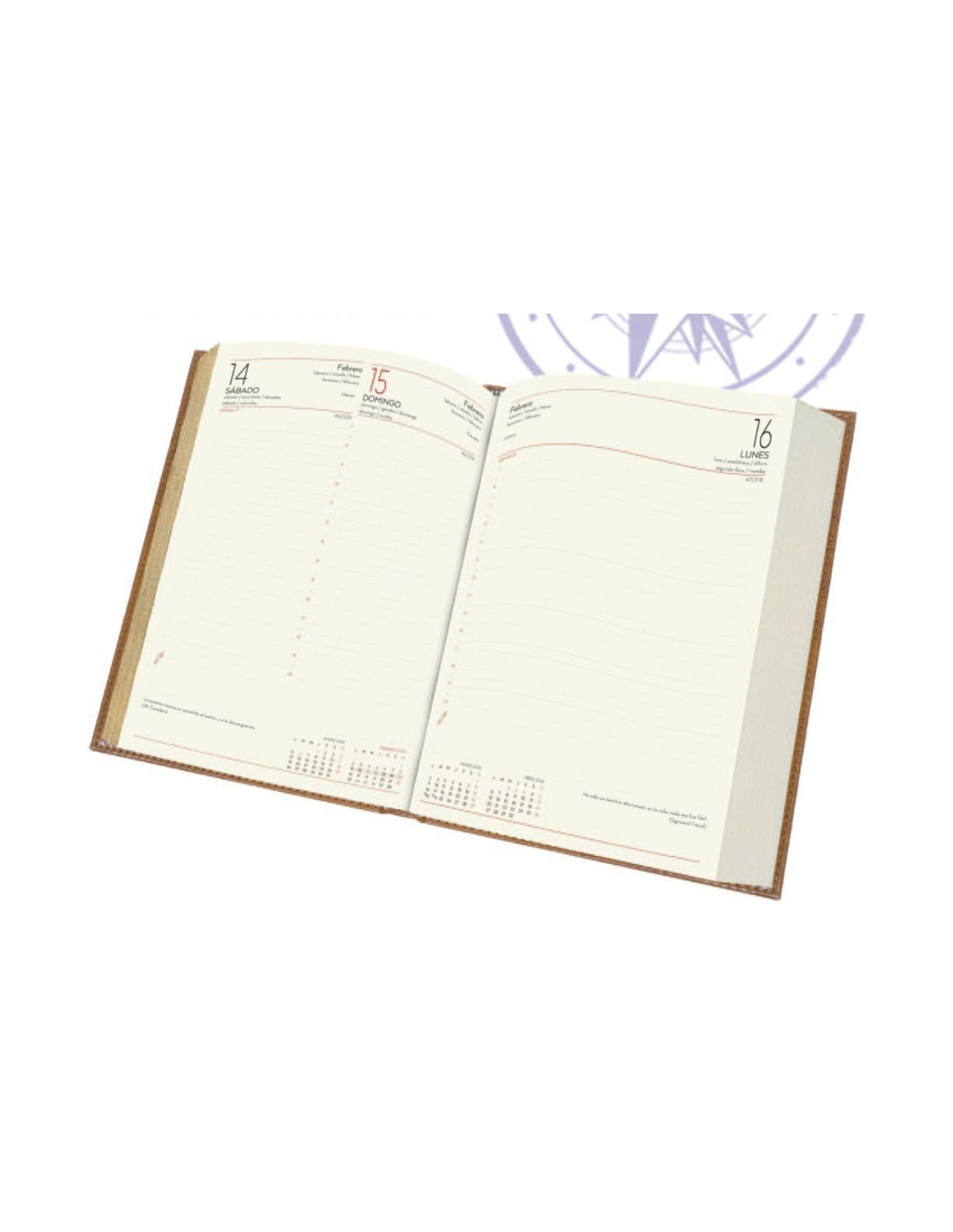 Agenda diaria modelo OSLO con portadas imitando a piel de diferentes colores (Azul, Rojo, Verde y Cuero) con cosido perimetral en otro tono y marcapáginas de color plata. Agenda de 344 páginas de 80 gr en color crema con disposición día/página. Medida 17 x 24 cm.