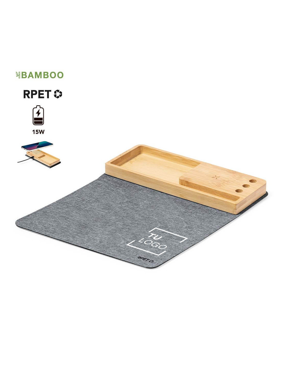 Alfombrilla plegable fabricada en suave poliéster RPET y bambú sostenible. Equipada con un cargador inalámbrico de 15W compatible con tecnología Qi, incluye un cable Tipo C negro.