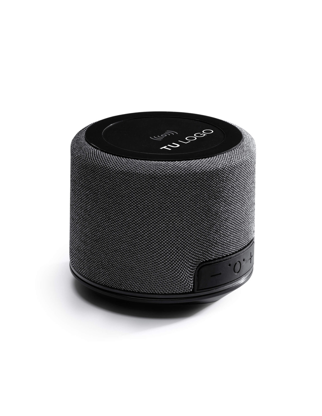 Altavoz inalámbrico de color negro fabricado en tejido ecológico RPET con base de carga inalámbrica 5W y potencia de 3W. Este cómodo altavoz inalámbrico con conexión tipo C incluye el cable y una elegante caja de presentación individual. Medida: 8cm / 9,3 Ø.