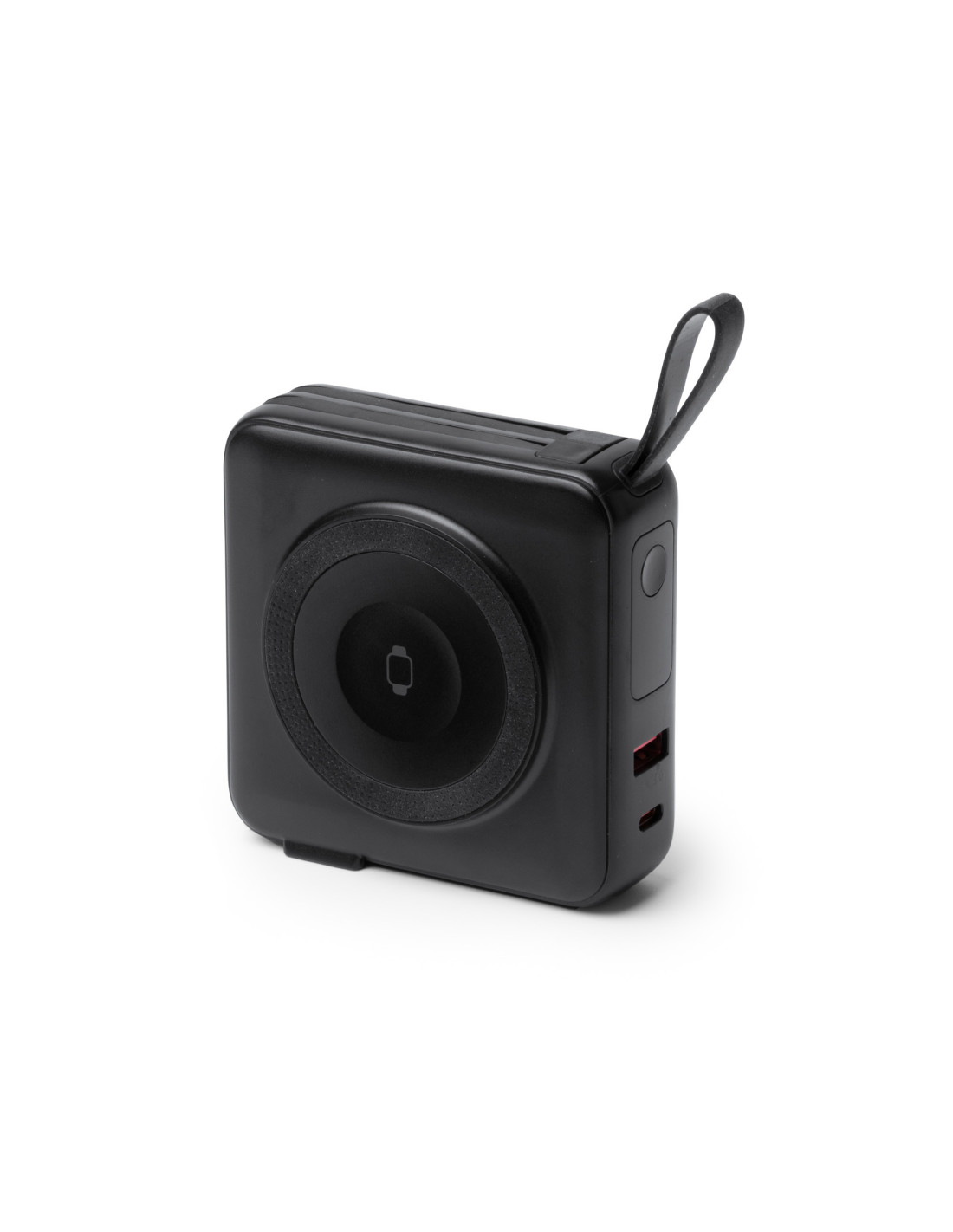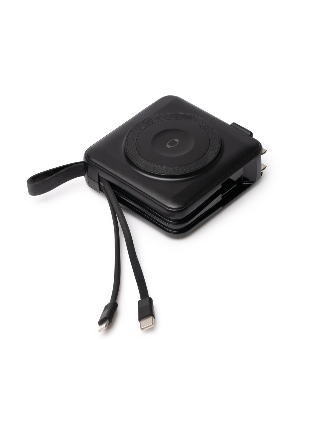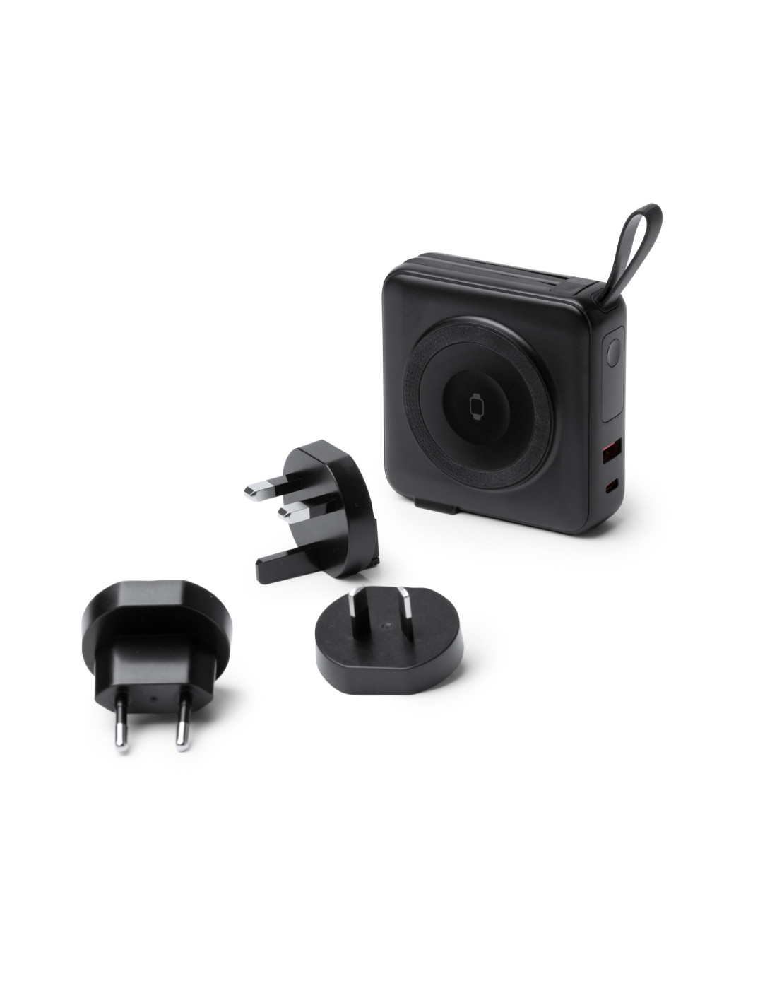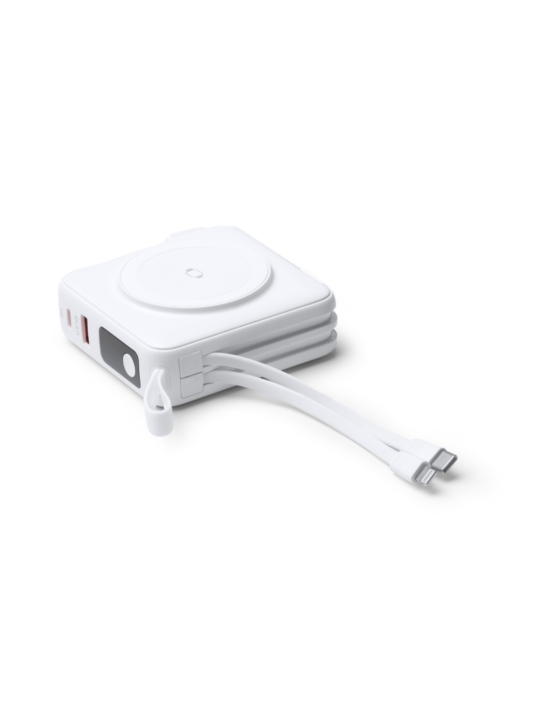 Batería externa inalámbrica 3 en 1 de 10.000 mAh con carga rápida, diseñada para ofrecer máxima funcionalidad en un solo dispositivo. Permite carga inalámbrica de hasta 15W para dispositivos compatibles con tecnología Qi y carga mediante cable de hasta 20W. Fabricada en ABS, incorpora base para carga inalámbrica, cables integrados USB C y Lightning ensamblados en el cuerpo, además de pantalla con indicador del porcentaje de batería. Incluye puertos de entrada y salida USB y USB C, así como adaptadores de corriente para para Europa, UK y Australia que permiten utilizarla también como cabezal de carga conectado a la red eléctrica. Dispone de anillo magnético, correa de silicona para facilitar su transporte y base trasera integrada que funciona como soporte para smartphone. Gracias a su diseño, permite cargar varios dispositivos al mismo tiempo. Sus dimensiones aproximadas son 8,3 x 8,3 x 3,15 cm.