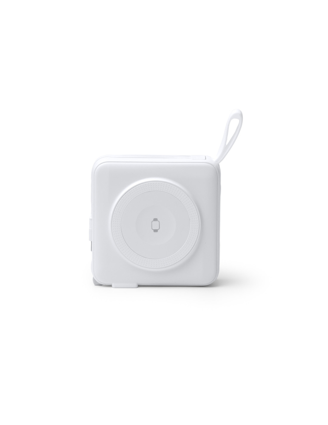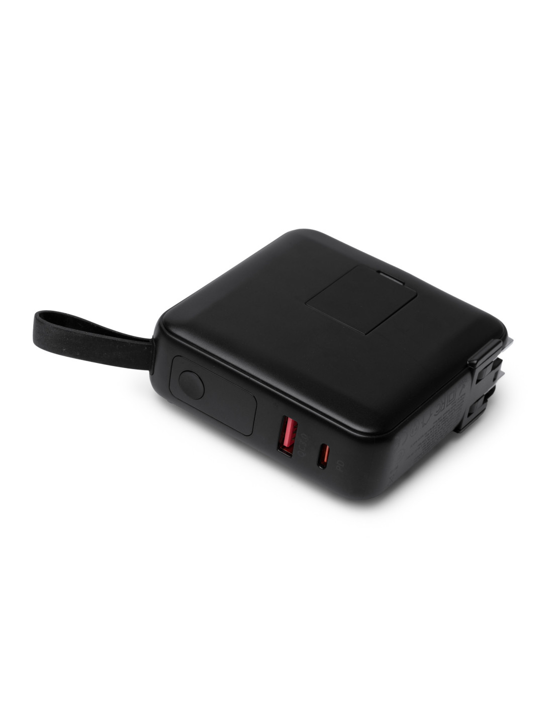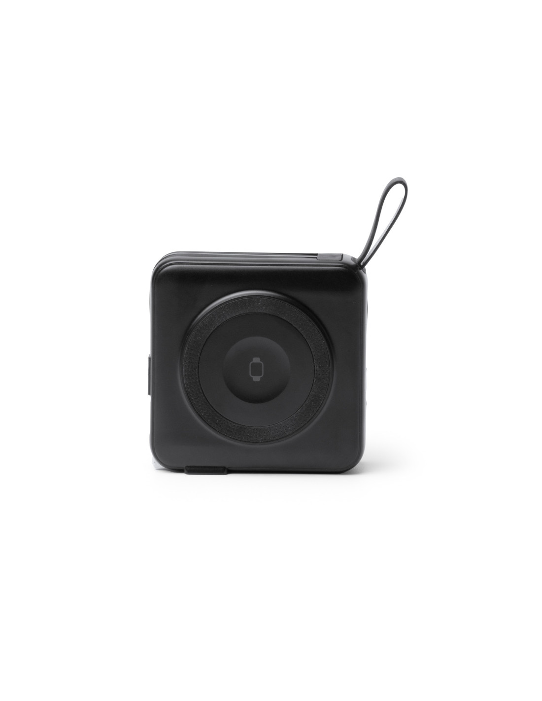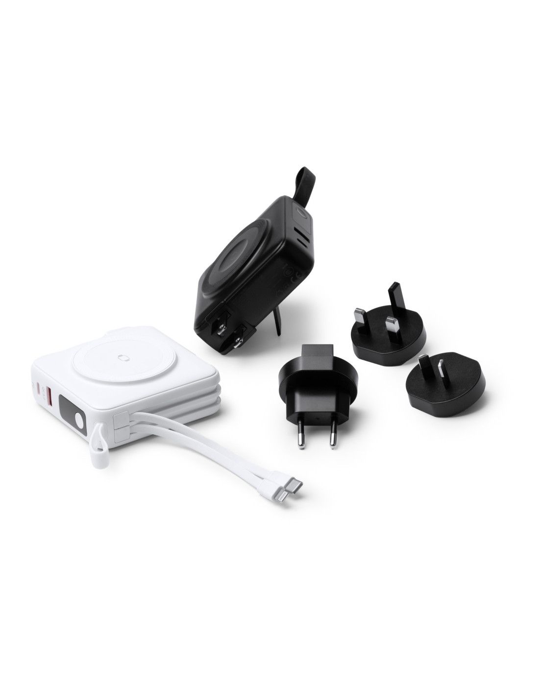 Batería externa inalámbrica 3 en 1 de 10.000 mAh con carga rápida, diseñada para ofrecer máxima funcionalidad en un solo dispositivo. Permite carga inalámbrica de hasta 15W para dispositivos compatibles con tecnología Qi y carga mediante cable de hasta 20W. Fabricada en ABS, incorpora base para carga inalámbrica, cables integrados USB C y Lightning ensamblados en el cuerpo, además de pantalla con indicador del porcentaje de batería. Incluye puertos de entrada y salida USB y USB C, así como adaptadores de corriente para para Europa, UK y Australia que permiten utilizarla también como cabezal de carga conectado a la red eléctrica. Dispone de anillo magnético, correa de silicona para facilitar su transporte y base trasera integrada que funciona como soporte para smartphone. Gracias a su diseño, permite cargar varios dispositivos al mismo tiempo. Sus dimensiones aproximadas son 8,3 x 8,3 x 3,15 cm.