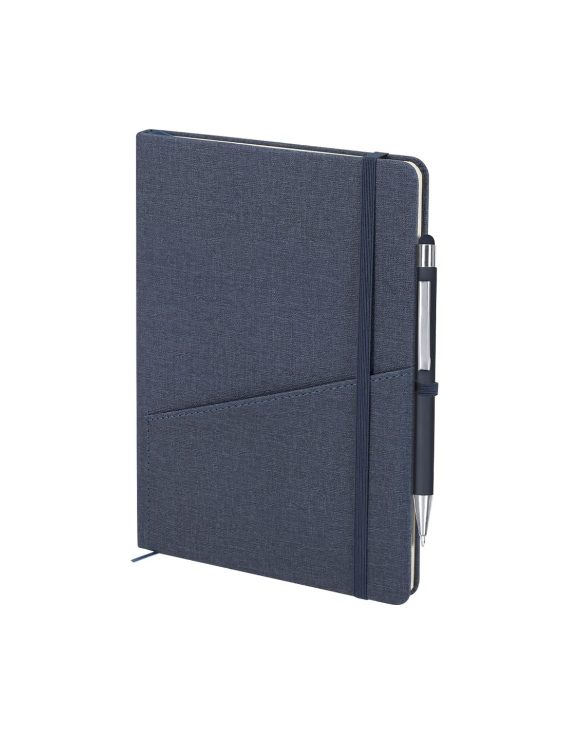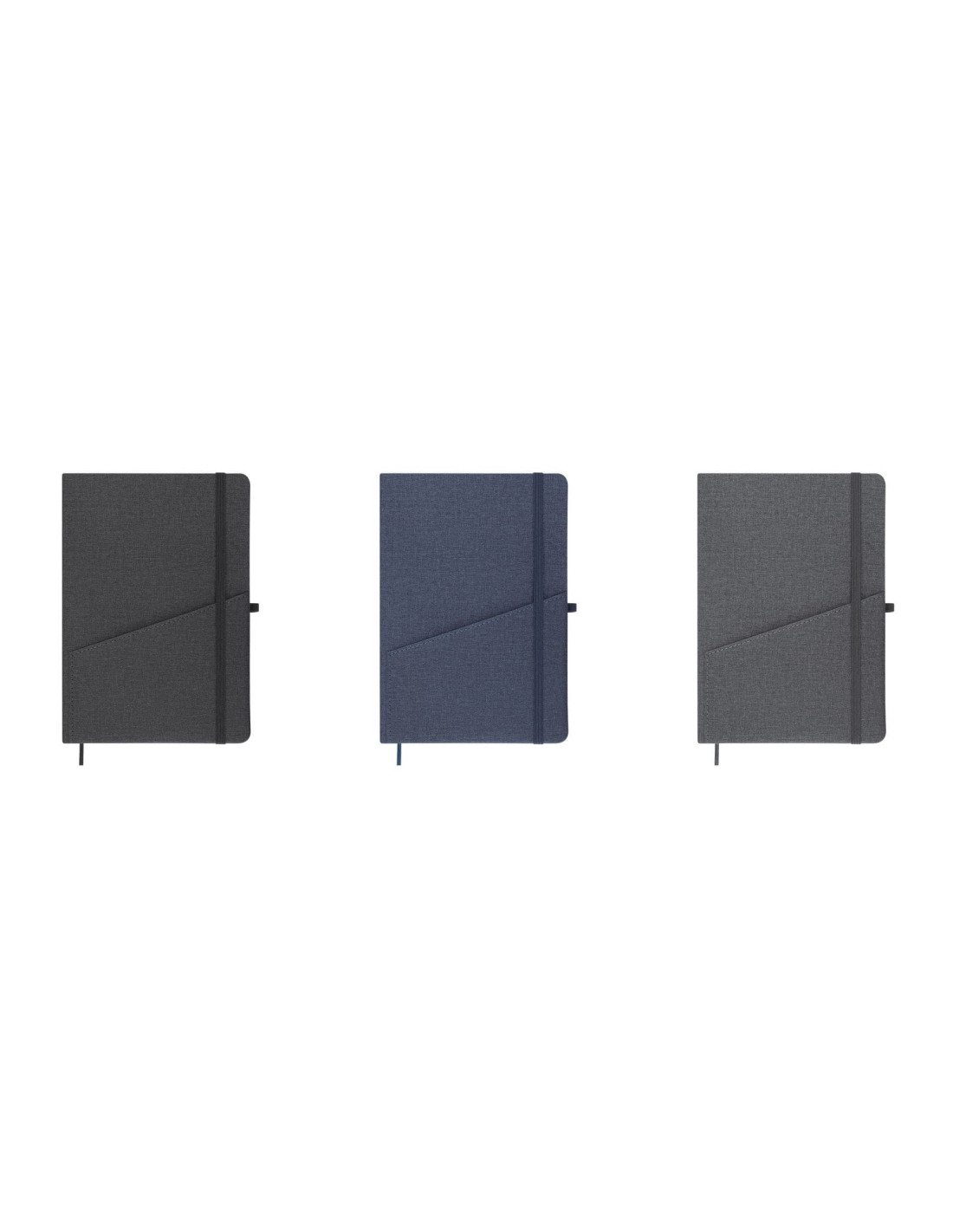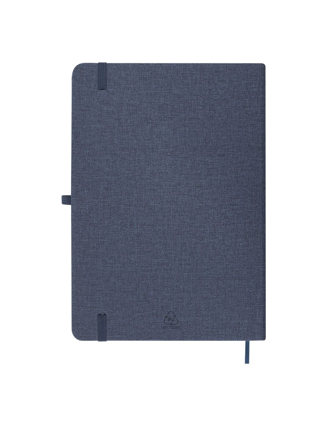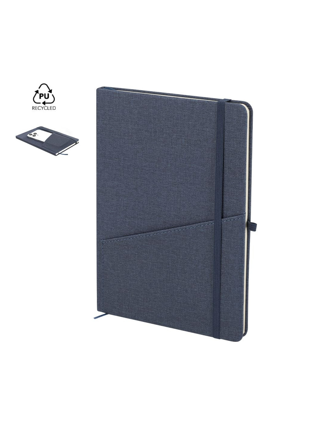 Bloc de notas con cubiertas rígidas elaborado en PU reciclada con acabado lino, un material sostenible que mantiene resistencia y elasticidad mientras reduce el impacto ambiental. Dispone de bolsillo frontal, soporte para bolígrafo, marcapáginas y cinta elástica de cierre a juego. Incluye 80 hojas en color crema con disposición a rayas, ideal para tomar notas y tener todo perfectamente organizado. Su diseño funcional hace de este bloc de notas un accesorio muy práctico, tanto para uso personal como profesional, aportando además un compromiso con la sostenibilidad al estar fabricado con material reciclado.