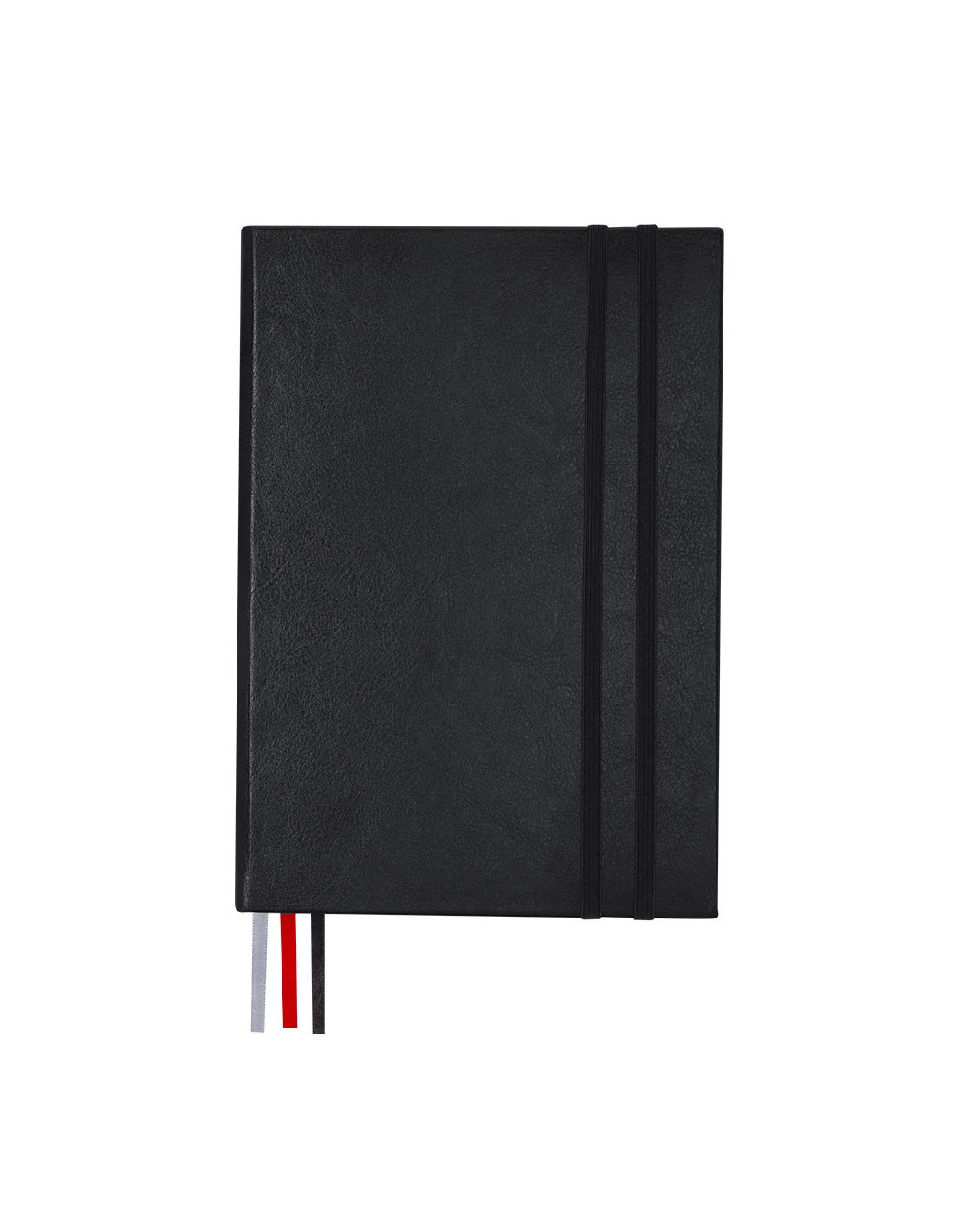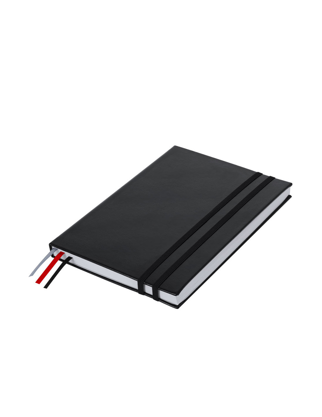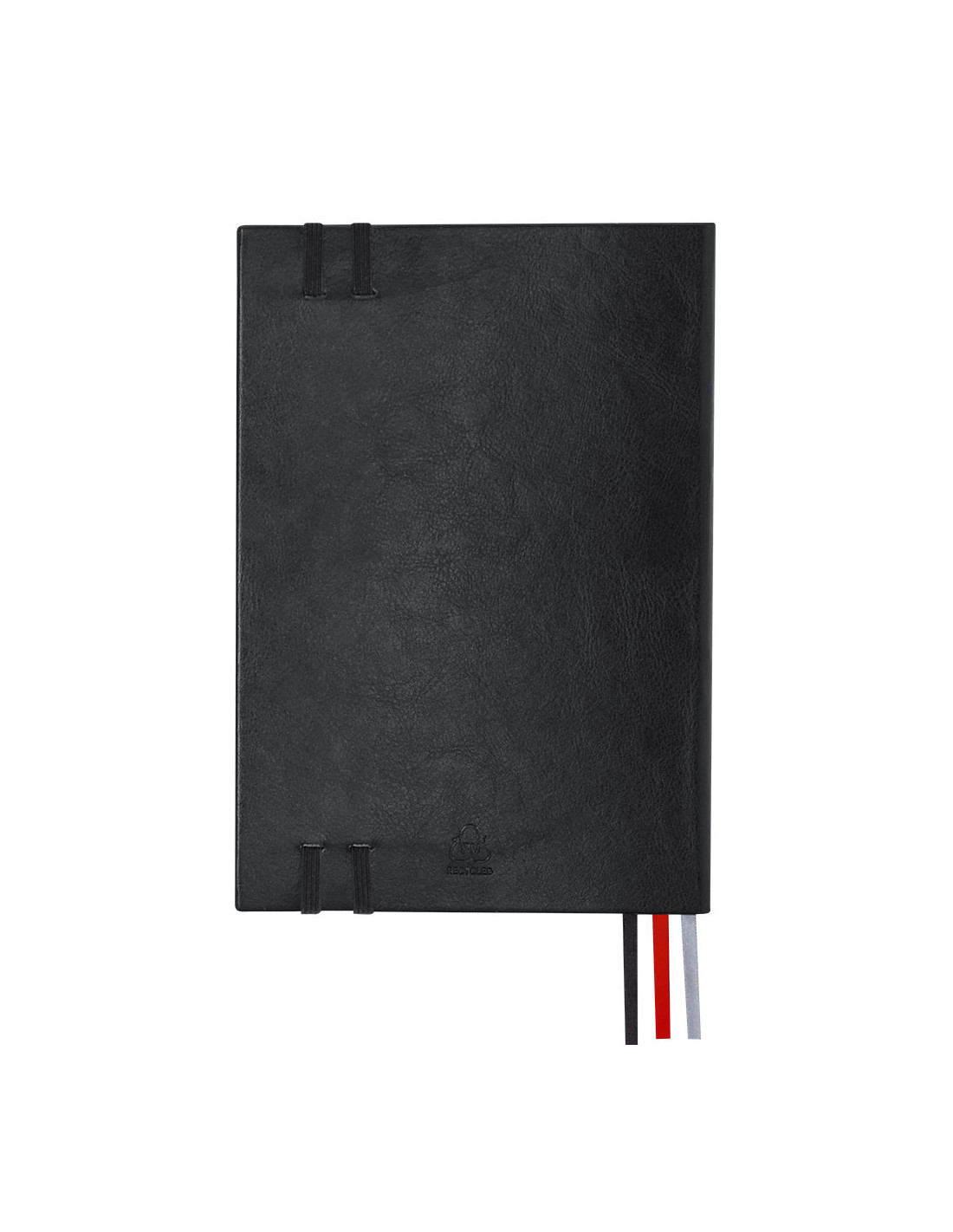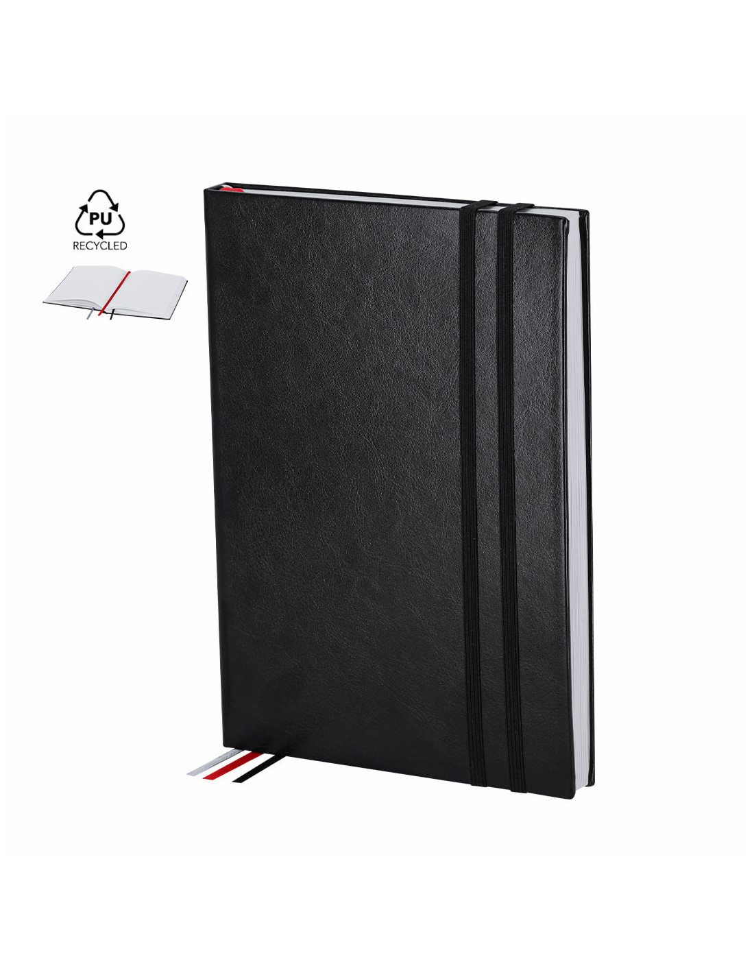 Bloc de notas tamaño A5 con cubiertas rígidas y suaves, elaborado en PU reciclada y RPET, combinando durabilidad y sostenibilidad. Cuenta con 128 hojas blancas a rayas, práctico bolsillo interior para notas sueltas y tres marcapáginas en cinta de colores (negro, rojo y gris) para una planificación diaria eficaz. Incluye doble cinta elástica de cierre a juego y distintivo de PU reciclado, destacando por su resistencia y elasticidad. Ideal para llevar un diario, organizar el día a día o utilizar como bloc de notas en la oficina o en eventos promocionales. Medidas: 21,2 x 14,6 x 2 cm.