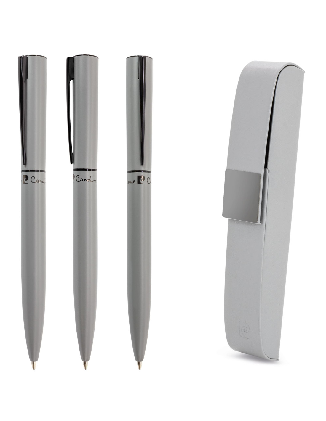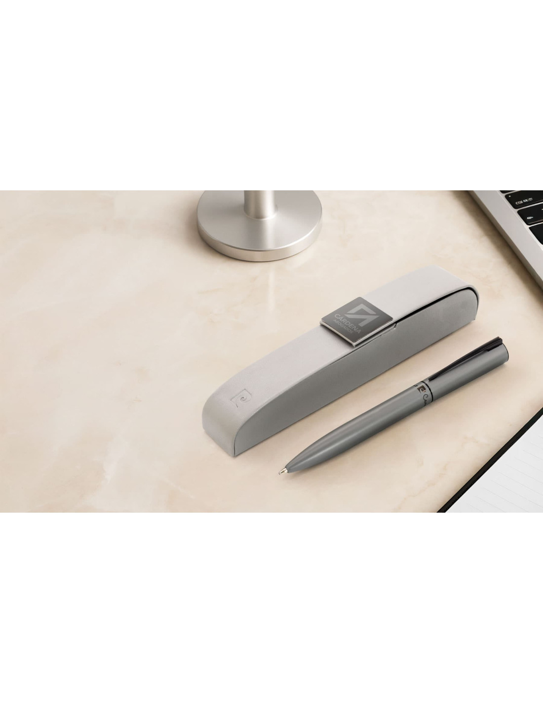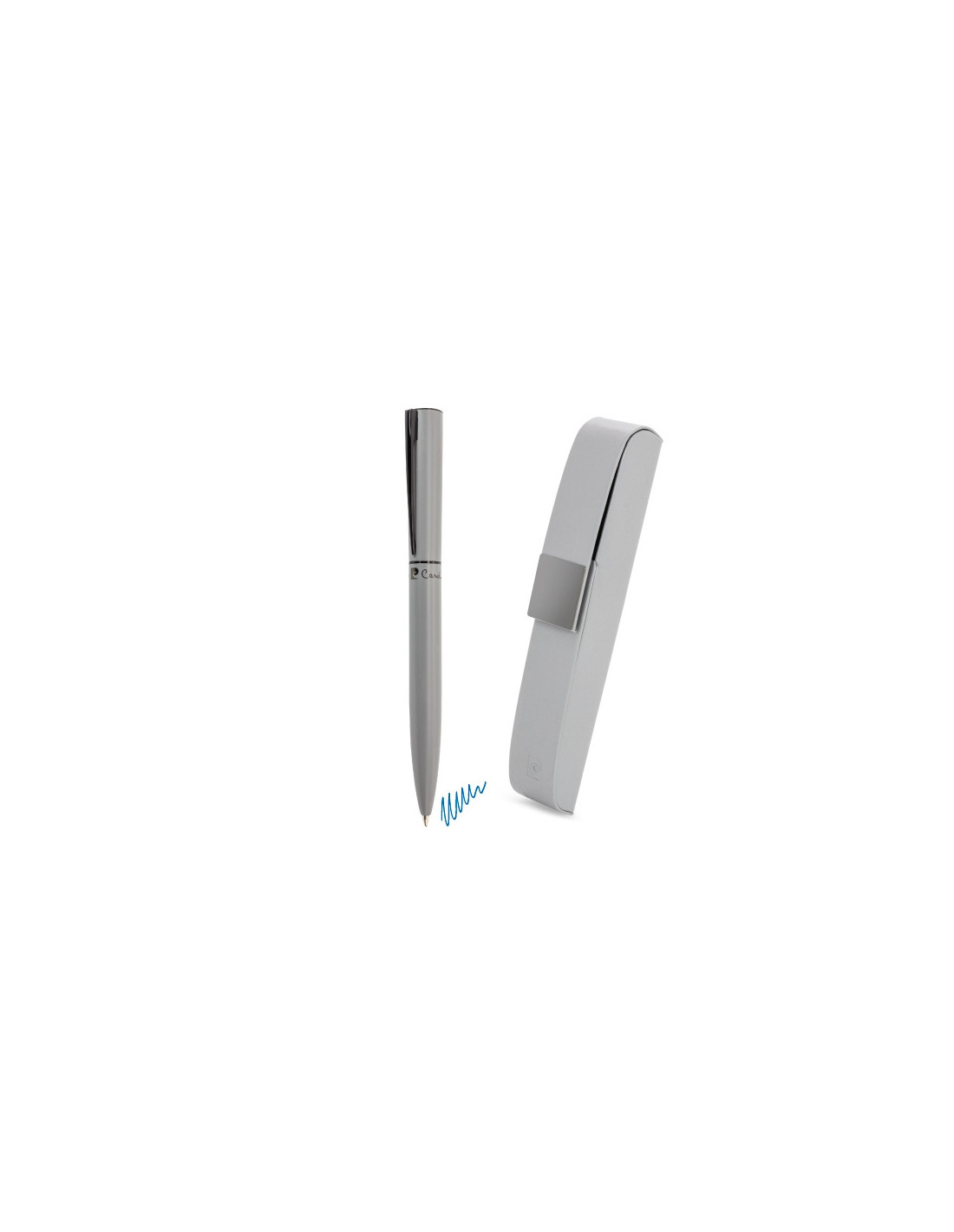 Bolígrafo Pierre Cardin modelo AMG, fabricado en aluminio y diseñado para ofrecer una escritura cómoda en color azul. Su acabado metálico en color gris con detalles en negro en el clip y el cuerpo, transmite una imagen profesional, ideal como detalle de empresa personalizado. El bolígrafo viene además con estuche con cierre imantado de 2,2 x 16 cm, que mejora su presentación y aporta mayor comodidad. Una opción práctica para regalos corporativos o personalizados.