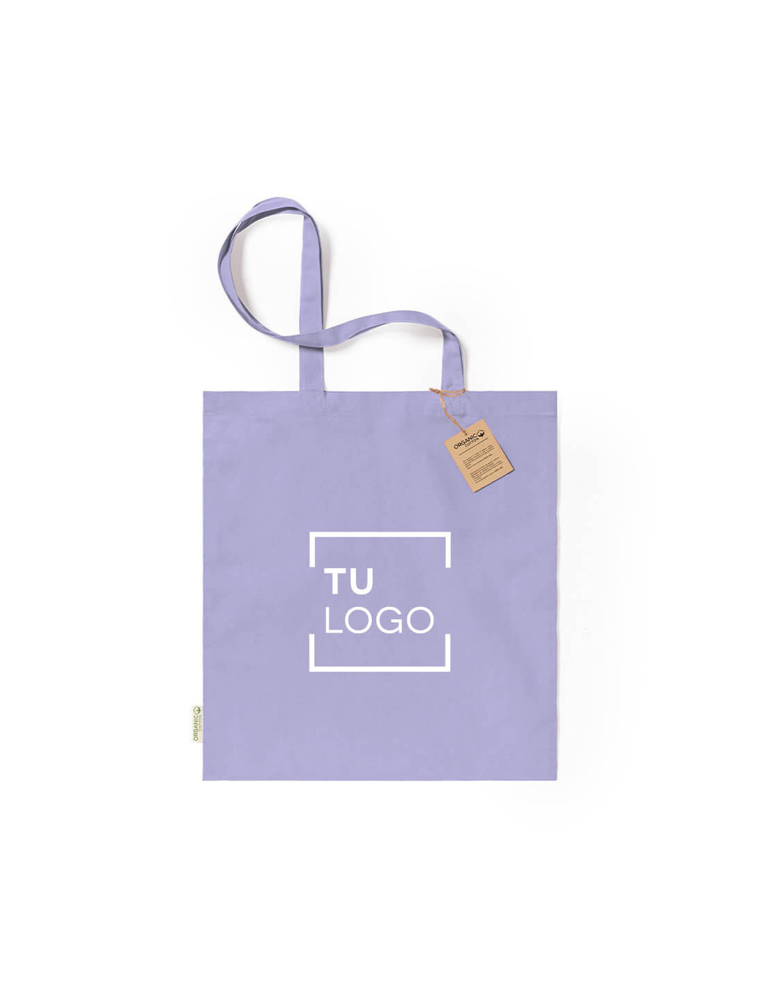 Bolsa de algodón orgánico de colores con certificado GOTS y asas de 70 cm. Bolsas hechas de fibras orgánicas con resistencia de hasta 8 kg. Etiqueta distintiva de algodón orgánico y hangtag en cartón reciclado. Bolsa de 140 g/m2. Medida: 38 x 42 cm.