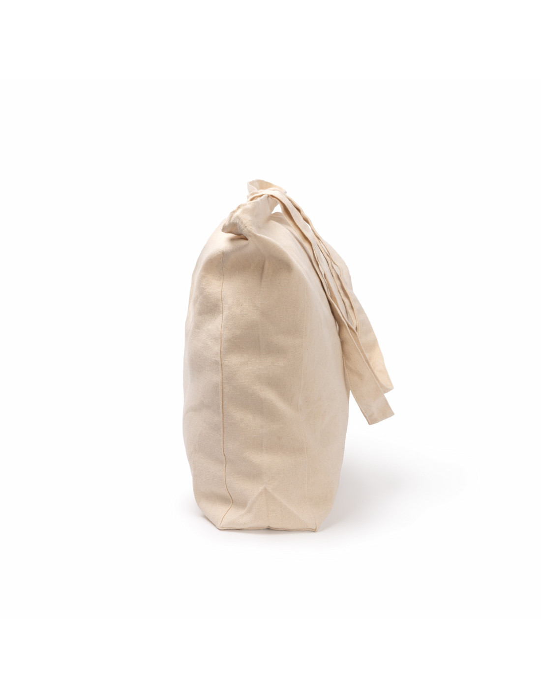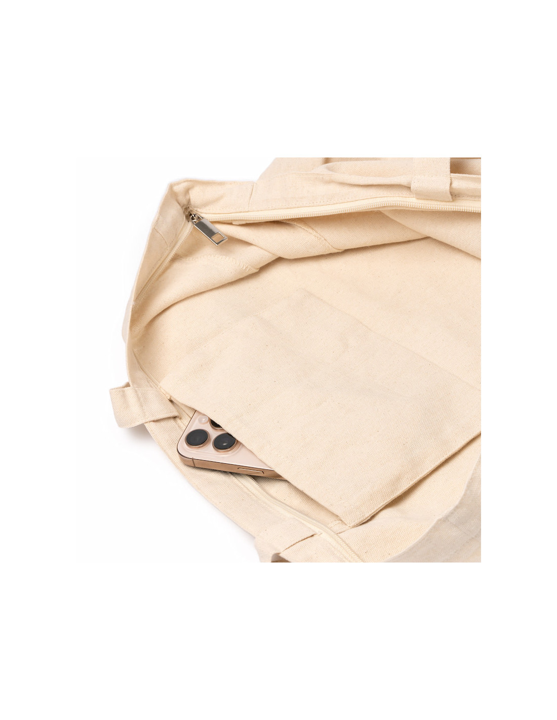 Bolsa de 100% algodón de 230 g/m² con fuelle en base y laterales, diseñada para ofrecer mayor capacidad y adaptabilidad a su contenido. Incorpora cierre de cremallera en la parte superior que aporta seguridad en el transporte, junto con un práctico bolsillo interno para organizar objetos personales. Sus asas largas de 70 cm permiten llevarla cómodamente al hombro. Con unas dimensiones aproximadas de 45 x 38 x 10 cm, es una opción resistente, funcional y versátil, ideal para compras, trabajo o uso diario.