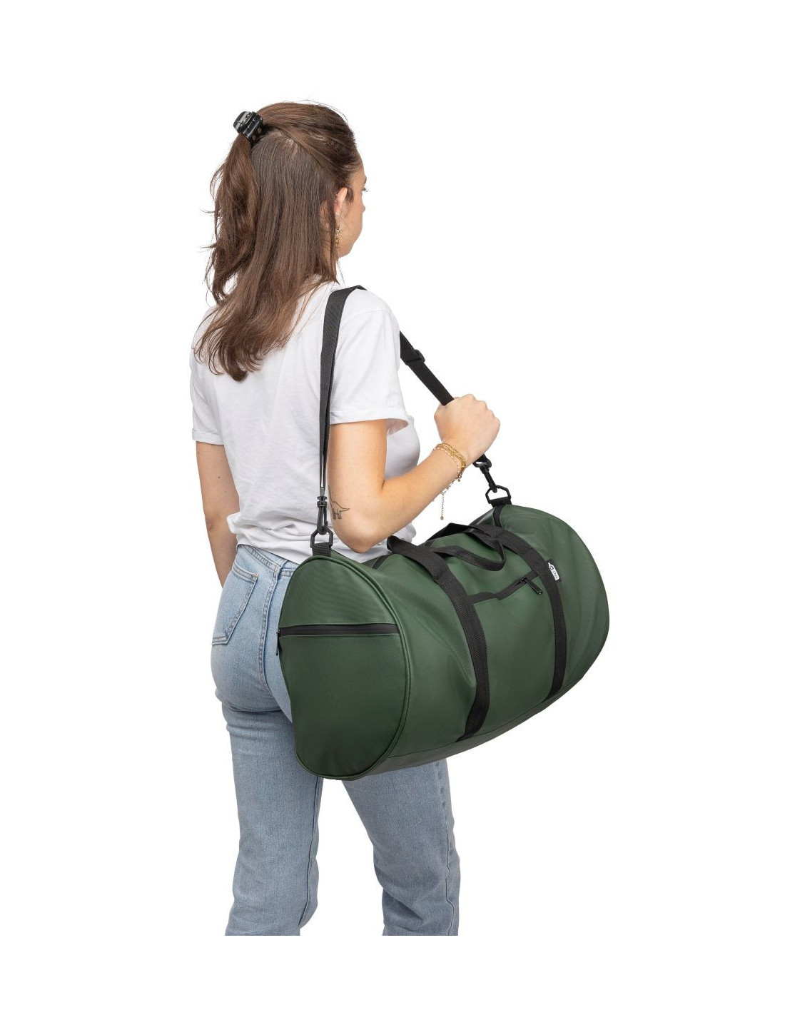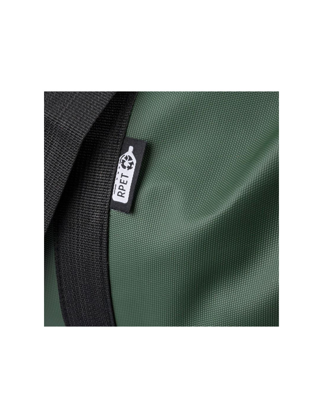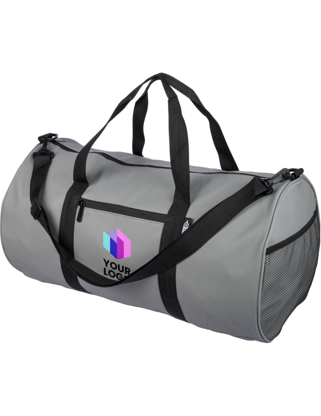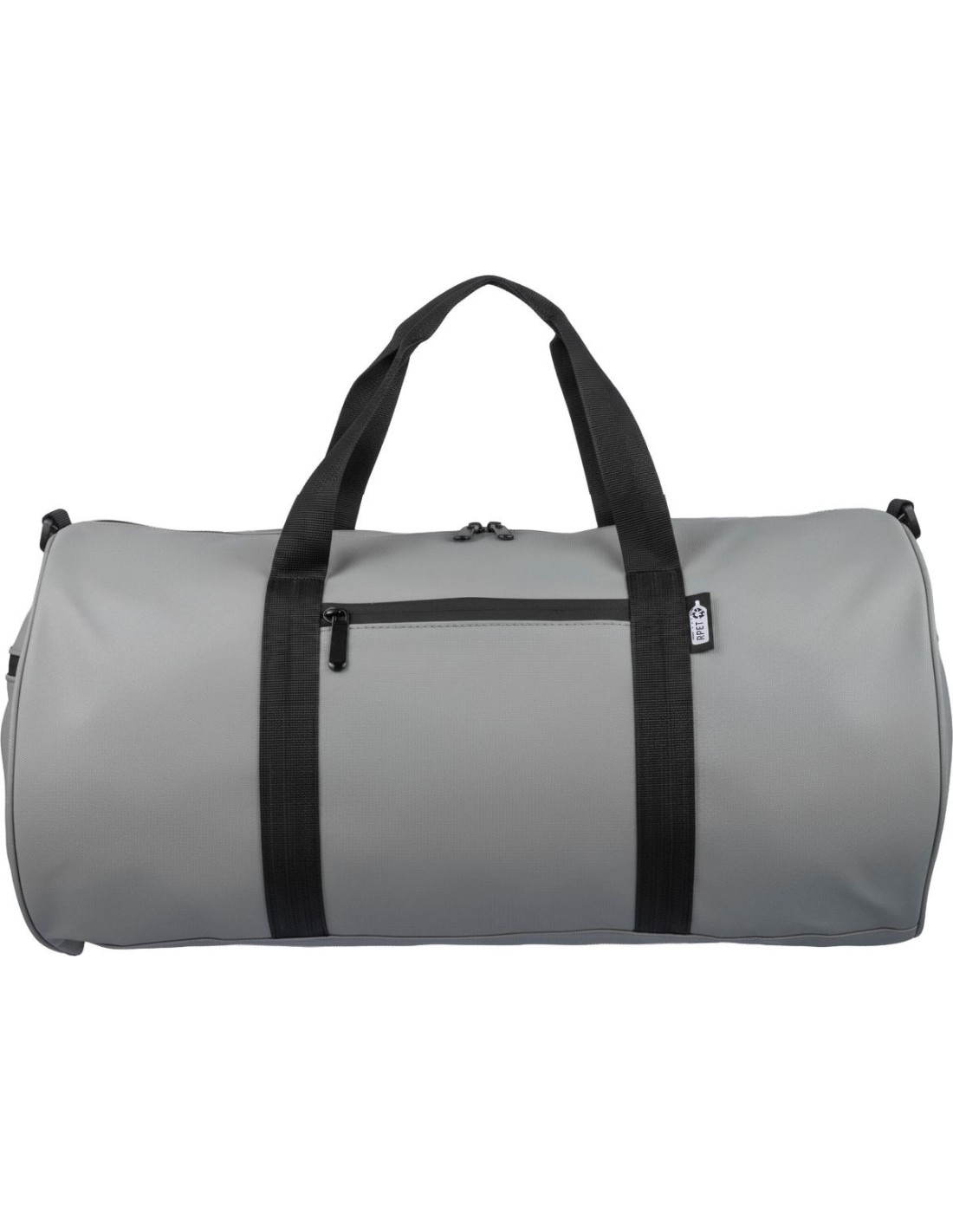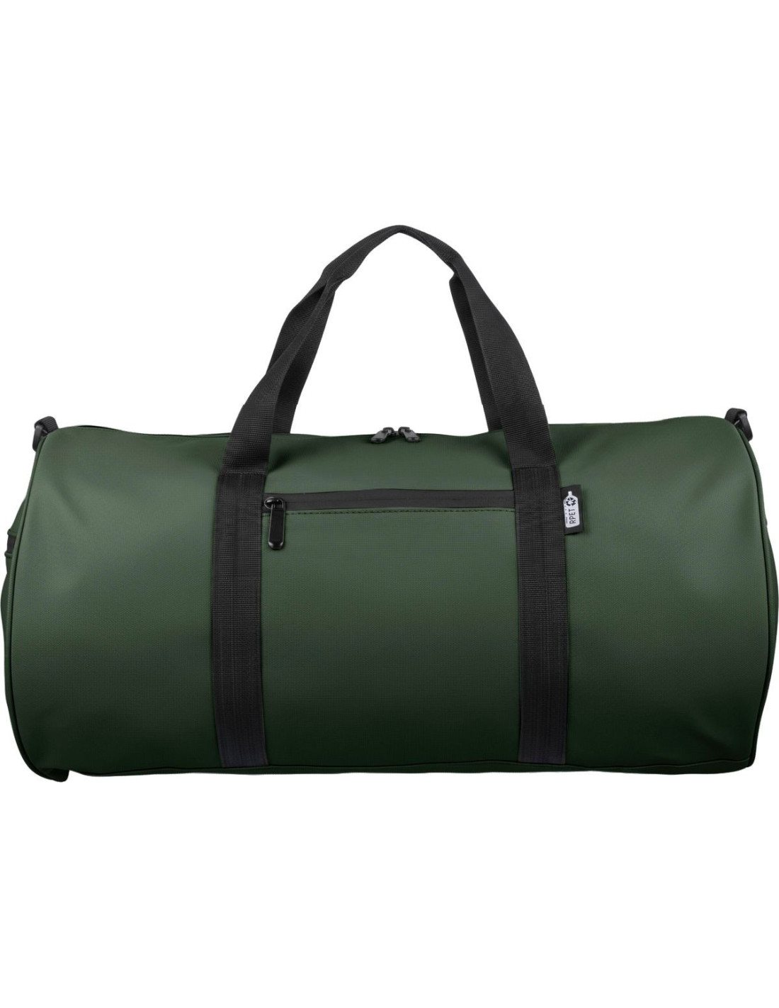 Bolsa de deporte personalizada fabricada en rPET a partir de poliéster 600D, con forro interior 210D y revestimiento de PU resistente al agua, diseñada para un uso intensivo tanto en viajes cortos como en actividades deportivas. Dispone de un amplio compartimento principal con cierre de cremallera que permite transportar ropa, calzado o accesorios con comodidad, además de un bolsillo delantero con cremallera de acabado decorativo y un práctico bolsillo lateral de malla para objetos de acceso rápido. Incorpora dos asas de mano reforzadas y una cinta de hombro ajustable para facilitar el transporte, ofreciendo una capacidad aproximada de 40 litros. Incluye etiqueta exterior rPET que refuerza su carácter sostenible, siendo una opción adecuada como bolsa deportiva personalizada o bolsa de viaje promocional para empresas comprometidas con el medio ambiente.