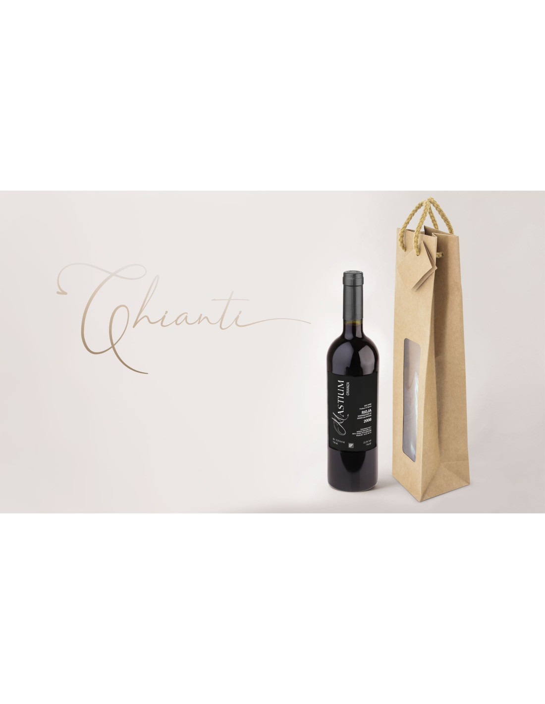 Bolsa fabricada en papel Kraft reciclado para botella de vino con ventana transparente y asas de algodón marrones. Contiene una tarjeta para escribir también de papel kraft de 150 gr/m2.