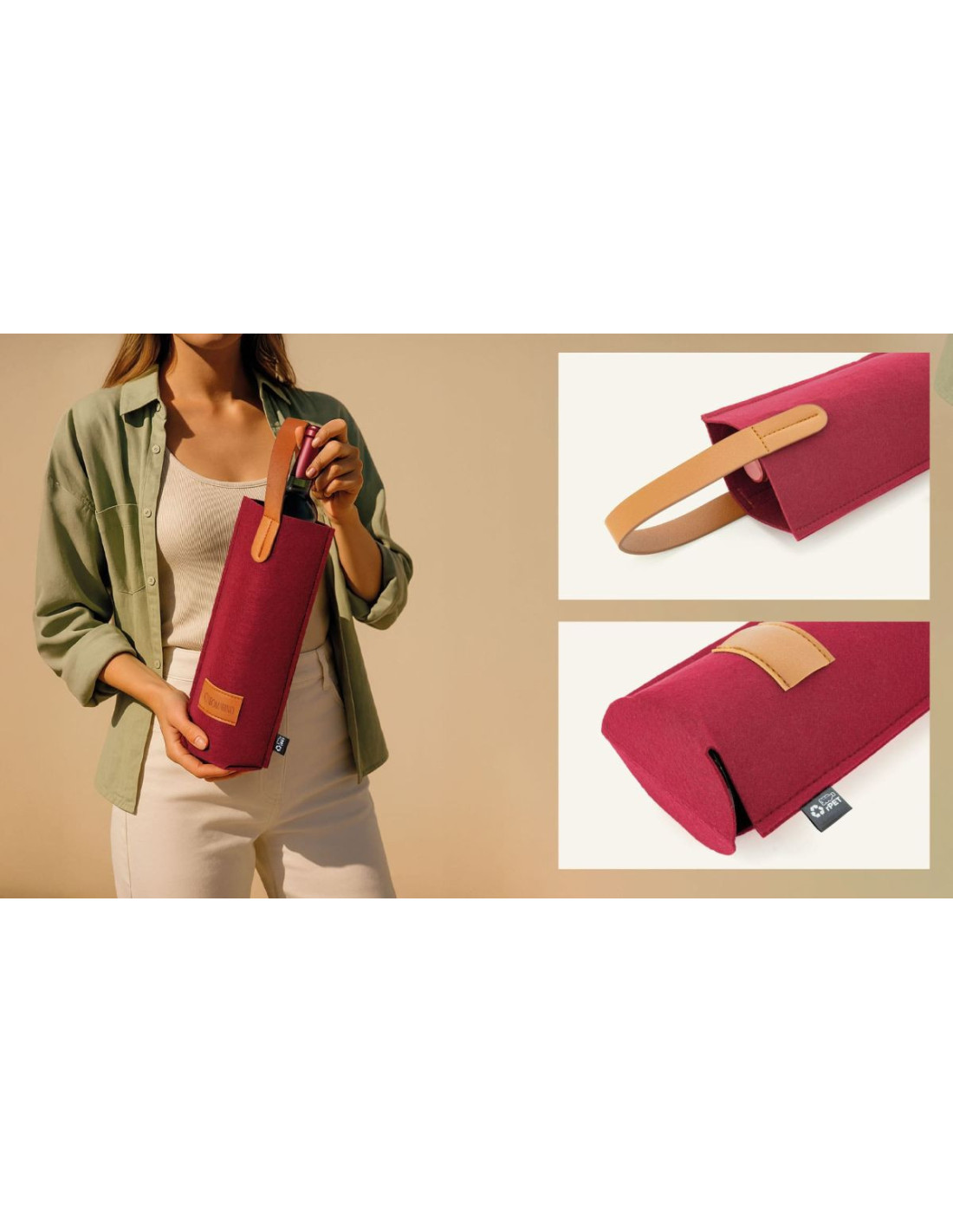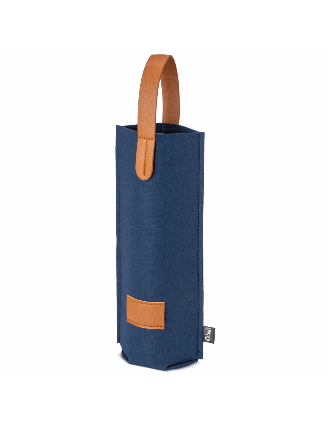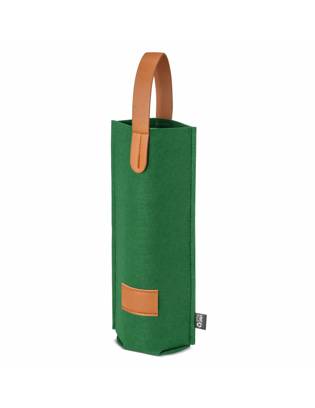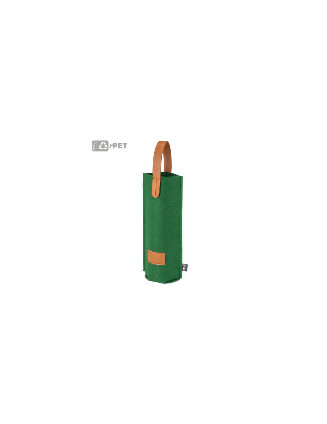 Bolsa para botellas de vino fabricada en fieltro RPET con detalles en PU marrón y asa reforzada de 35 x 2,5 cm. Con un diseño moderno y funcional, es una opción práctica para presentar botellas en regalos de empresa o eventos corporativos. Dispone de una etiqueta de 5,5 x 3 cm para personalización. Disponible en varios colores: negro, marino, burdeos y verde. Elaborada con materiales reciclados hace de la sostenibilidad su punto a destacar.