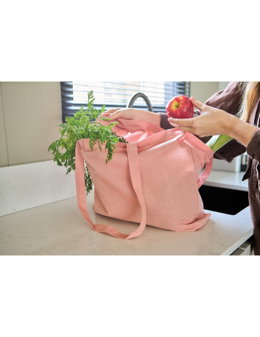 La bolsa tote de algodón Tarin es una opción cómoda para el uso diario y una excelente alternativa como regalo promocional reutilizable. Está fabricada en algodón de 140 g/m² e incorpora un refuerzo inferior de 10 cm, pensado para ofrecer más espacio y estabilidad al llevarla llena. Sus asas largas de 70 cm permiten colgarla fácilmente al hombro. Como detalle diferenciador, incluye un botón en tonos pastel en los modelos verde, naranja, azul y violeta. Además, cuenta con la certificación OEKO-TEX® STANDARD 100, que garantiza que el tejido ha sido testado y está libre de sustancias nocivas para la piel.