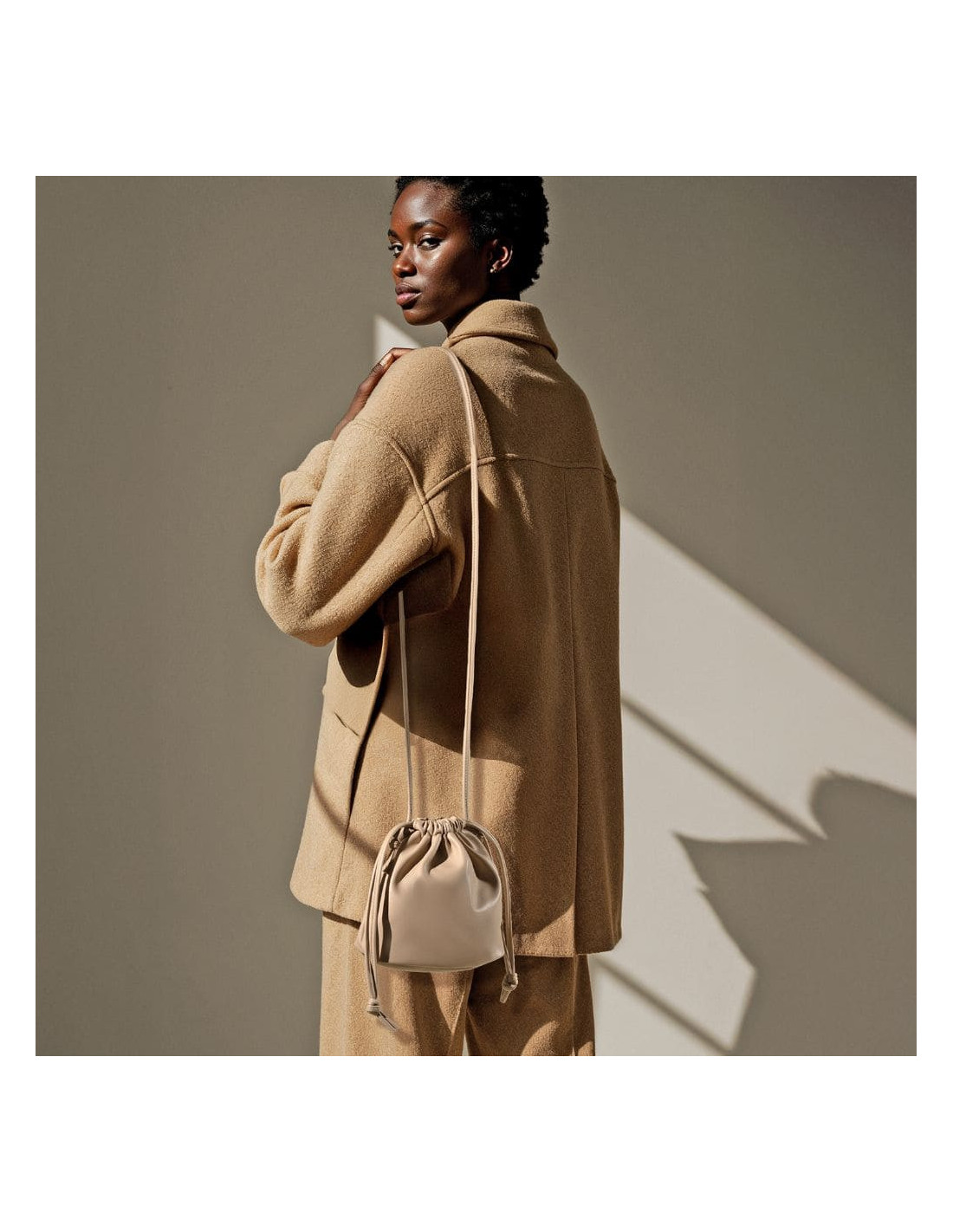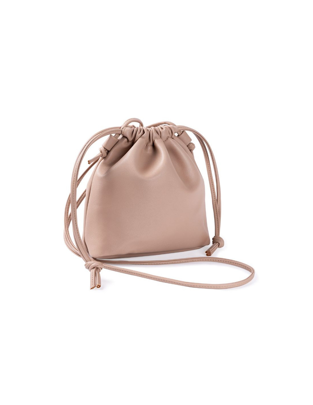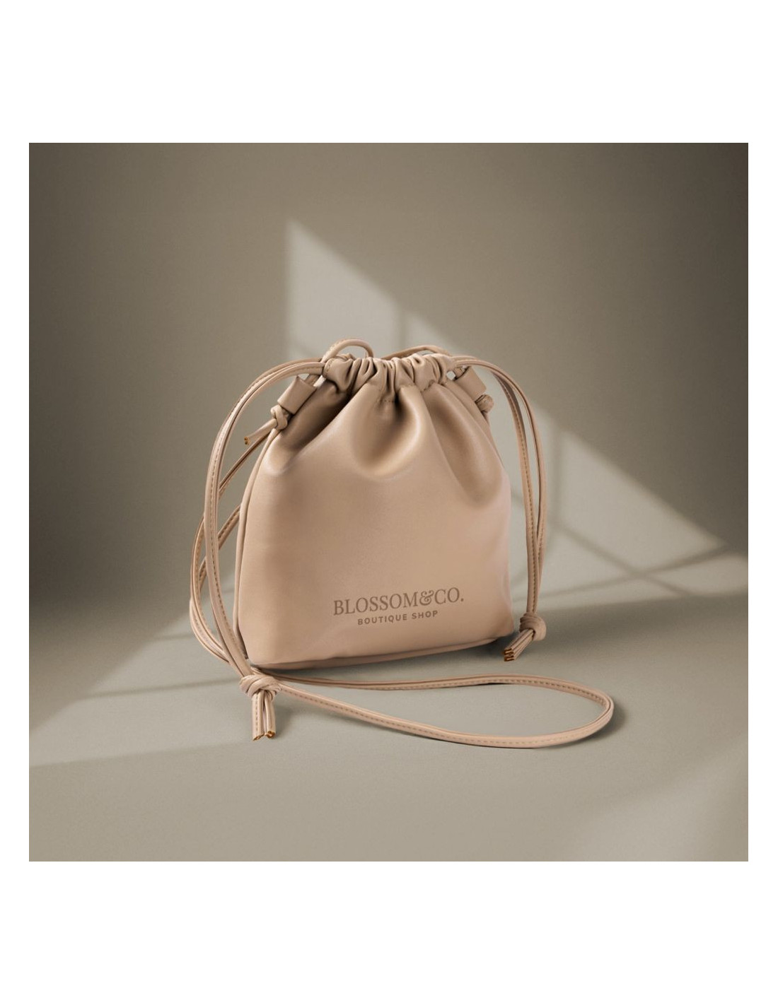 Bolso para colgar con cierre de cordón, fabricado en polipiel con acabado suave. Su diseño compacto de 21 × 9 × 24 cm incluye un bolsillo interior para organizar objetos pequeños. Un accesorio práctico para el día a día, ideal para looks informales o como detalle promocional con un estilo moderno. Disponible en color visón y negro, combina elegancia y funcionalidad en un formato ligero y fácil de llevar.