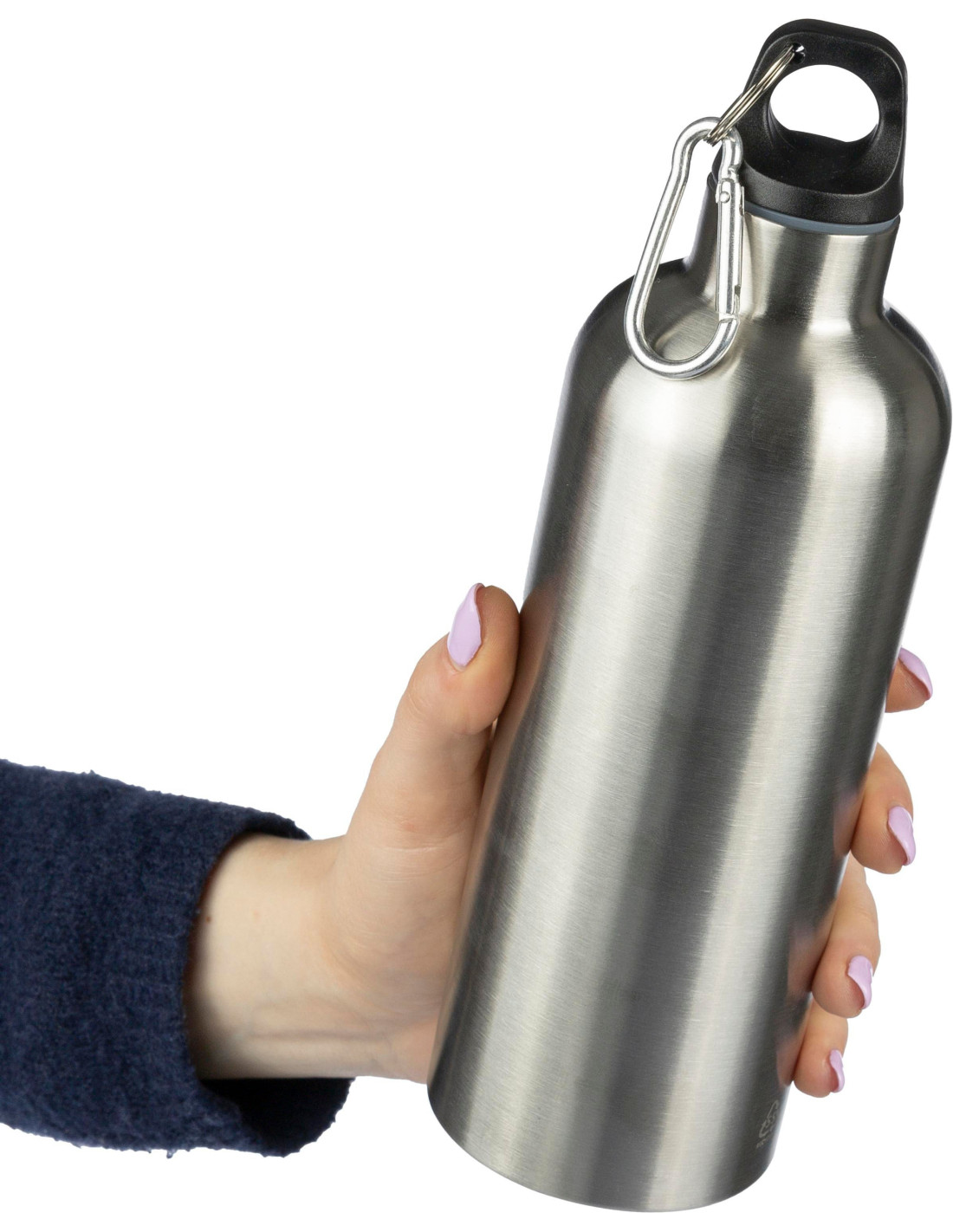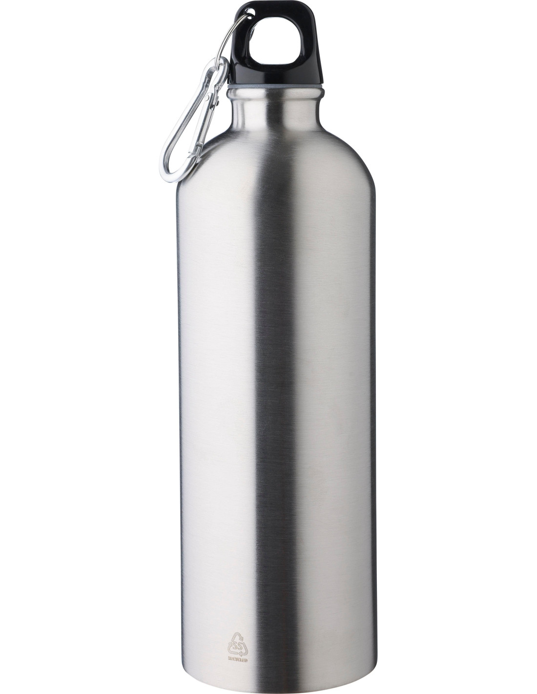 La botella de acero inoxidable reciclado personalizada es una opción sostenible y funcional dentro de las botellas personalizadas de acero inoxidable para empresas comprometidas con el medio ambiente. Fabricada en acero inoxidable reciclado s/s304, combina resistencia, ligereza y un diseño práctico para el uso diario. Cuenta con una capacidad de 750 ml, tapa de PP y un mosquetón de aluminio plateado, lo que facilita su transporte en mochilas, bolsos o durante actividades al aire libre. Incorpora un logotipo grabado a láser que certifica el uso de material reciclado, reforzando el mensaje ecológico de tu marca. Es una botella de pared simple, con tapón antifugas y muy ligera, con un peso de solo 142 g, ideal como regalo publicitario para eventos, campañas promocionales o acciones de merchandising sostenible. Se recomienda no utilizar con bebidas ácidas o con gas para mantener sus propiedades en perfecto estado.
