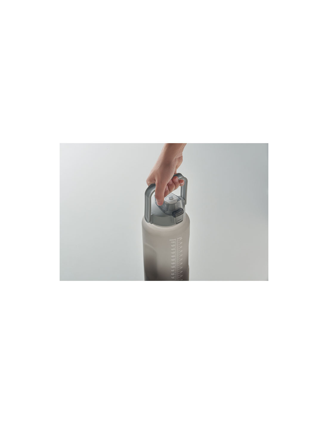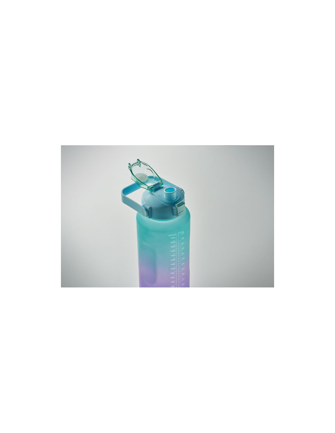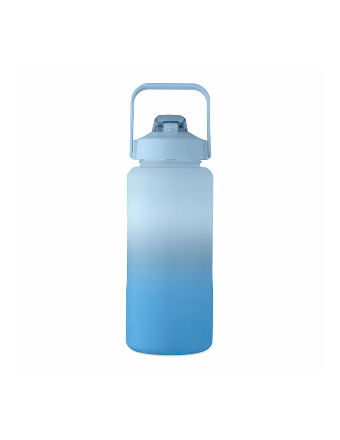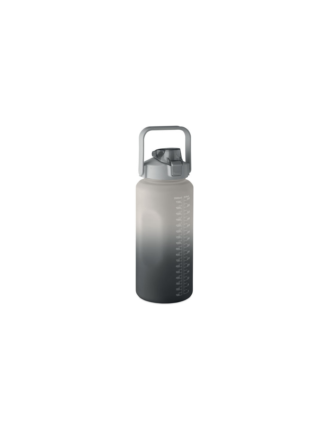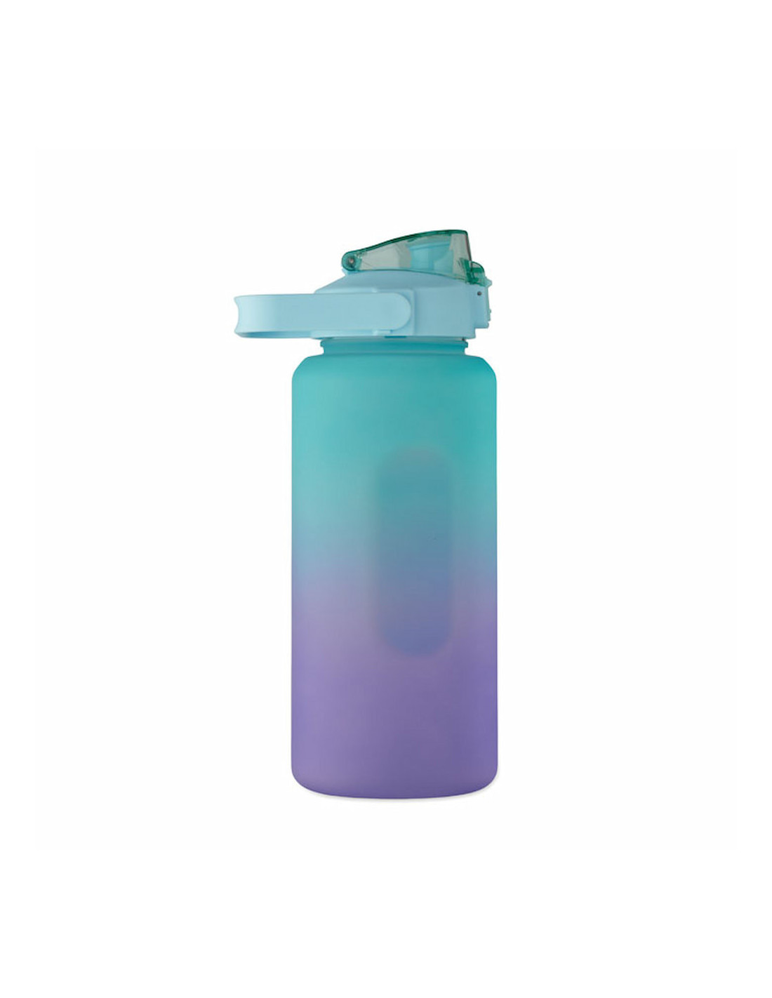 Botella de agua motivacional fabricada en RPET, diseñada para fomentar la hidratación diaria de manera práctica y sostenible. Cuenta con tapa abatible que se abre con una sola mano, pajita integrada, cierre de seguridad y asa para un transporte cómodo. Su sistema anti fugas garantiza que puedas llevarla a cualquier lugar sin preocuparte por derrames. Con una amplia capacidad de 2000 ml, es ideal para el gimnasio, actividades al aire libre, oficina o viajes. Elaborada en RPET, contribuye a la reutilización de residuos plásticos y a la sostenibilidad del planeta. Medidas: 11 x 30 cm.