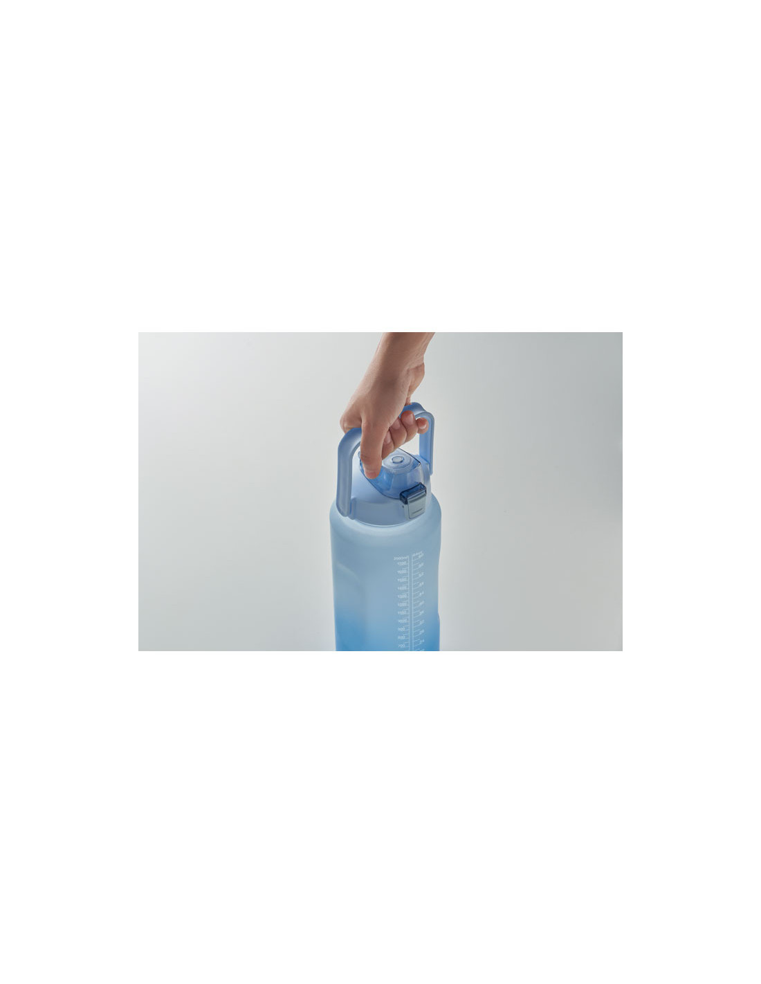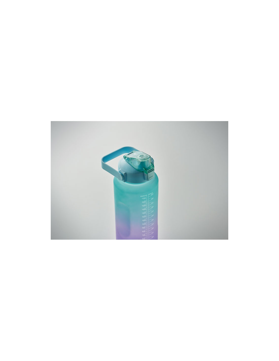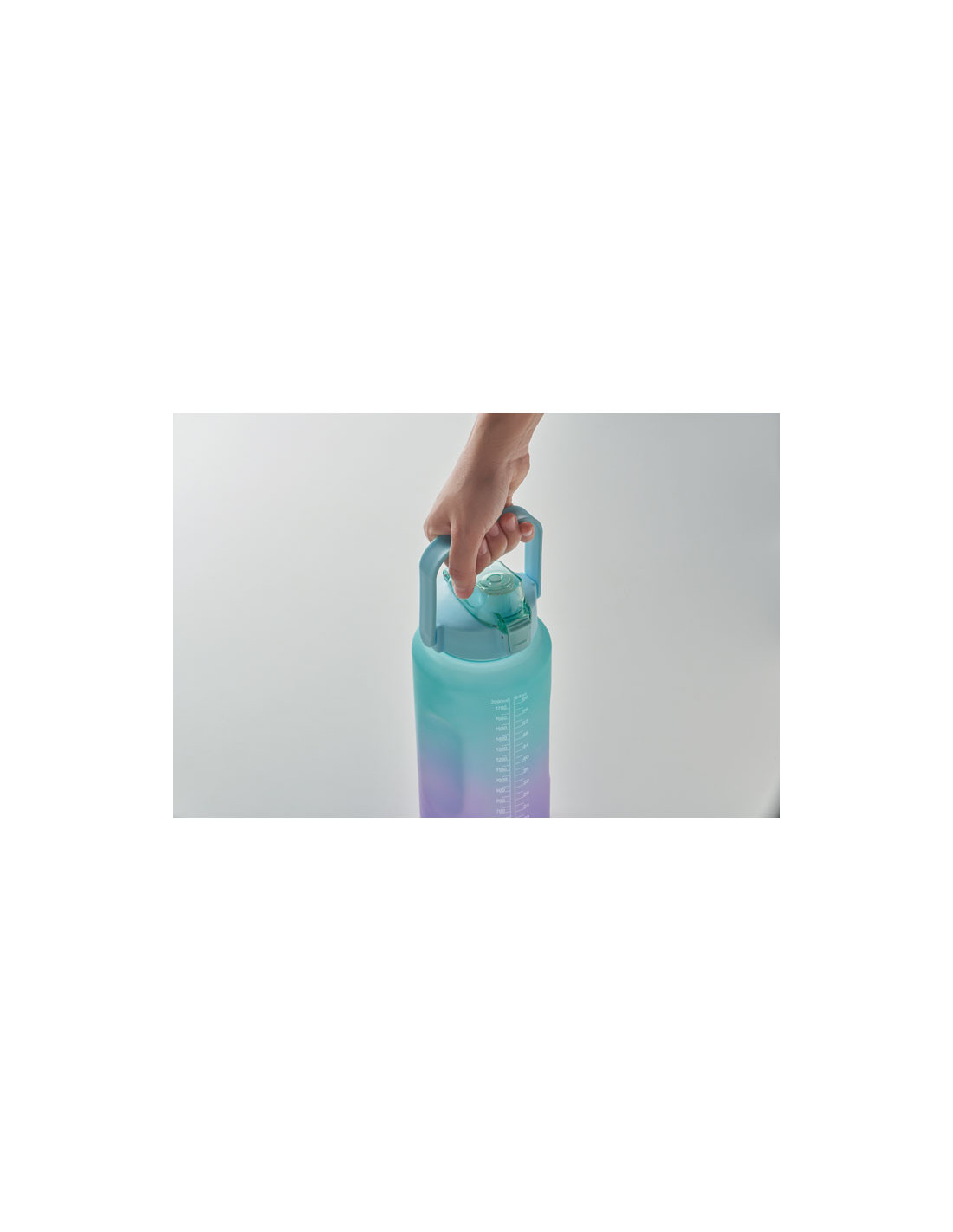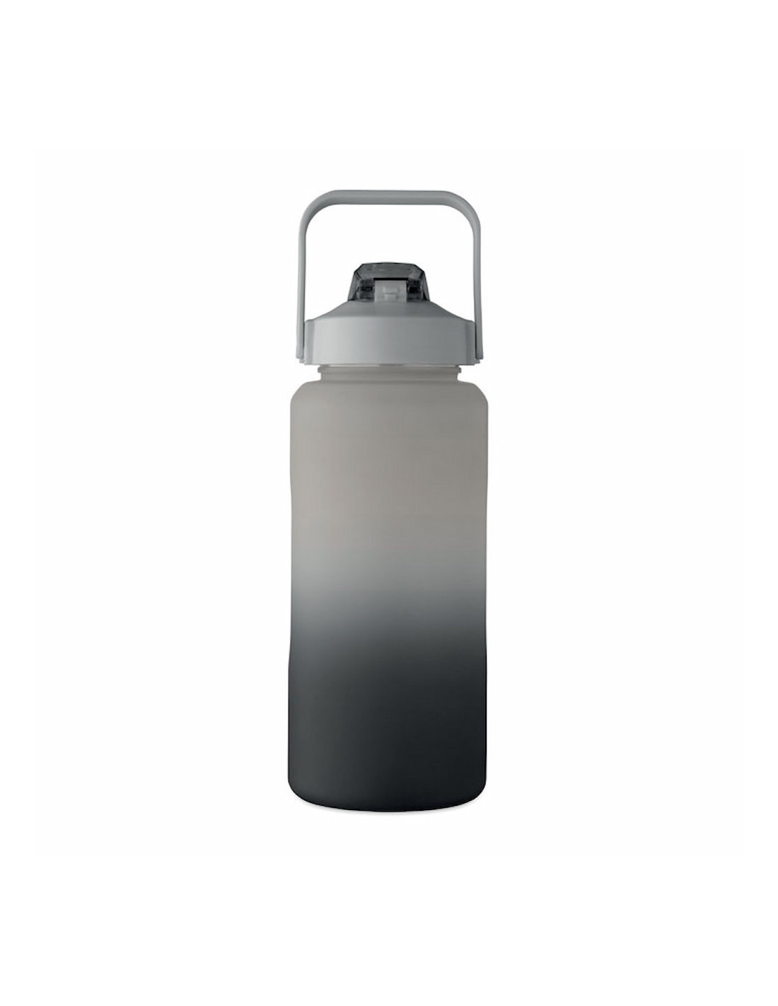 Botella de agua motivacional fabricada en RPET, diseñada para fomentar la hidratación diaria de manera práctica y sostenible. Cuenta con tapa abatible que se abre con una sola mano, pajita integrada, cierre de seguridad y asa para un transporte cómodo. Su sistema anti fugas garantiza que puedas llevarla a cualquier lugar sin preocuparte por derrames. Con una amplia capacidad de 2000 ml, es ideal para el gimnasio, actividades al aire libre, oficina o viajes. Elaborada en RPET, contribuye a la reutilización de residuos plásticos y a la sostenibilidad del planeta. Medidas: 11 x 30 cm.