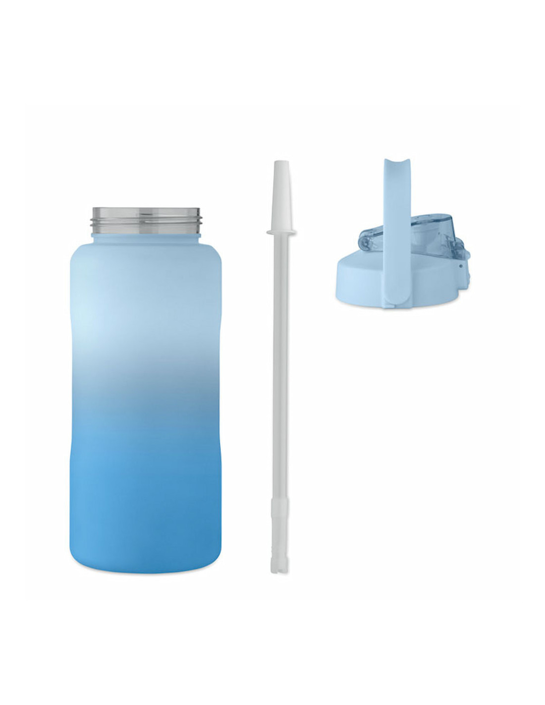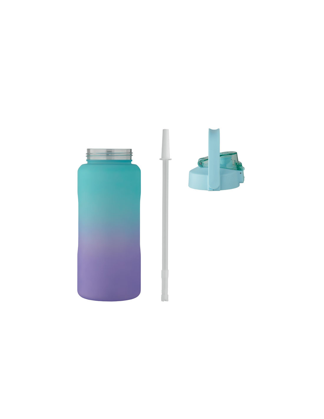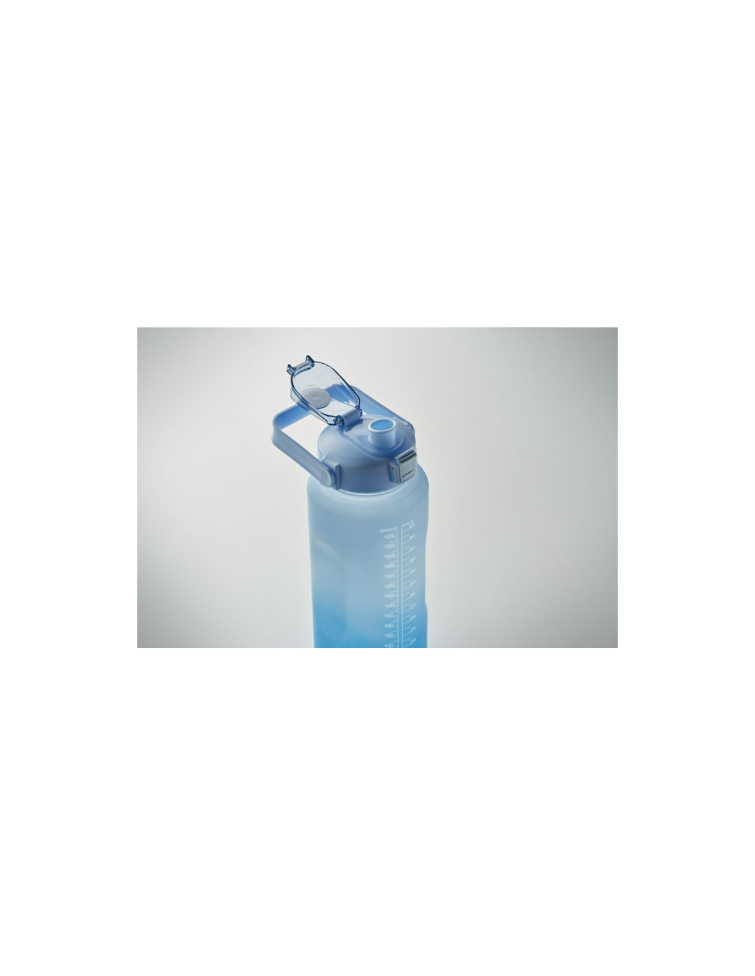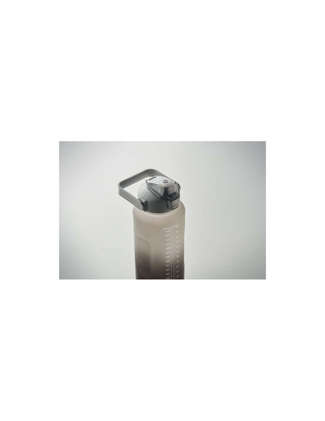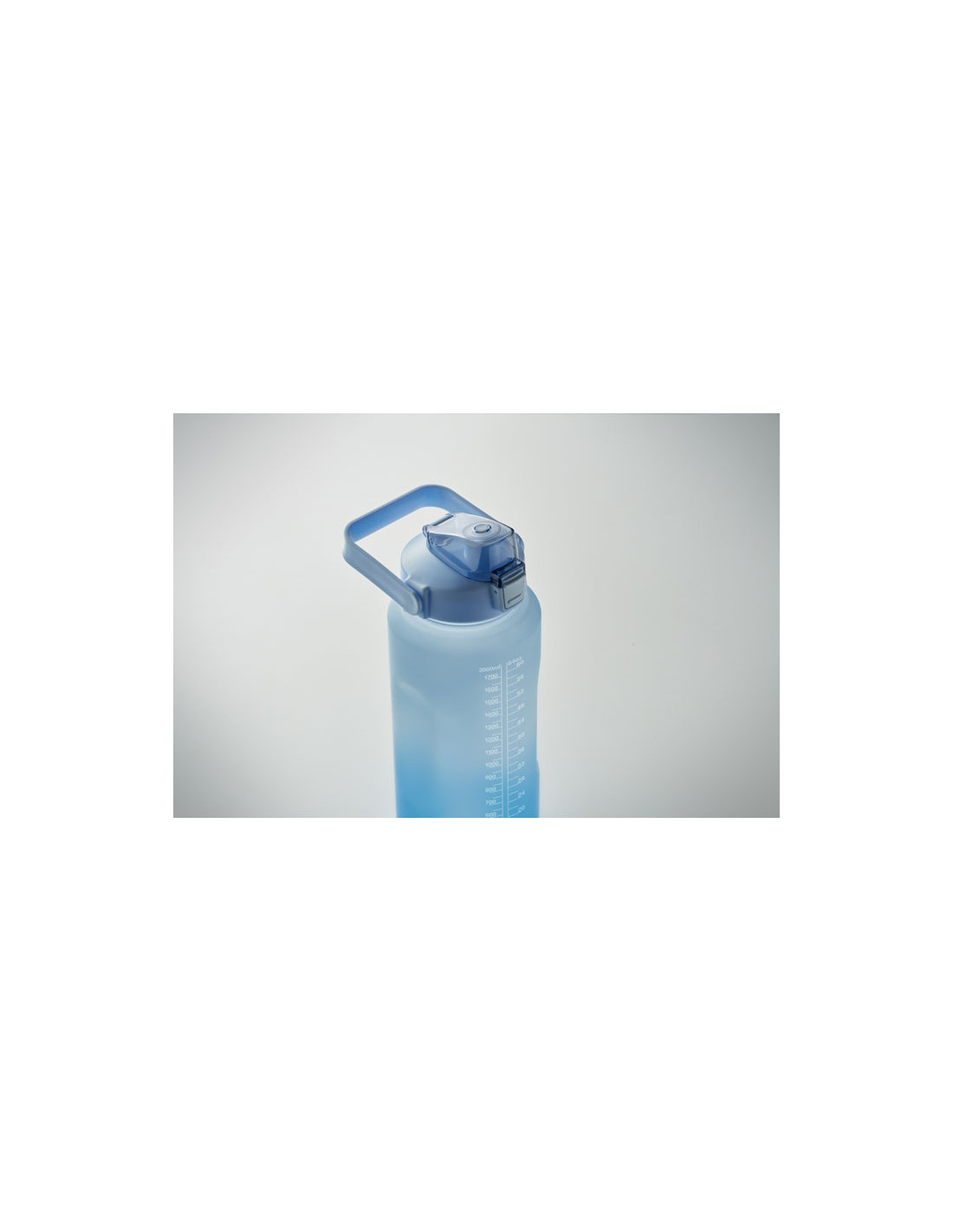 Botella de agua motivacional fabricada en RPET, diseñada para fomentar la hidratación diaria de manera práctica y sostenible. Cuenta con tapa abatible que se abre con una sola mano, pajita integrada, cierre de seguridad y asa para un transporte cómodo. Su sistema anti fugas garantiza que puedas llevarla a cualquier lugar sin preocuparte por derrames. Con una amplia capacidad de 2000 ml, es ideal para el gimnasio, actividades al aire libre, oficina o viajes. Elaborada en RPET, contribuye a la reutilización de residuos plásticos y a la sostenibilidad del planeta. Medidas: 11 x 30 cm.