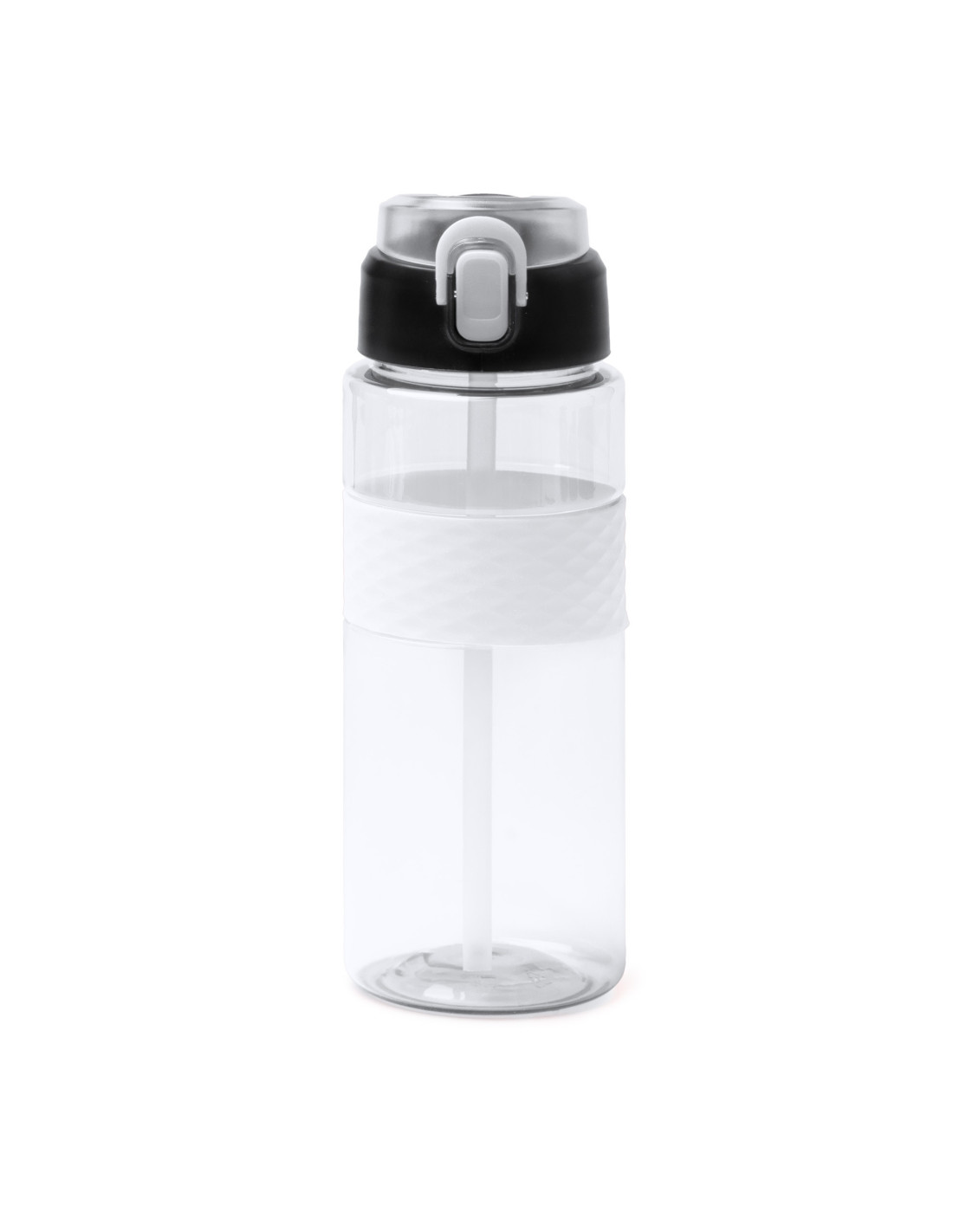 Botella de 700 ml fabricada en RPET, una opción sostenible para beber agua a diario. Incorpora dosificador con pajita de silicona y tapón con apertura automática mediante botón frontal, lo que facilita beber cómodamente en cualquier momento. Cuenta con sistema de seguridad en la tapa para evitar aperturas accidentales, así como asa de transporte para mayor comodidad. Su cuerpo incluye una banda de silicona con textura que mejora el agarre y aporta mayor seguridad en su uso. Con unas dimensiones aproximadas de 22,5 x 7,5 cm, es ideal para deporte, oficina o actividades al aire libre.