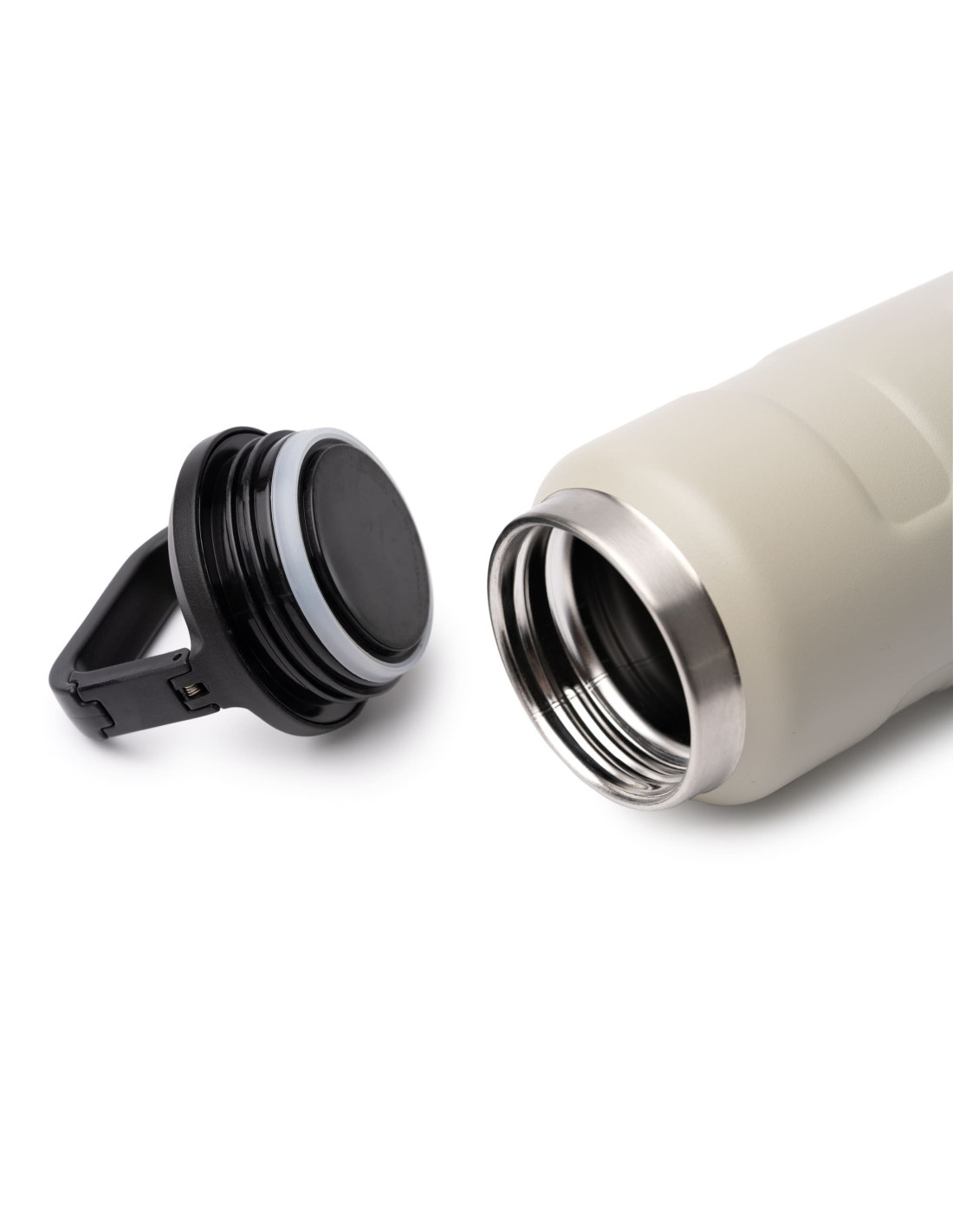 Botella térmica de acero inoxidable 304 reciclado con doble pared y acabado mate. Su diseño mantiene la temperatura de las bebidas por más tiempo (15h bebidas frías y 6h bebidas calientes) y tiene una capacidad de 550 ml, perfecta para llevar al trabajo, al gimnasio o en actividades al aire libre. Incluye tapón negro con mosquetón integrado en el asa de transporte para un manejo cómodo y seguro. Cuenta con sistema antigoteo y se presenta en caja de diseño eco. No apta para lavavajillas; se recomienda lavado a mano.