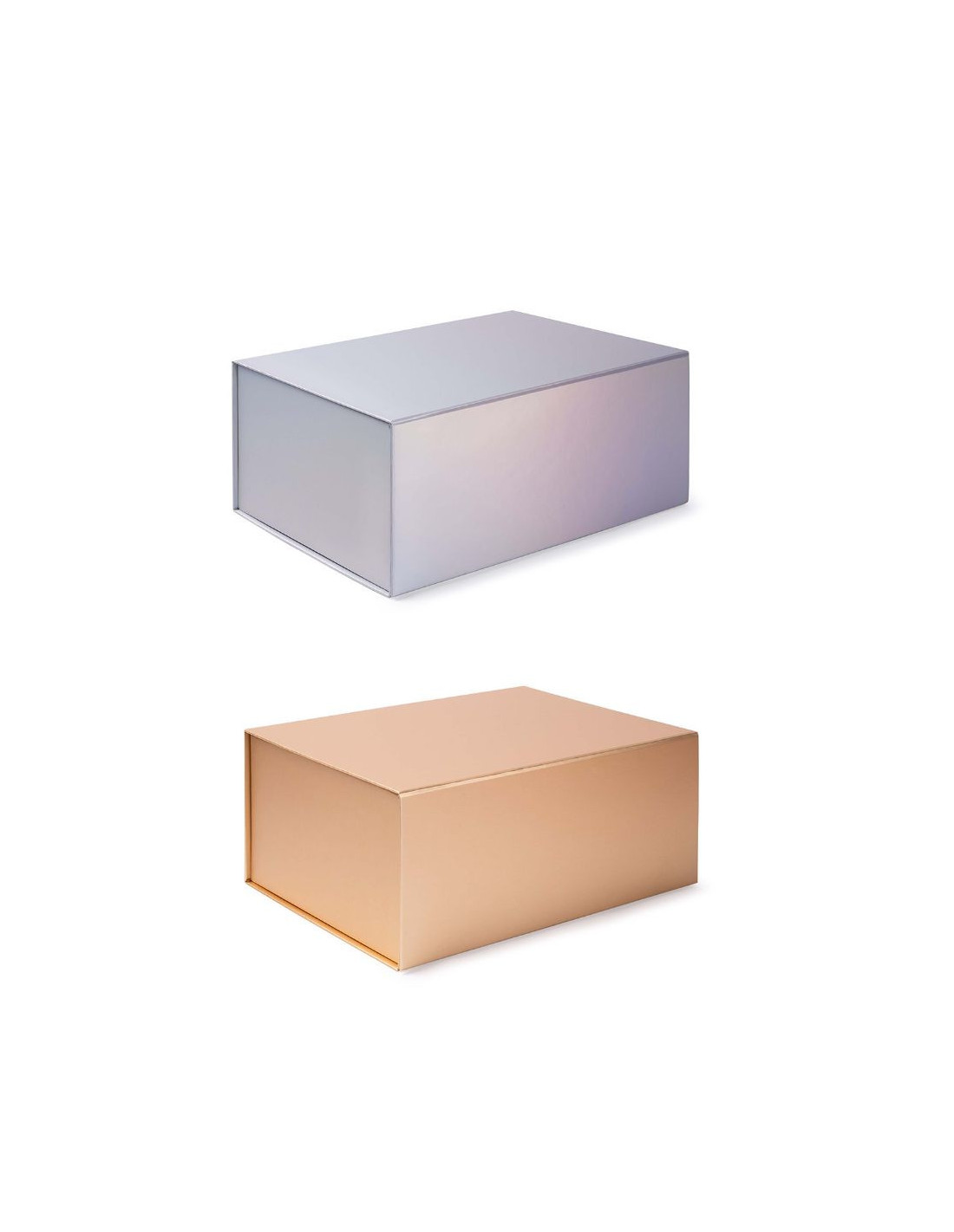 Caja rígida automontable fabricada en cartón de 900 g/m² con cierre imantado y acabado elegante disponible en 2 colores: plata y dorado. Su estructura sólida de 25 × 18 × 11 cm ofrece una presentación cuidada y resistente, ideal para packaging de lujo, kits de bienvenida o regalos corporativos. Su sistema de montaje sencillo permite un uso práctico y su amplio tamaño permite su uso para meter varios productos en pack.