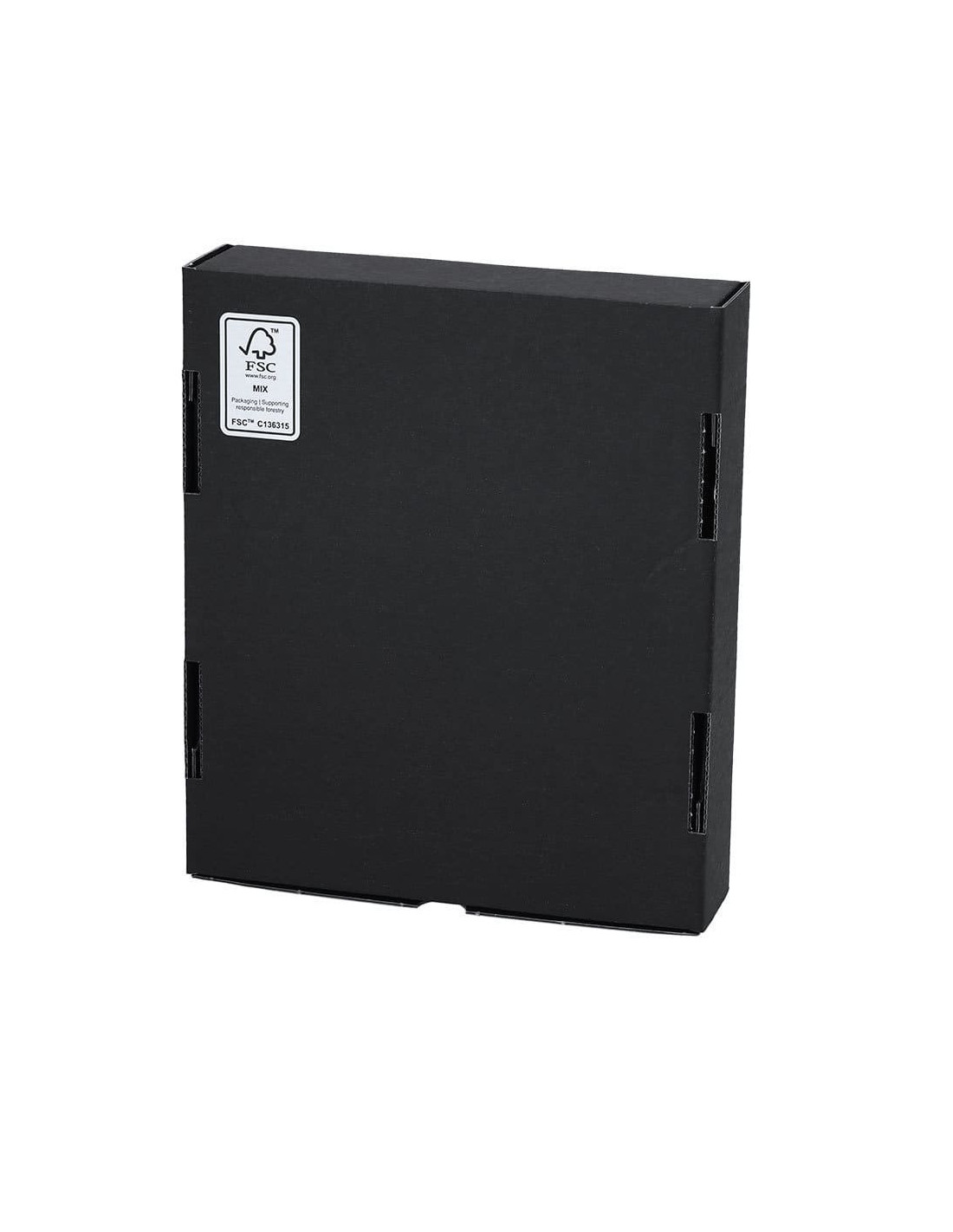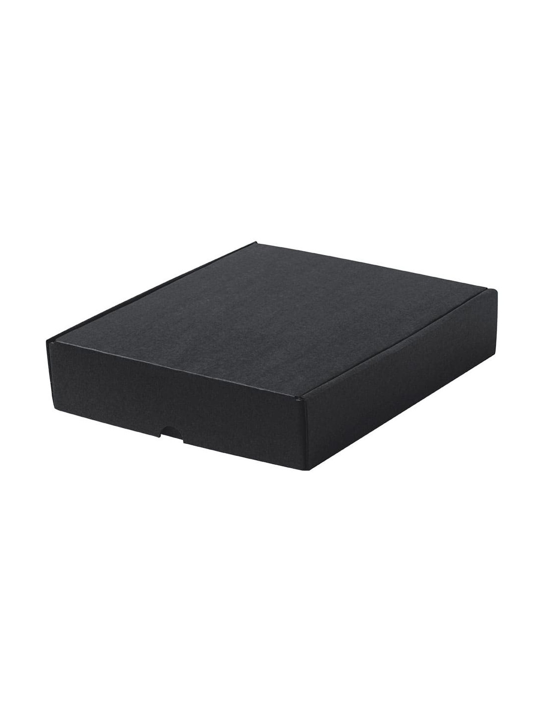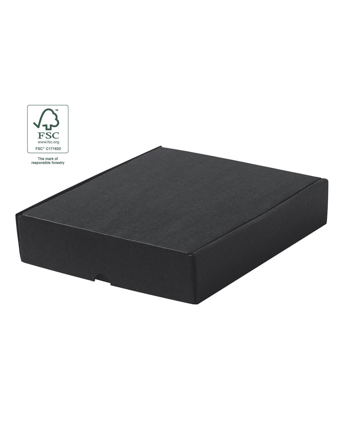 Caja de presentación de tamaño mediano elaborada en cartón corrugado resistente, con acabado en color negro. Esta caja, además de funcional, es sostenible, siendo una opción ideal para regalos corporativos o personalizados. Está elaborada con material certificado FSC, contribuye a la gestión responsable de los bosques y al cuidado del medio ambiente. Sus dimensiones de 21 x 5 x 25 cm permiten adaptarla a distintos tipos de productos, y por tanto perfecta para crear packs con varios regalos promocionales o como caja para artículos de mayor tamaño.