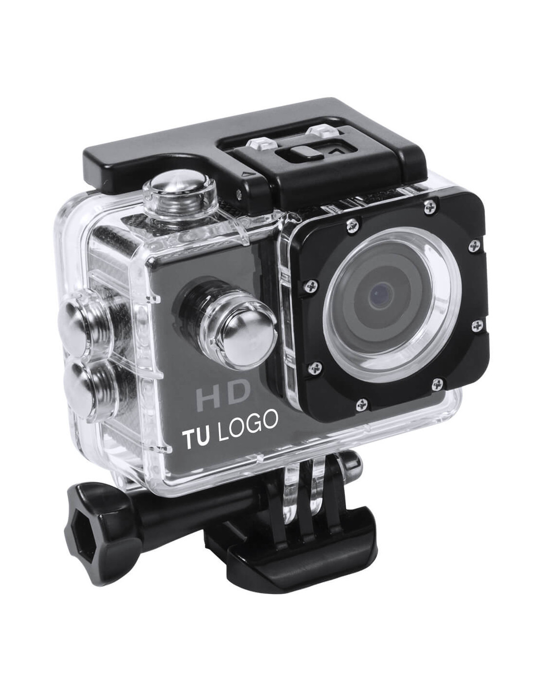 Cámara deportiva sumergible con captura de video 720 HD. Incluye carcasa especialmente diseñada para usar debajo del agua hasta 30 metros de profundidad y es ajustable también mediante correas a la cabeza y torno. Adaptador 360º. Función de cámara de fotos Full HD 1080p, ranura para tarjeta micro USB de hasta 32 Gb, recargable mediante USB y presentada en caja de cartón individual de diferentes colores.