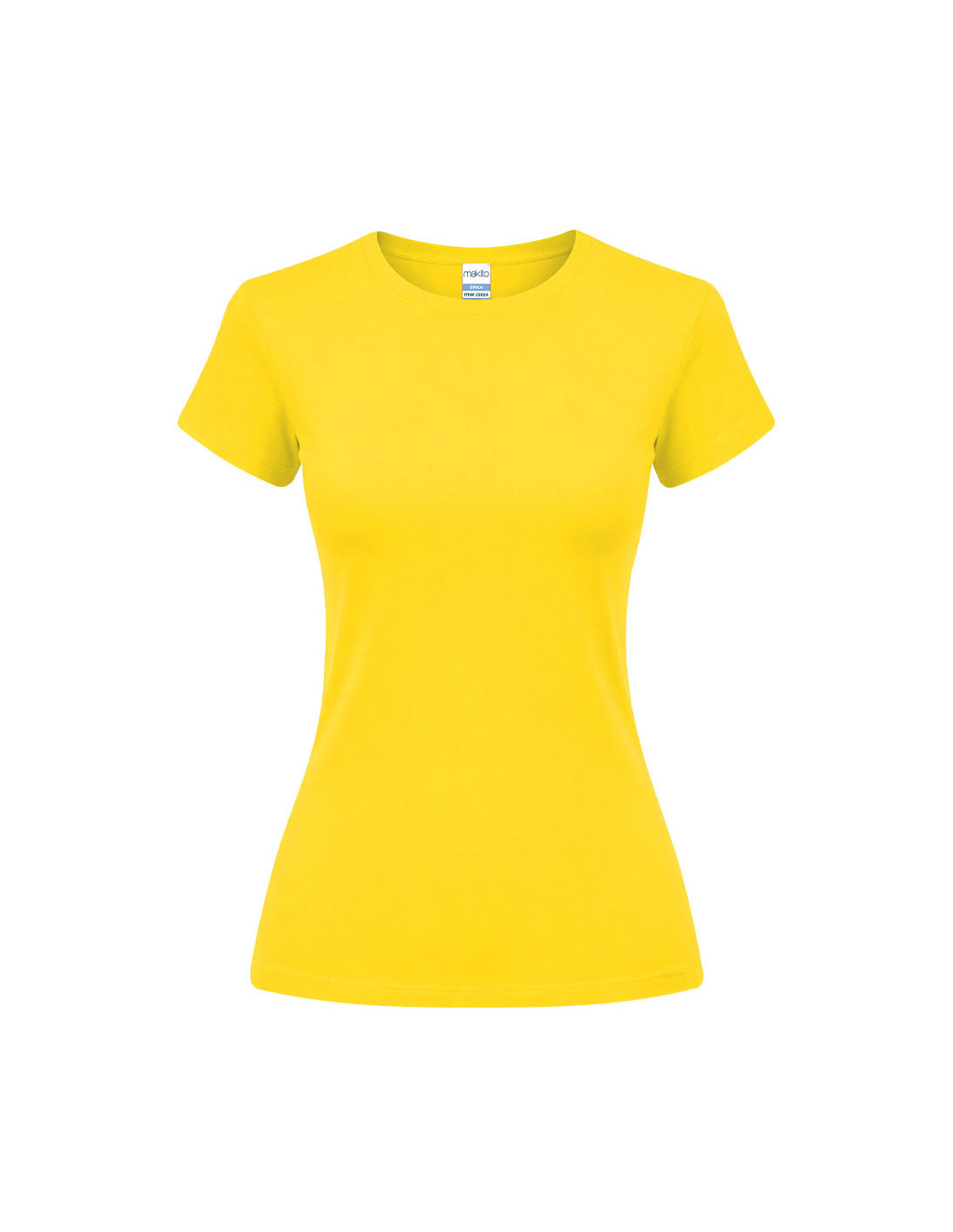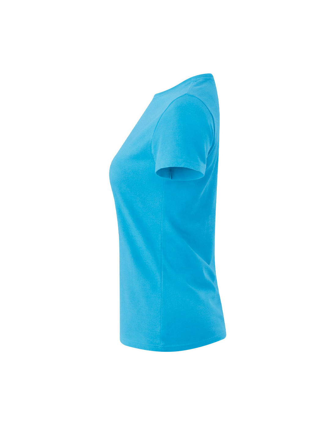 Camiseta de manga corta con fit femenino, confeccionada en suave 100% algodón ring spun de punto liso (single jersey) de 150 g/m². Incorpora costuras laterales que mejoran el ajuste y un cuello redondo en canalé 1x1 con cubrecosturas a tono para mayor comodidad y durabilidad. Una prenda versátil, ligera y con excelente relación calidad-precio, ideal para uso diario o personalización.