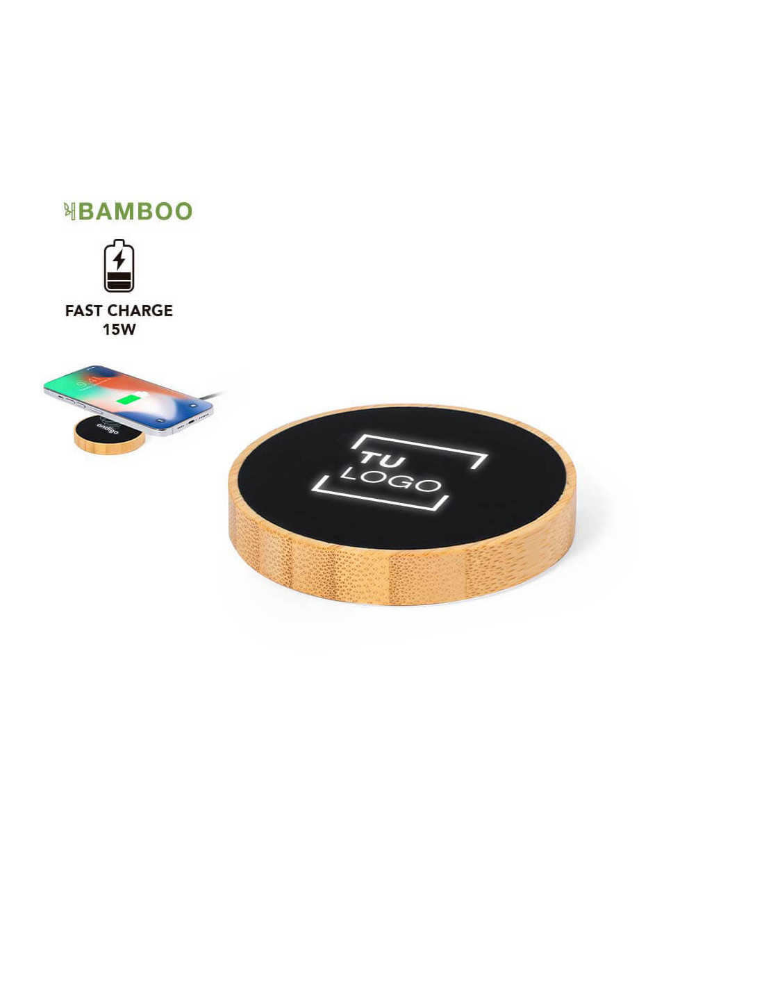 Cargador inalámbrico de diseño circular, con un elegante acabado en bambú y acentos en tono negro sofisticado. Este cargador no solo es funcional sino también estéticamente atractivo, gracias a su luz LED interna que ilumina el logo con un efecto elegante cuando se utiliza el marcaje láser.
