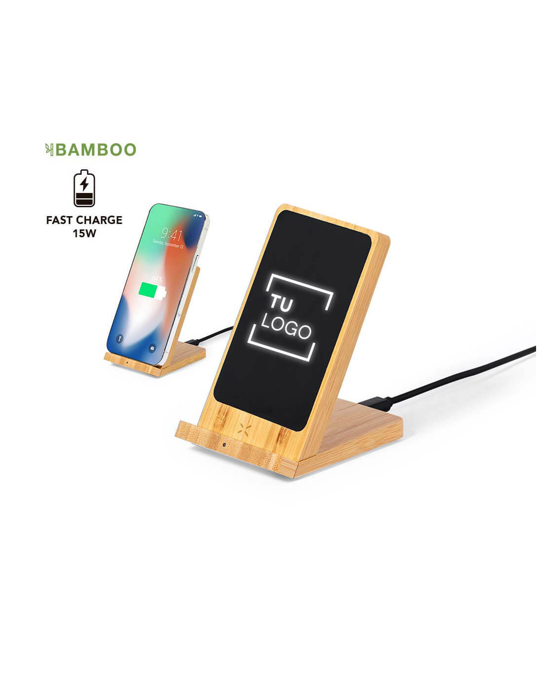 Cargador inalámbrico con función de soporte para smartphone fabricado en bambú, un material sostenible y duradero, ofrece una superficie amplia para un marcaje láser que ilumina tu logo con elegancia.