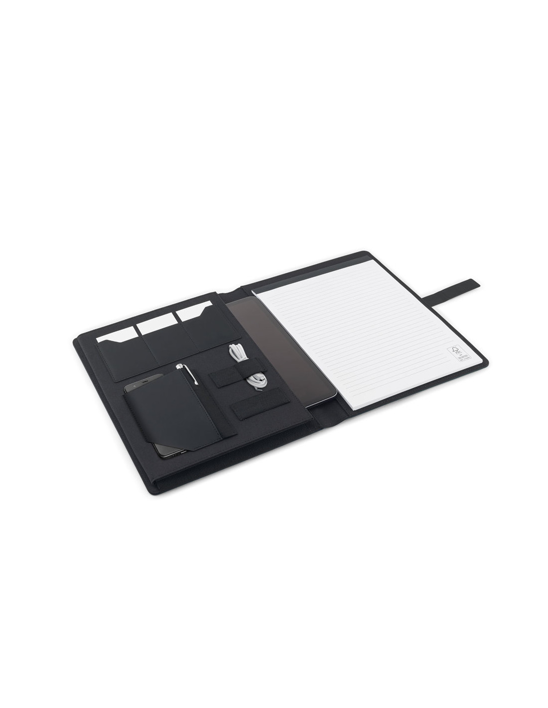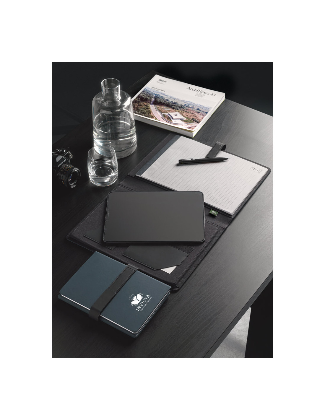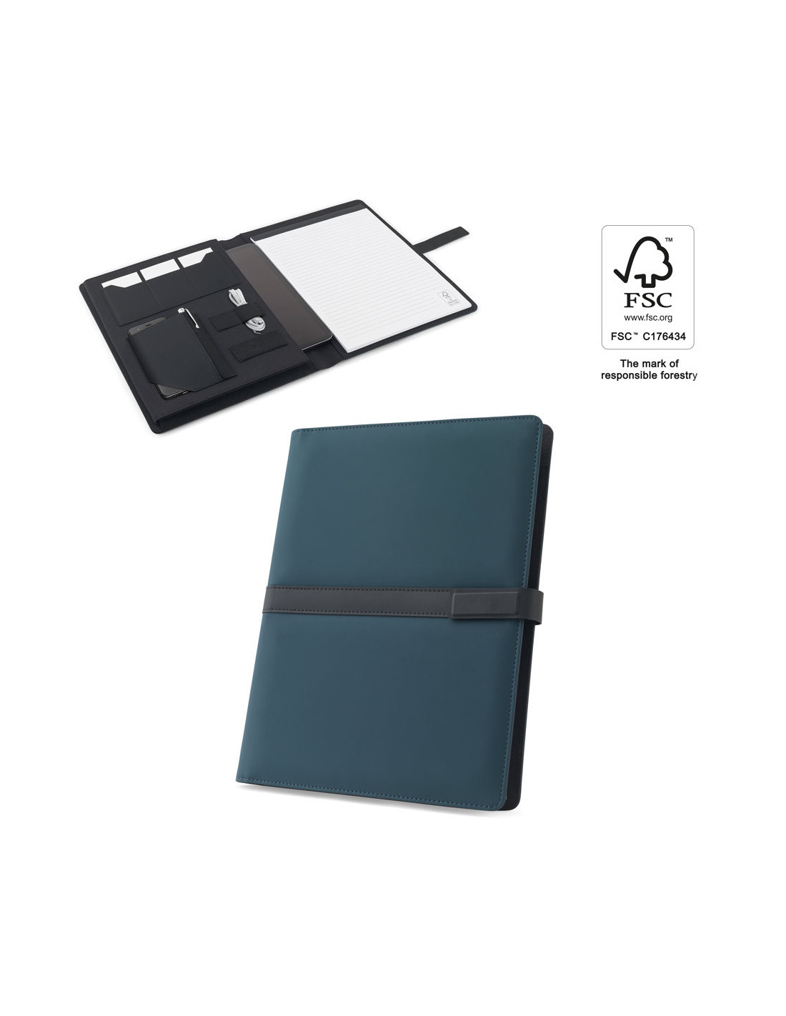 Carpeta A4 fabricada con un 80% de materiales reciclados, combinando poliéster y PU reciclado, con forro 100% rPET y cierre magnético para proteger tus documentos. Incluye una libreta de 80 páginas rayadas (60 g/m²) certificada FSC™, un bolsillo para tablet de hasta 10", un bolsillo para móvil de hasta 6,5", 3 ranuras para tarjetas y 4 presillas elásticas. Un maletín versátil y sostenible, ideal para llevar todo lo que necesitas durante la jornada laboral. Medidas: 247 x 323 mm.