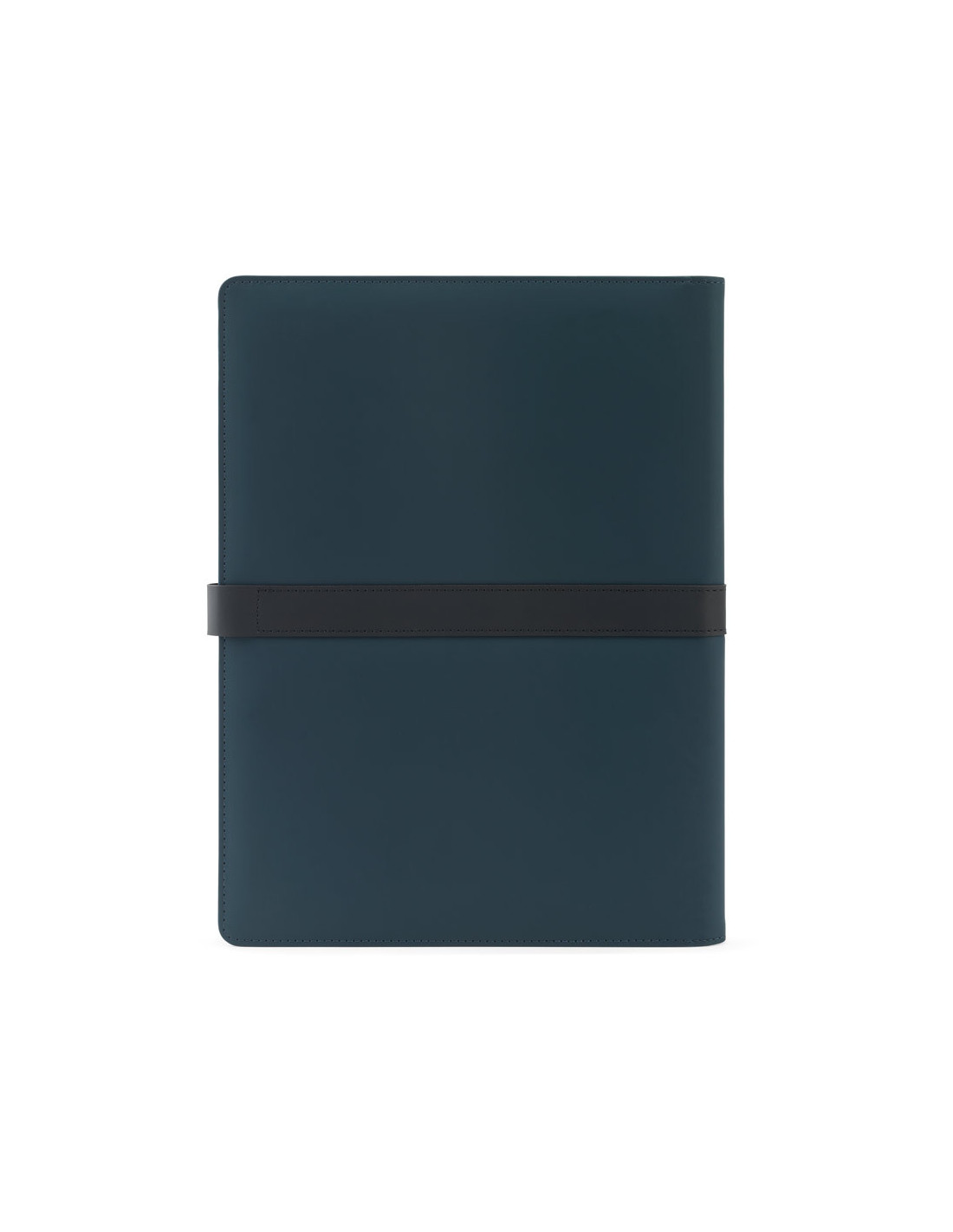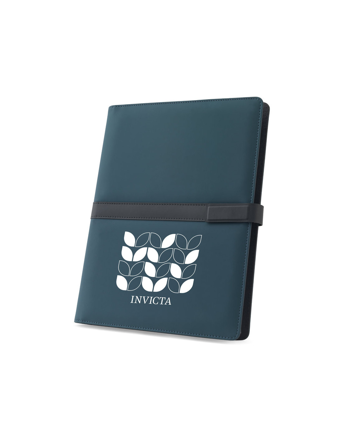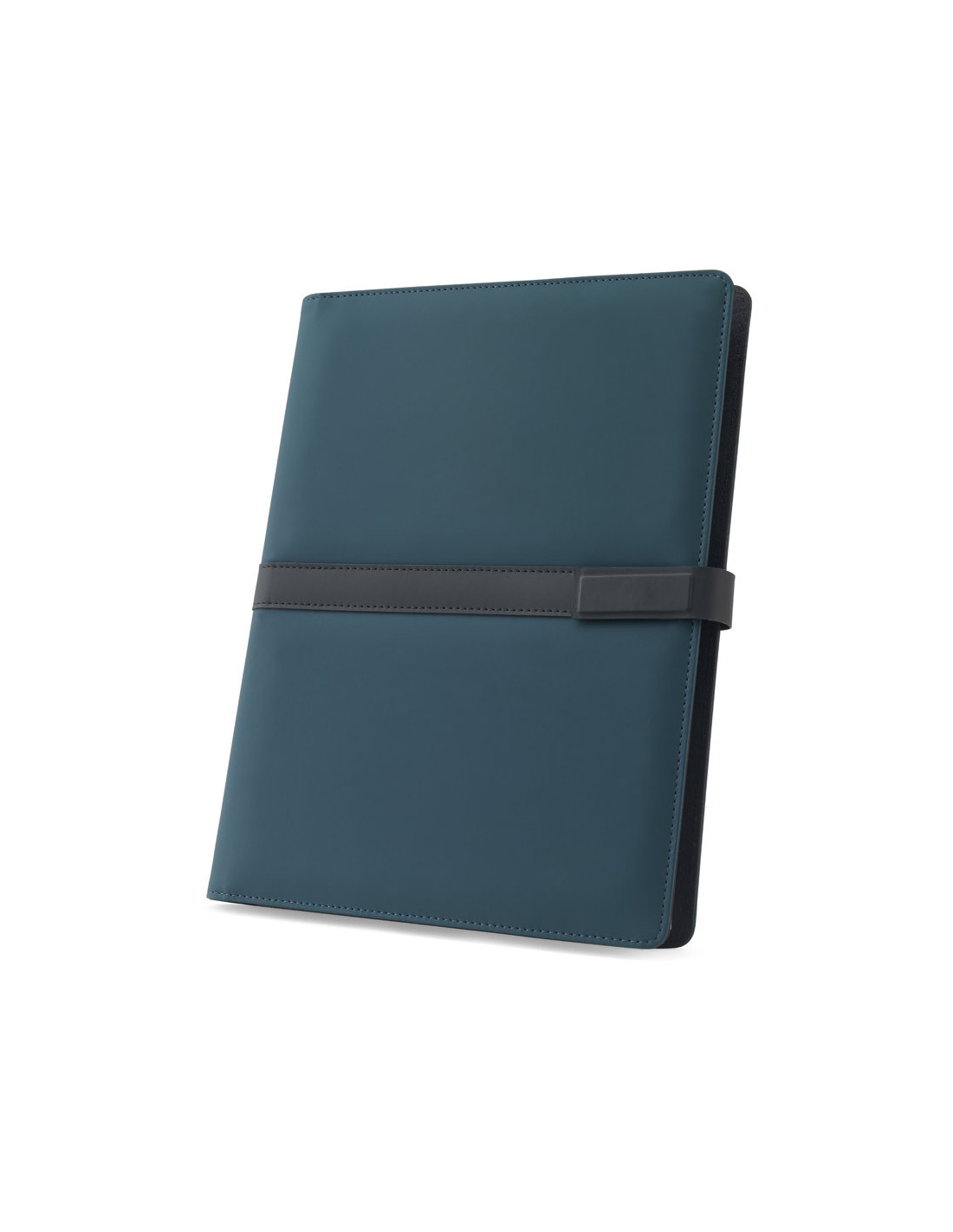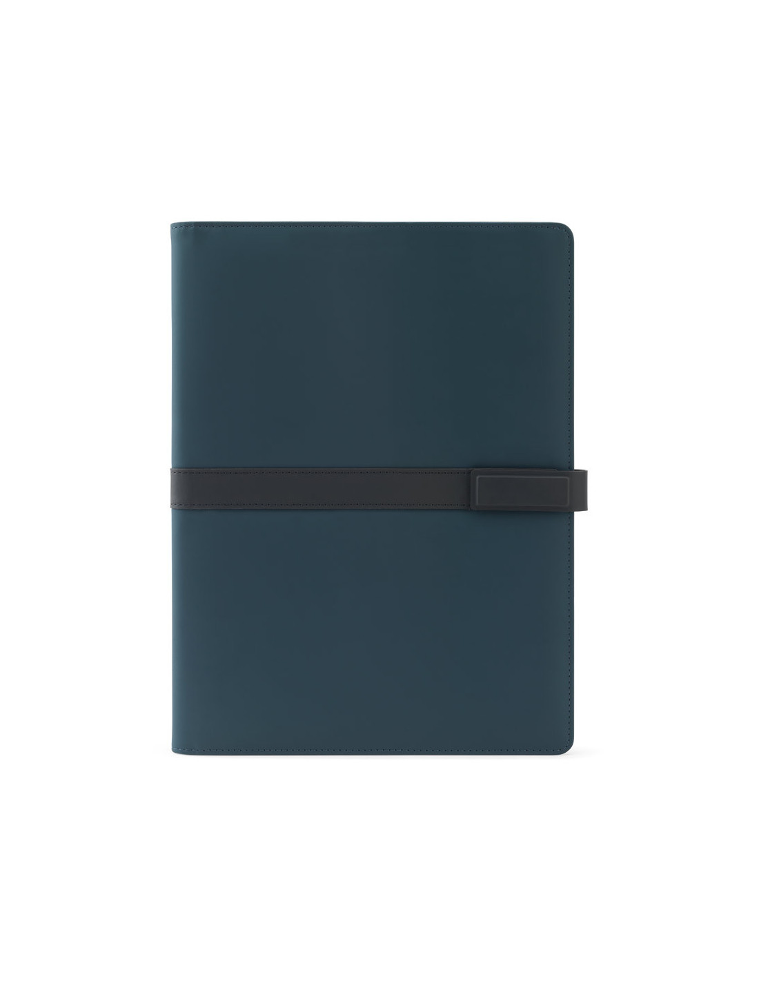 Carpeta A4 fabricada con un 80% de materiales reciclados, combinando poliéster y PU reciclado, con forro 100% rPET y cierre magnético para proteger tus documentos. Incluye una libreta de 80 páginas rayadas (60 g/m²) certificada FSC™, un bolsillo para tablet de hasta 10", un bolsillo para móvil de hasta 6,5", 3 ranuras para tarjetas y 4 presillas elásticas. Un maletín versátil y sostenible, ideal para llevar todo lo que necesitas durante la jornada laboral. Medidas: 247 x 323 mm.