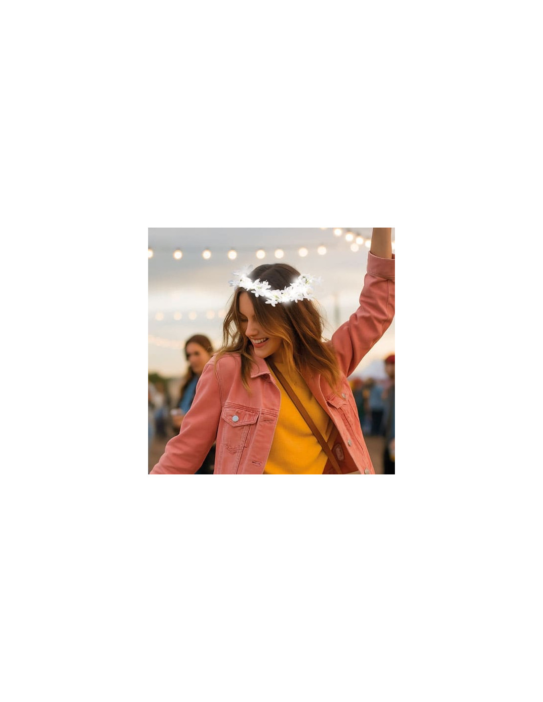 Diadema decorativa con flores artificiales y luces LED integradas, fabricada en poliéster. Permite elegir entre tres modos de iluminación: parpadeo rápido, parpadeo lento o luz constante, que se activan fácilmente con un solo clic. Su diámetro aproximado es de 17 cm, adaptable a la mayoría de tallas, y se entrega con tres pilas de botón incluidas, listas para usar. Ideal para fiestas, eventos o detalles personalizados.
