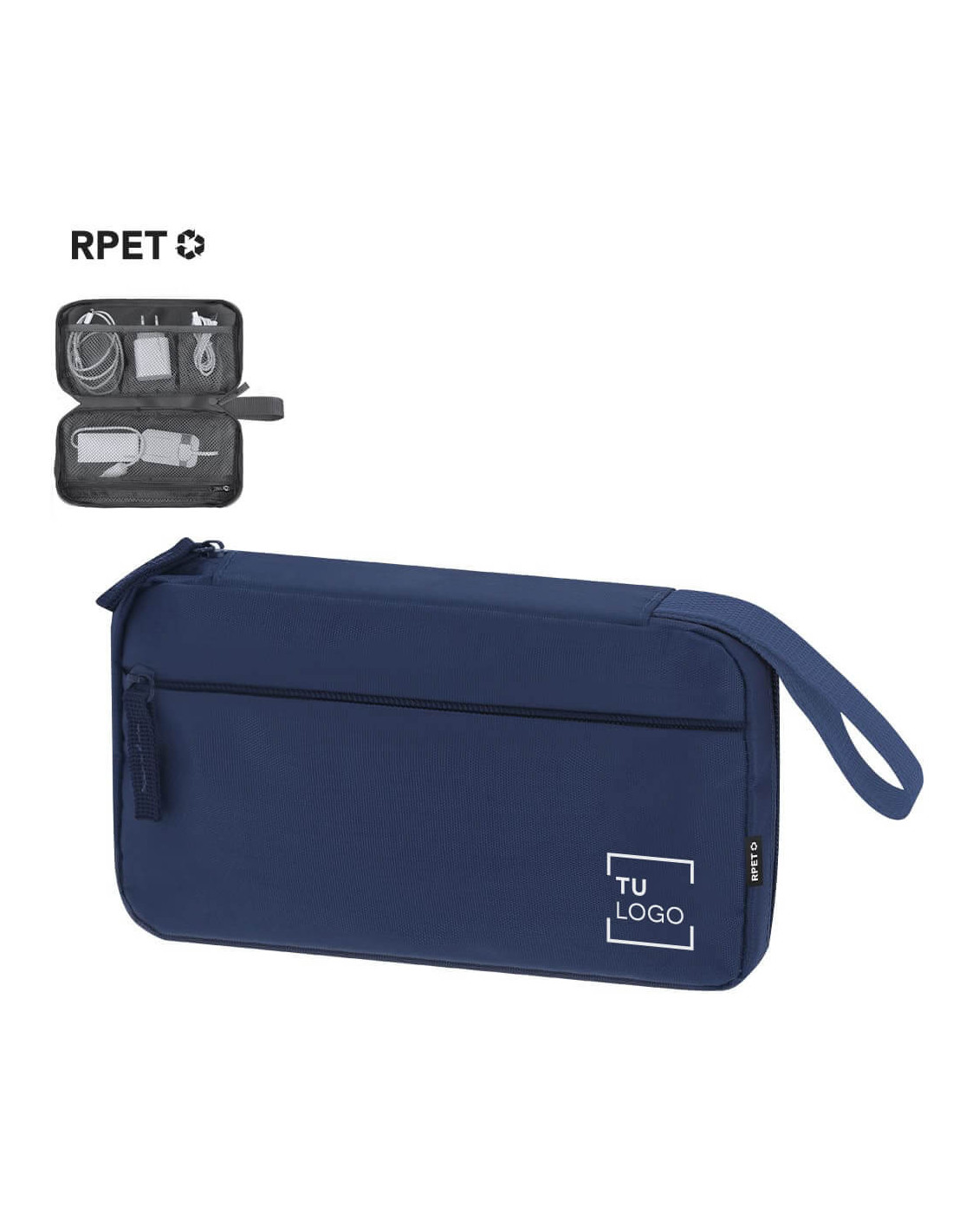 Este estuche organizador de cables está fabricado en RPET 900D, un material de alta resistencia y respetuoso con el medio ambiente, fabricado a partir de plástico reciclado. Dispone de un bolsillo principal de apertura completa, con doble tirador metálico que facilita el acceso a tus pertenencias. En su interior, encontrarás 3 bolsillos con banda elástica y 1 bolsillo con cierre de cremallera, ideales para organizar tus cables y otros accesorios de manera ordenada y segura. Además, incluye un bolsillo exterior con cierre de cremallera invisible, que proporciona un acceso rápido y discreto a tus objetos pequeños. El asa de transporte integrada facilita su uso y te permite llevarlo cómodamente en viajes y a donde necesites. El estuche presenta un distintivo RPET, lo que resalta su compromiso con la sostenibilidad.