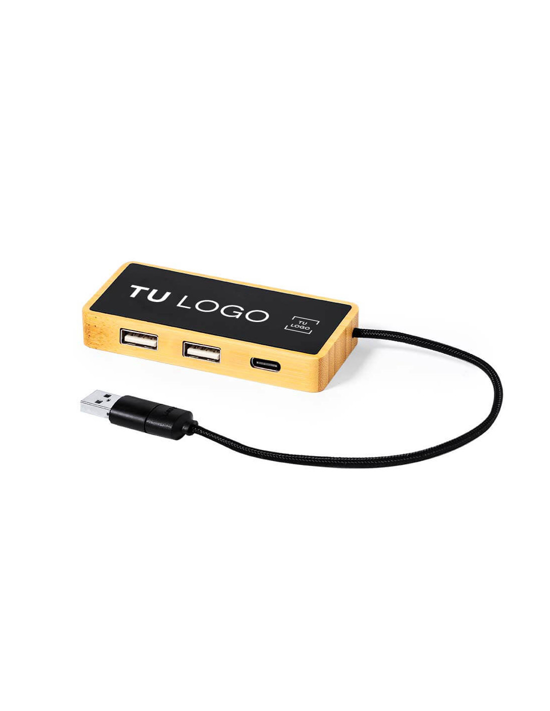 Hub USB de bambú con diseño natural y elegante. Su acabado en negro mate y la luz LED interior lo hacen tanto estilizado como práctico. Diseñado para destacar tu marca, permite el marcaje láser del logo en su superficie.