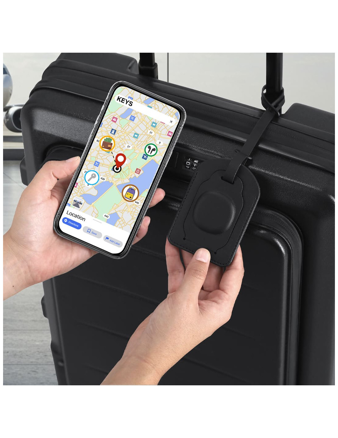 Identificador para maletas con localizador inteligente integrado, fabricado en PU y diseñado para facilitar la localización del equipaje durante viajes y desplazamientos. Incorpora una cinta resistente para su colocación directa en la maleta, mochila o bolso de viaje. Es compatible con los sistemas Apple Find My y Android Find Hub, permitiendo activar la función de búsqueda desde dispositivos vinculados a la app para conocer la ubicación del objeto asociado. Incluye función antipérdida y pila de botón para su uso inmediato, sin configuraciones adicionales. Una solución práctica para viajes, ferias, eventos corporativos o acciones promocionales relacionadas con movilidad y tecnología.