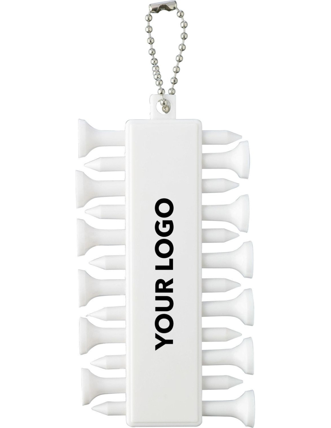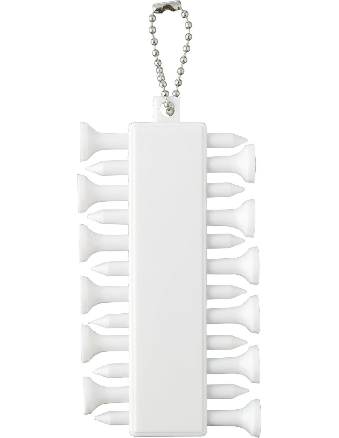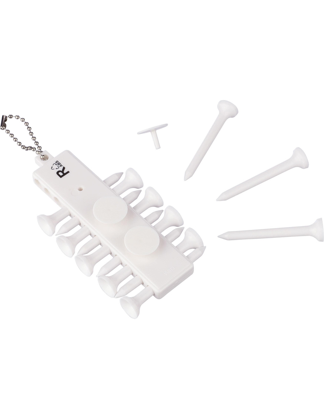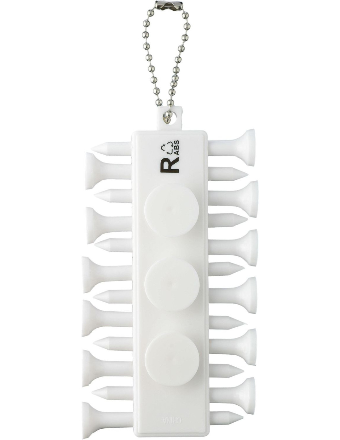 Juego de 12 tees de golf fabricados en ABS reciclado, presentados en un soporte compacto que facilita su transporte y almacenamiento. Incluye tres marcadores integrados en la parte trasera y un cordón metálico para fijarlo a la bolsa de golf o a un accesorio deportivo. El soporte incorpora el logotipo de ABS reciclado, destacando su composición y diseño. Este set es útil para rondas de golf, entrenamientos o torneos como complemento para jugadores que buscan llevar los tees organizados en un solo lugar.