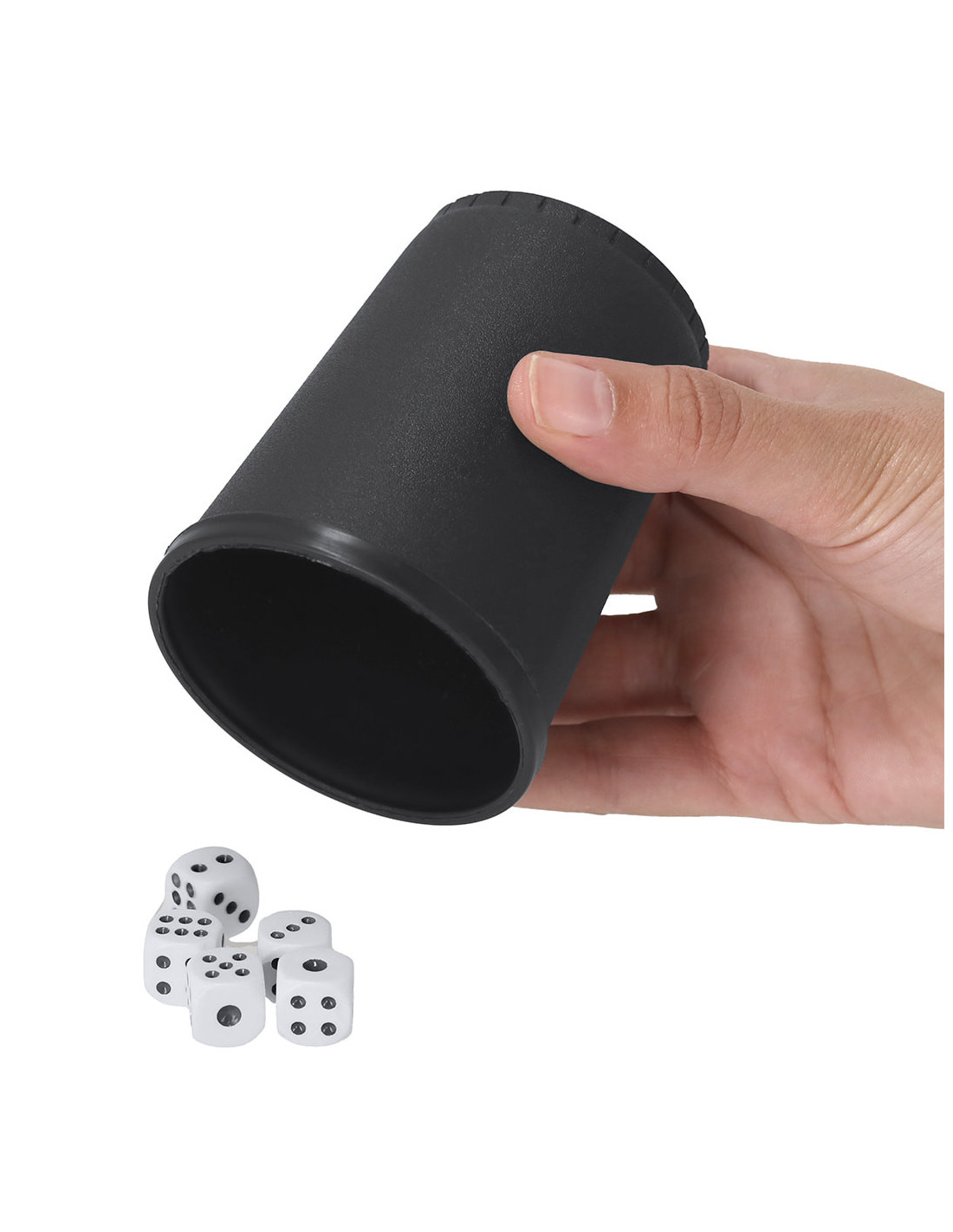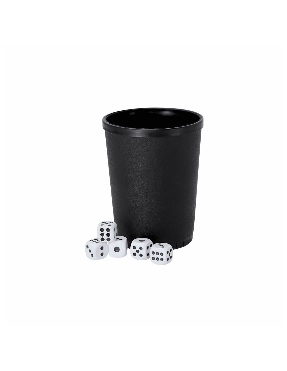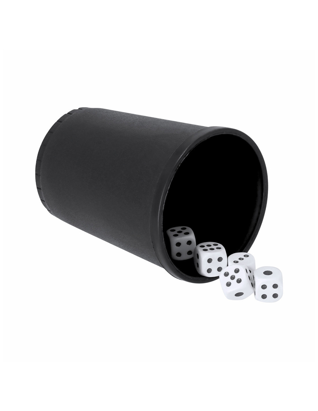 Juego de dados con cubilete fabricado en PP con acabado de textura rugosa, diseñado para ofrecer durabilidad y un agarre cómodo durante su uso. Incluye 5 dados, lo que lo convierte en un accesorio ideal para disfrutar de juegos clásicos de mesa en casa, viajes, reuniones o eventos. Su cubilete facilita agitar y lanzar los dados de forma práctica, además de permitir guardarlos cómodamente cuando no se utilizan. Con unas dimensiones aproximadas de 8,6 cm de altura y 6,7 cm de diámetro, es un conjunto compacto y fácil de transportar, perfecto también como artículo promocional para acciones publicitarias y campañas de marketing.