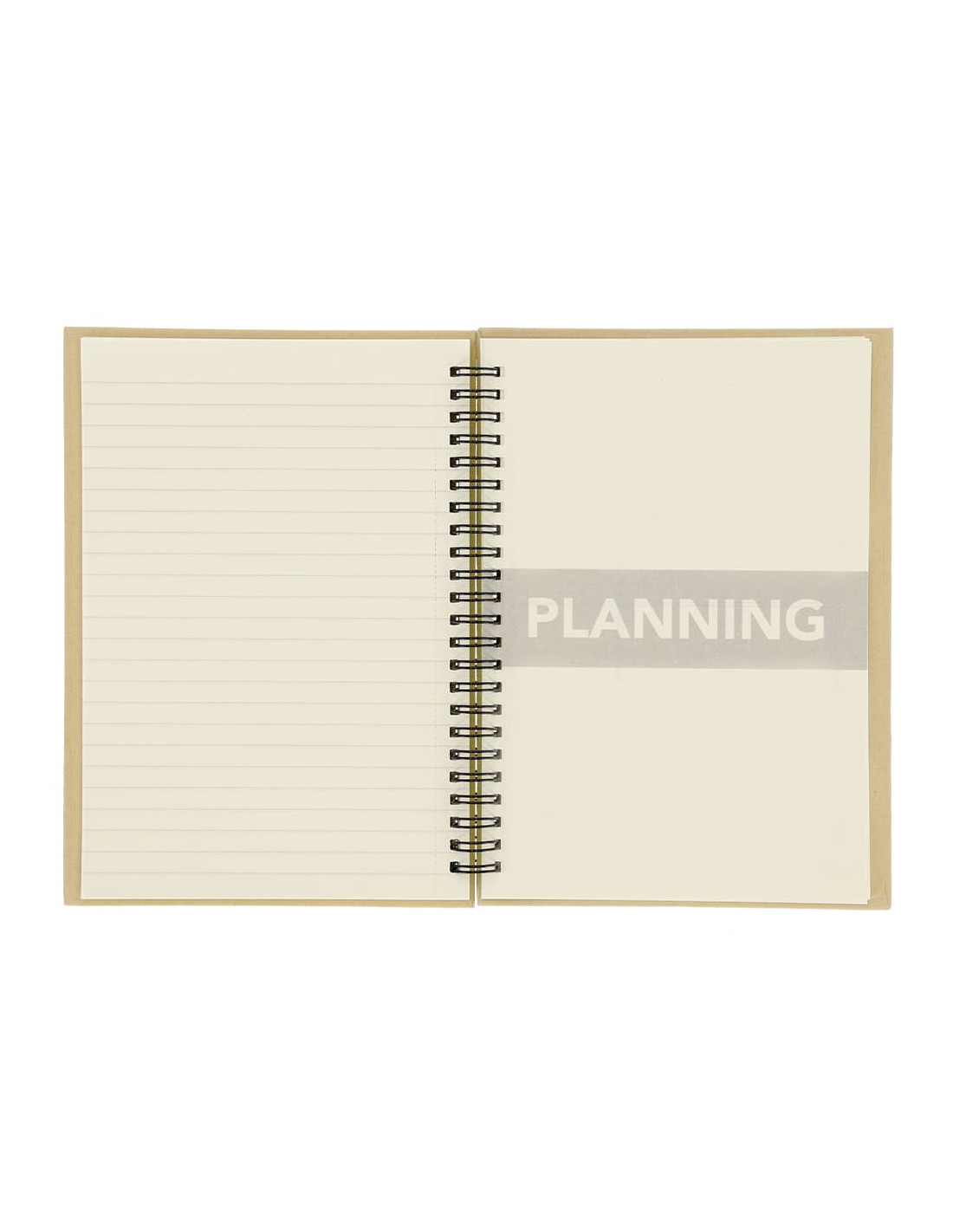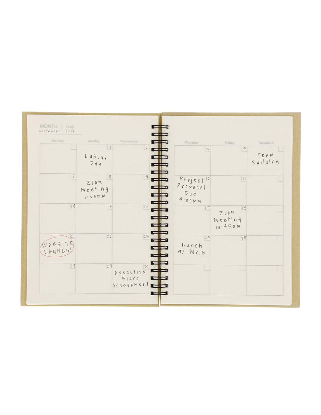Libreta con planificador mensual y tapas rígidas de cartón reciclado. Dispone de 80 hojas color crema con líneas y marca de corte fácil, 13 hojas de calendario mensual sin fechas y 2 hojas adicionales de notas con rayas. Ideal para organizar tareas, apuntar recordatorios y planificar cada mes de forma sencilla.