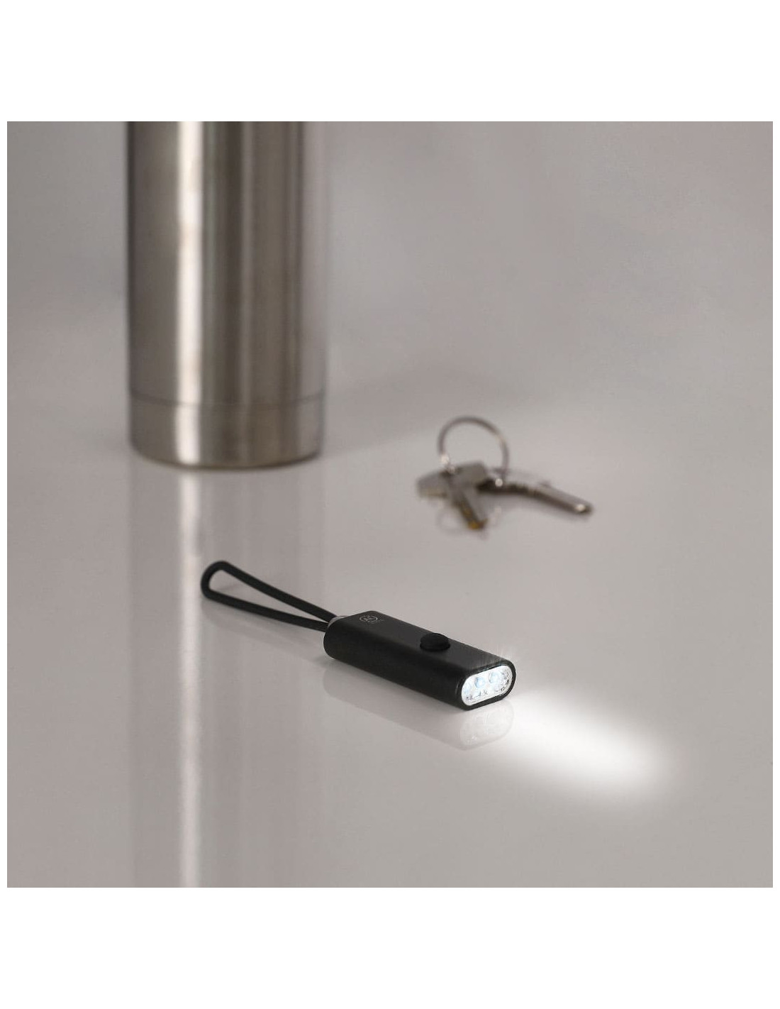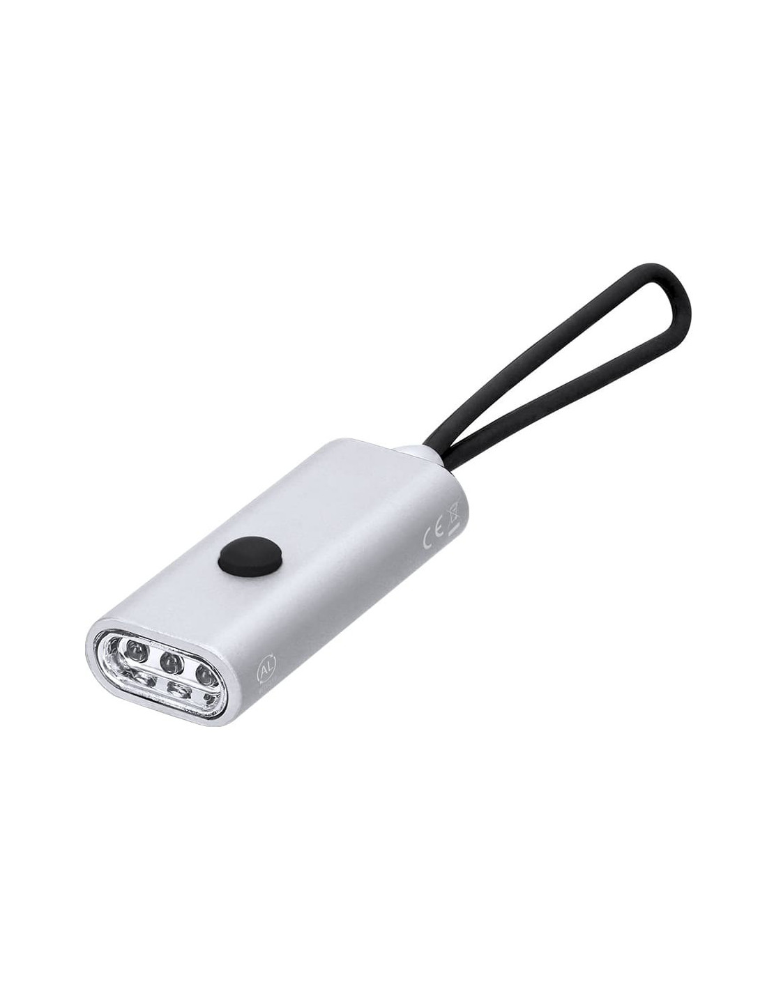 Linterna fabricada en aluminio reciclado, equipada con tres LEDs que proporcionan una iluminación clara para uso cotidiano, emergencias o actividades al aire libre. Funciona con pilas de botón incluidas y dispone de botón de encendido y apagado situado en la parte superior para un manejo sencillo. Incorpora un asa de silicona que facilita su transporte o sujeción en mochilas, bolsos o equipamiento de trabajo. En el lateral incluye distintivo de aluminio reciclado, reforzando su enfoque sostenible. Una opción práctica para regalos promocionales, campañas corporativas o merchandising relacionado con seguridad y sostenibilidad.