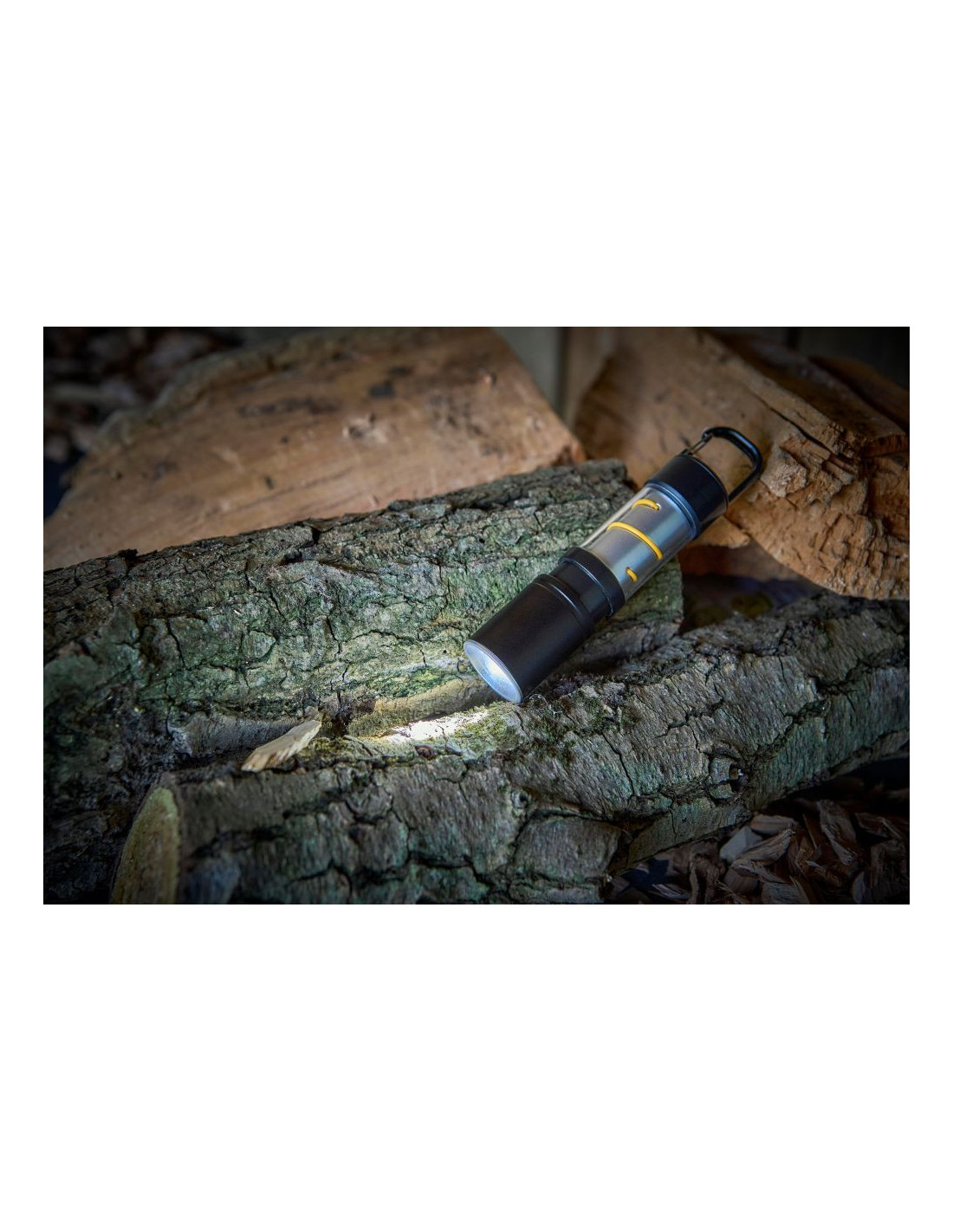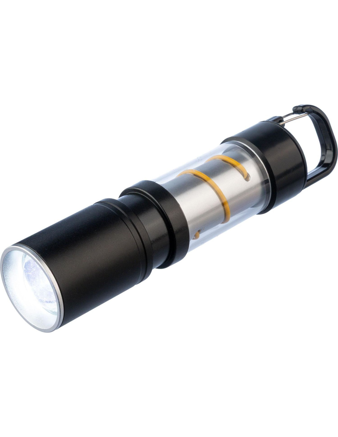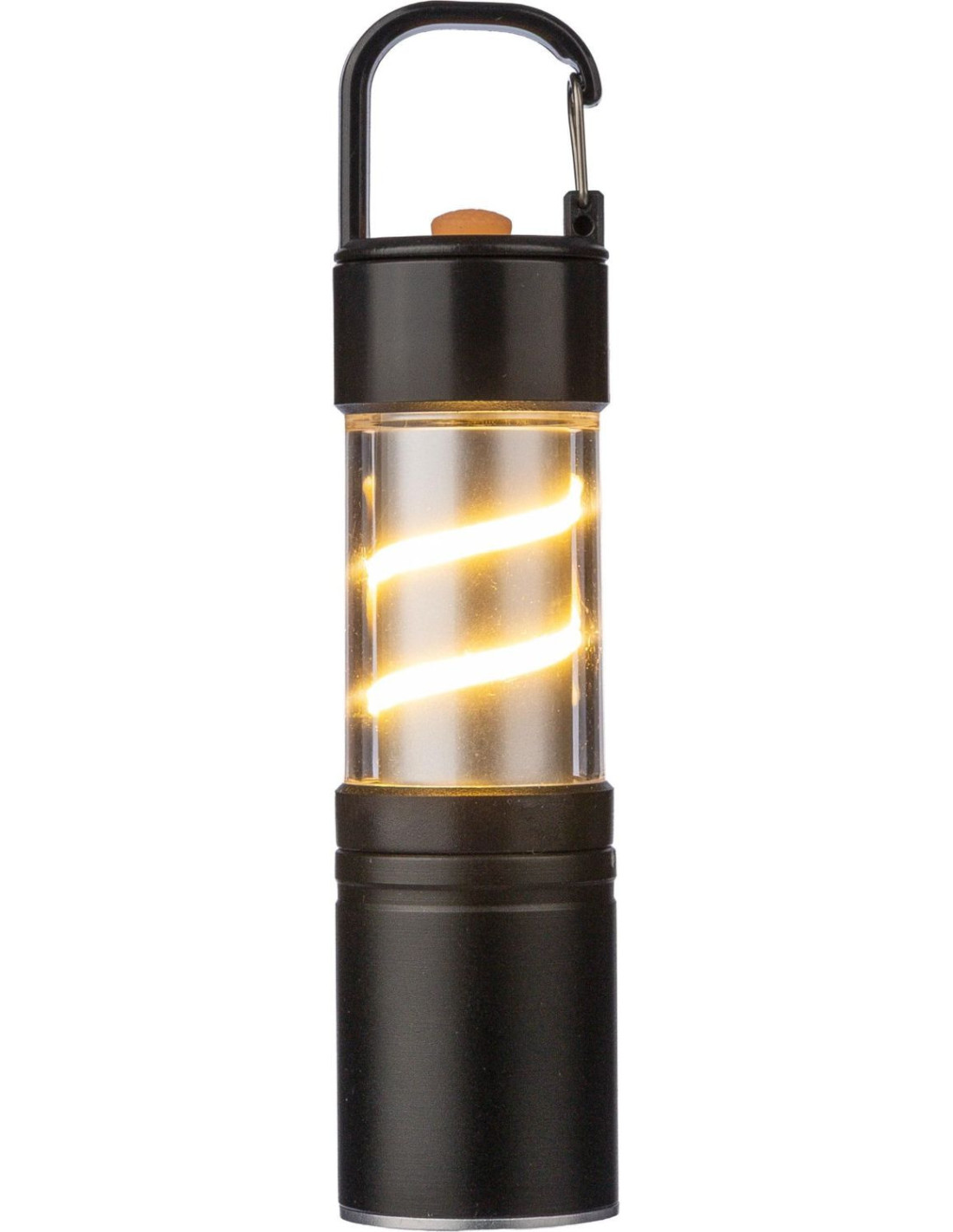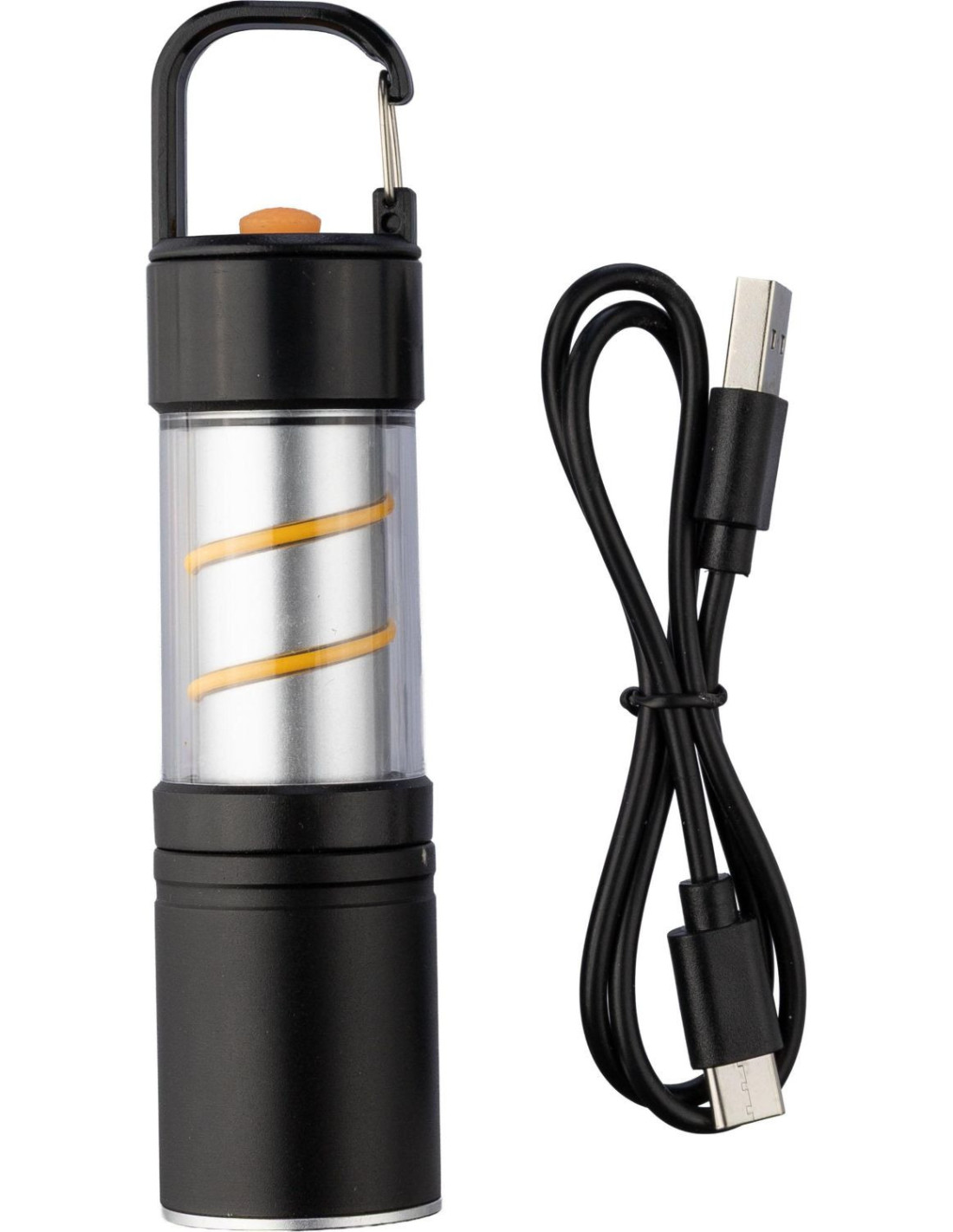 Linterna COB fabricada en aluminio y aleación con carcasa de ABS y clip metálico en la parte trasera. Dispone de tres funciones de luz: una luz directa como la de cualquier linterna tradicional, una luz difusa a través de una tira LED integrada en el cuerpo y un modo zoom. Cuenta con un mosquetón negro en la parte superior y funciona con una batería de iones de litio de 500 mAh recargable mediante cable tipo C, ofreciendo 130 lúmenes de iluminación. Se activa con un botón pulsador e incluye un cable negro de 30 cm. Gracias a su versatilidad y facilidad de transporte gracias a su mosquetón, es adecuada para actividades al aire libre, camping, senderismo, emergencias o incluso para uso doméstico. Se presenta en una caja de cartón marrón.