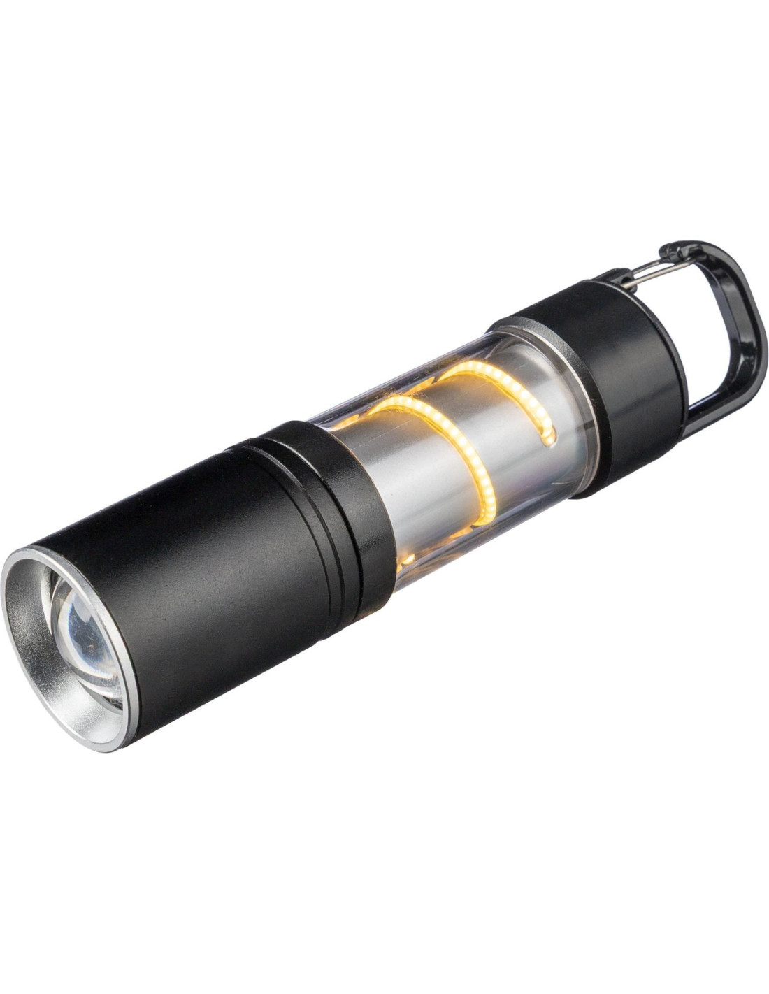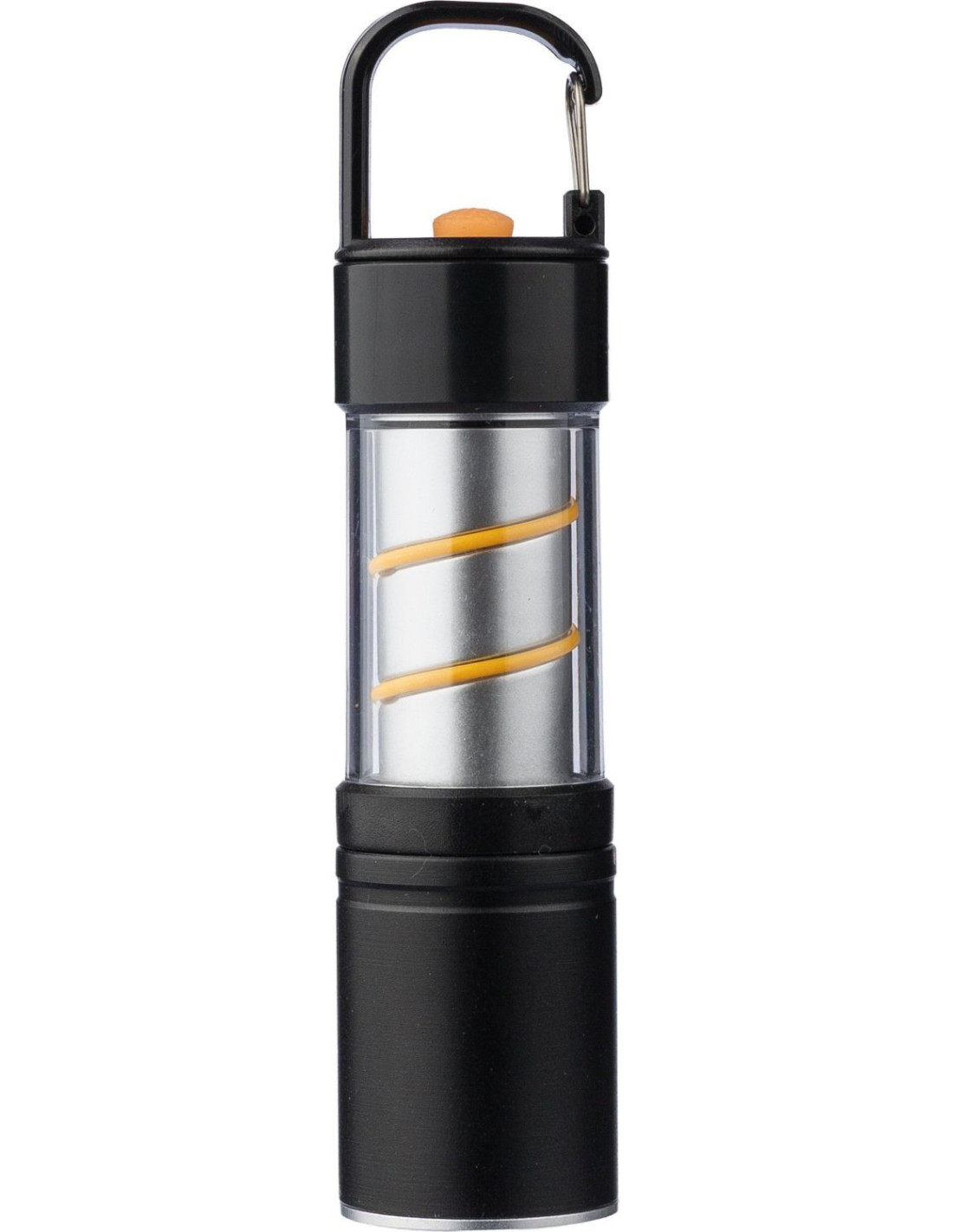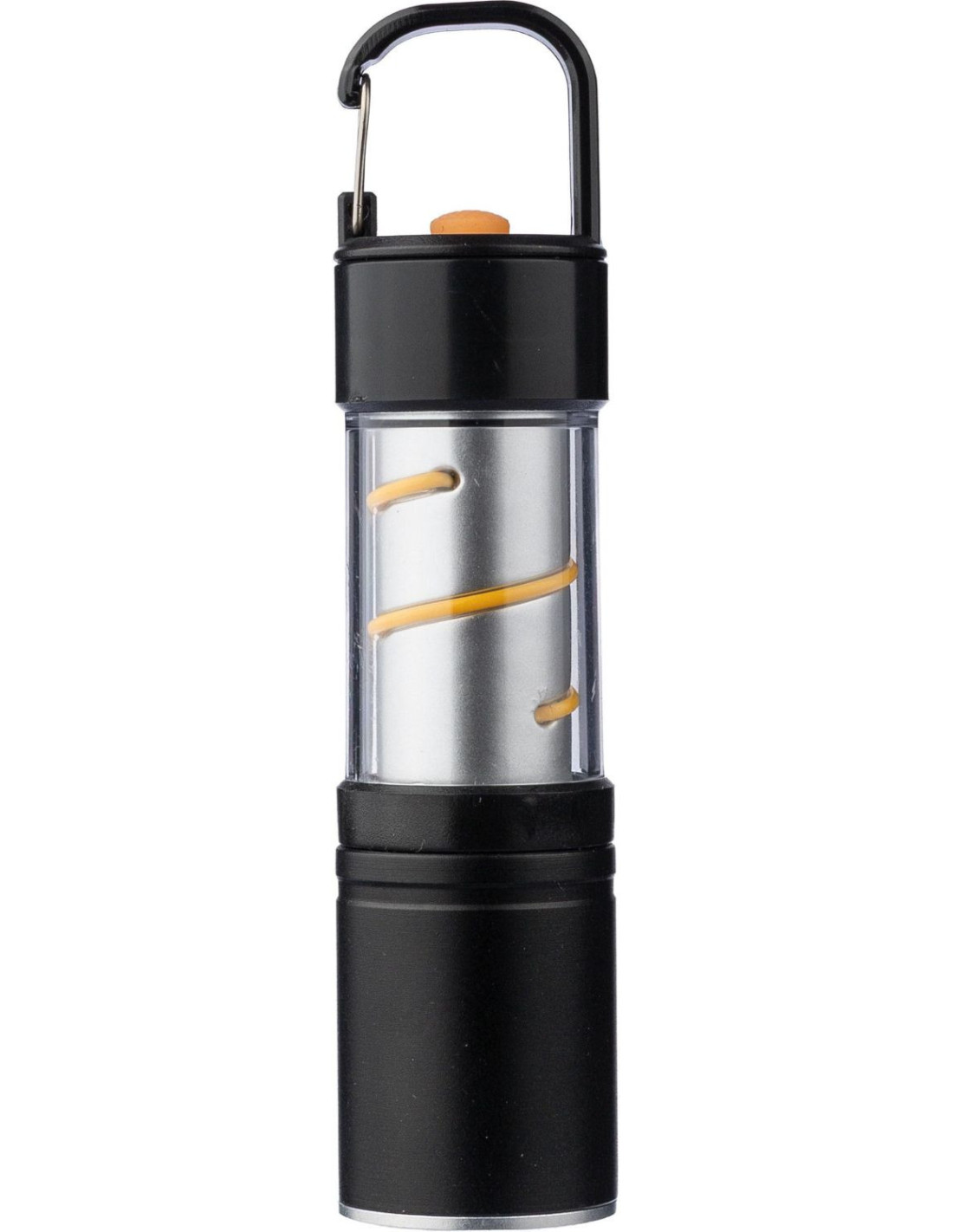 Linterna COB fabricada en aluminio y aleación con carcasa de ABS y clip metálico en la parte trasera. Dispone de tres funciones de luz: una luz directa como la de cualquier linterna tradicional, una luz difusa a través de una tira LED integrada en el cuerpo y un modo zoom. Cuenta con un mosquetón negro en la parte superior y funciona con una batería de iones de litio de 500 mAh recargable mediante cable tipo C, ofreciendo 130 lúmenes de iluminación. Se activa con un botón pulsador e incluye un cable negro de 30 cm. Gracias a su versatilidad y facilidad de transporte gracias a su mosquetón, es adecuada para actividades al aire libre, camping, senderismo, emergencias o incluso para uso doméstico. Se presenta en una caja de cartón marrón.