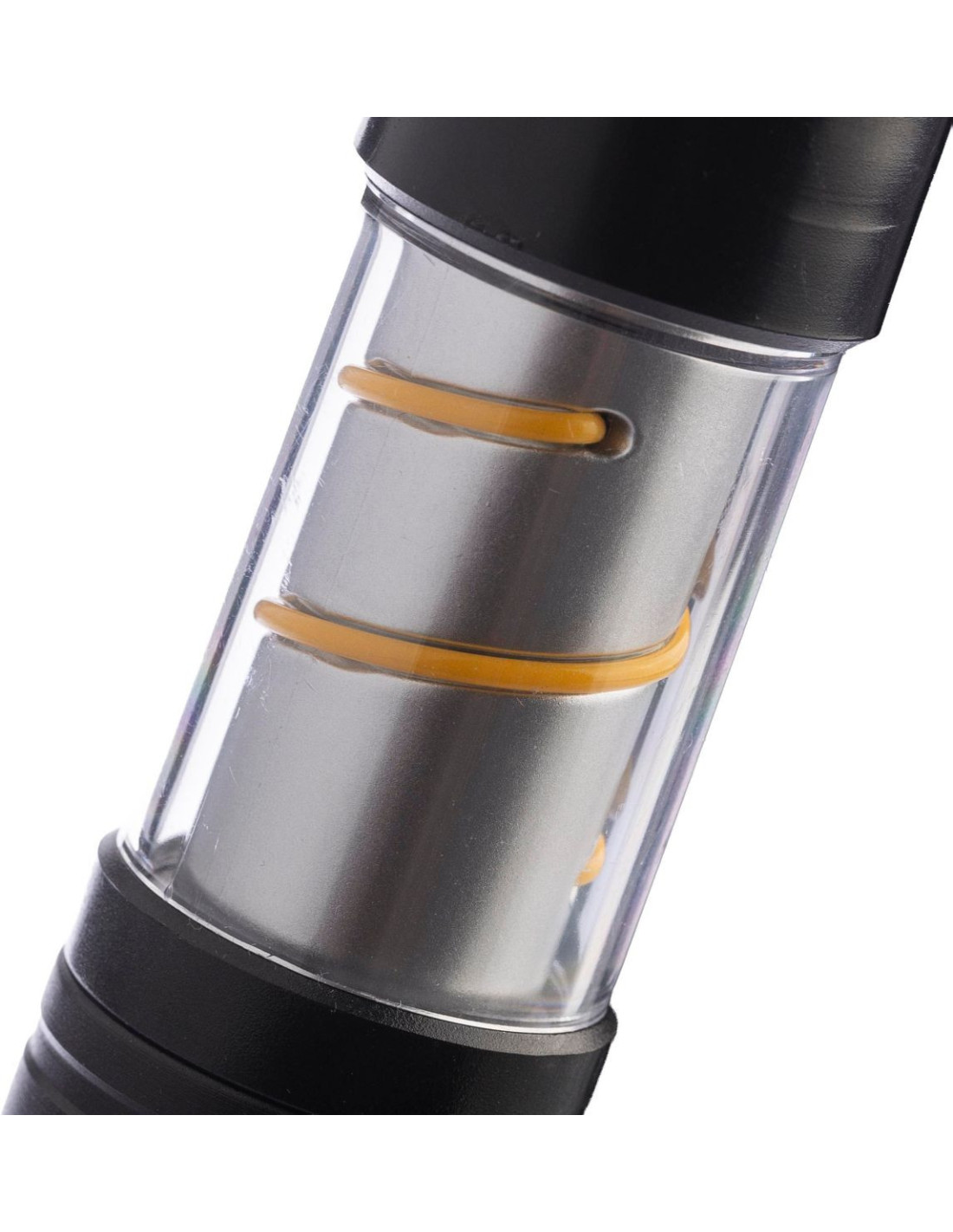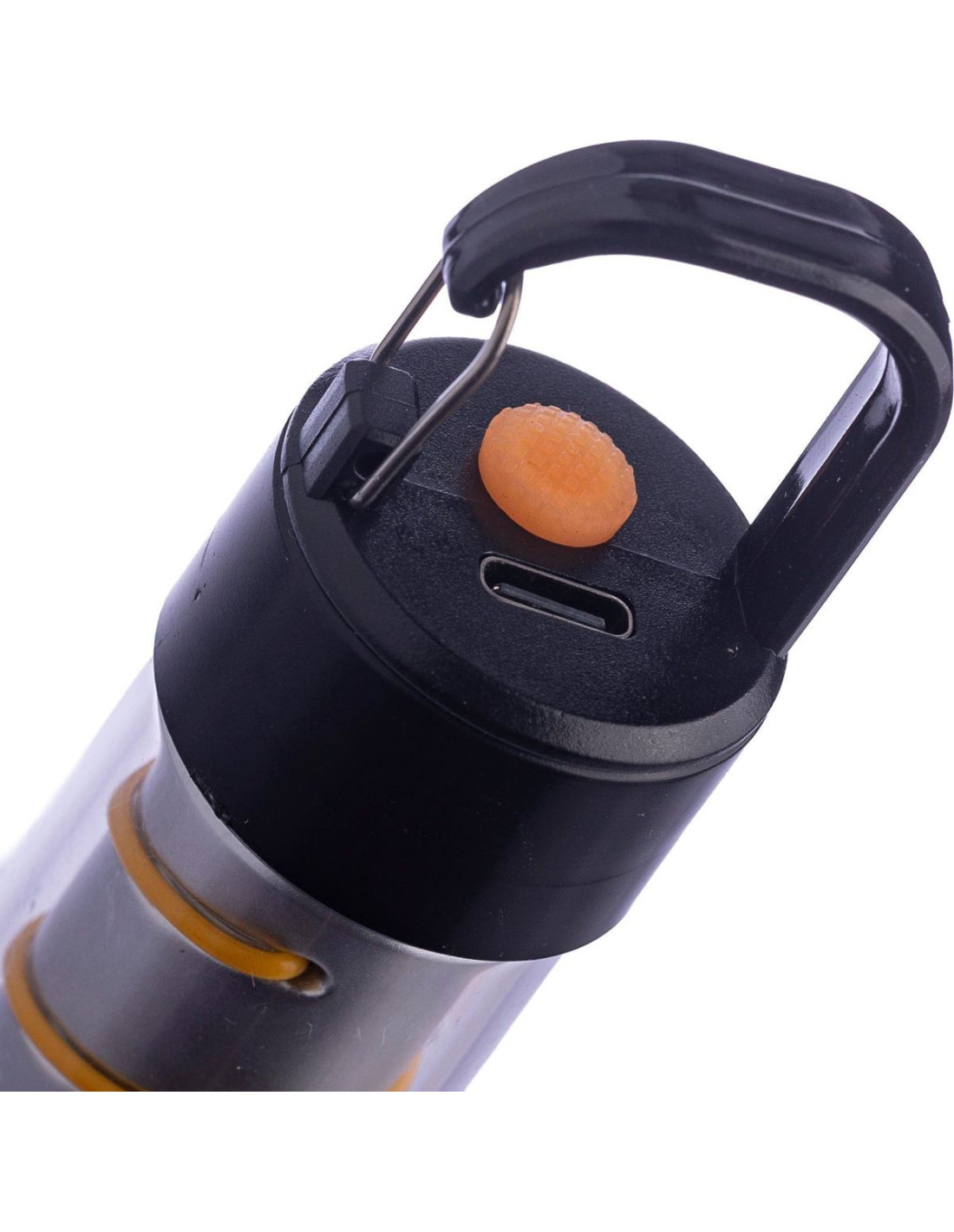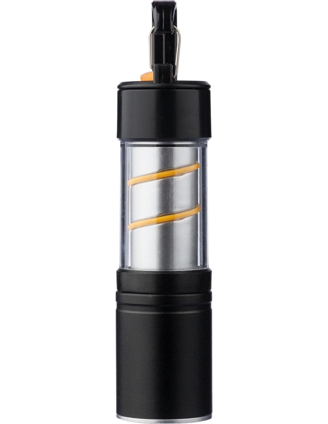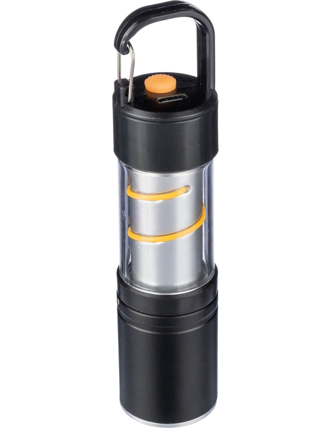 Linterna COB fabricada en aluminio y aleación con carcasa de ABS y clip metálico en la parte trasera. Dispone de tres funciones de luz: una luz directa como la de cualquier linterna tradicional, una luz difusa a través de una tira LED integrada en el cuerpo y un modo zoom. Cuenta con un mosquetón negro en la parte superior y funciona con una batería de iones de litio de 500 mAh recargable mediante cable tipo C, ofreciendo 130 lúmenes de iluminación. Se activa con un botón pulsador e incluye un cable negro de 30 cm. Gracias a su versatilidad y facilidad de transporte gracias a su mosquetón, es adecuada para actividades al aire libre, camping, senderismo, emergencias o incluso para uso doméstico. Se presenta en una caja de cartón marrón.