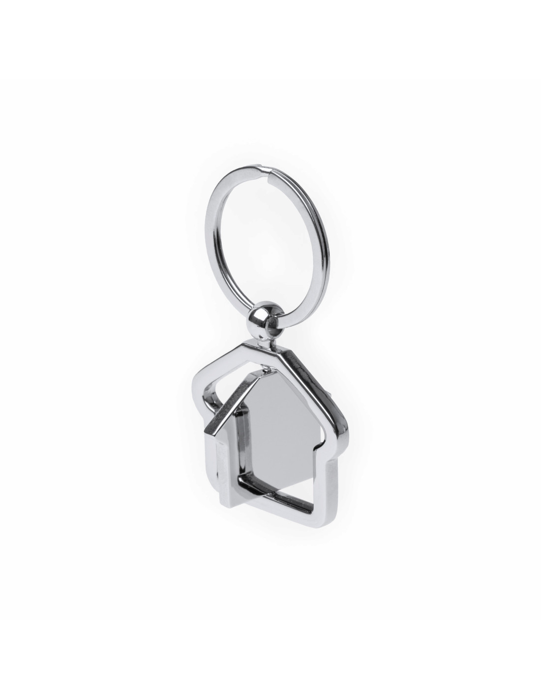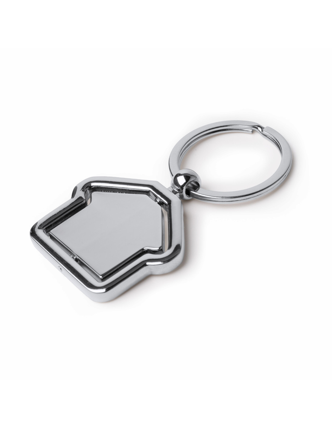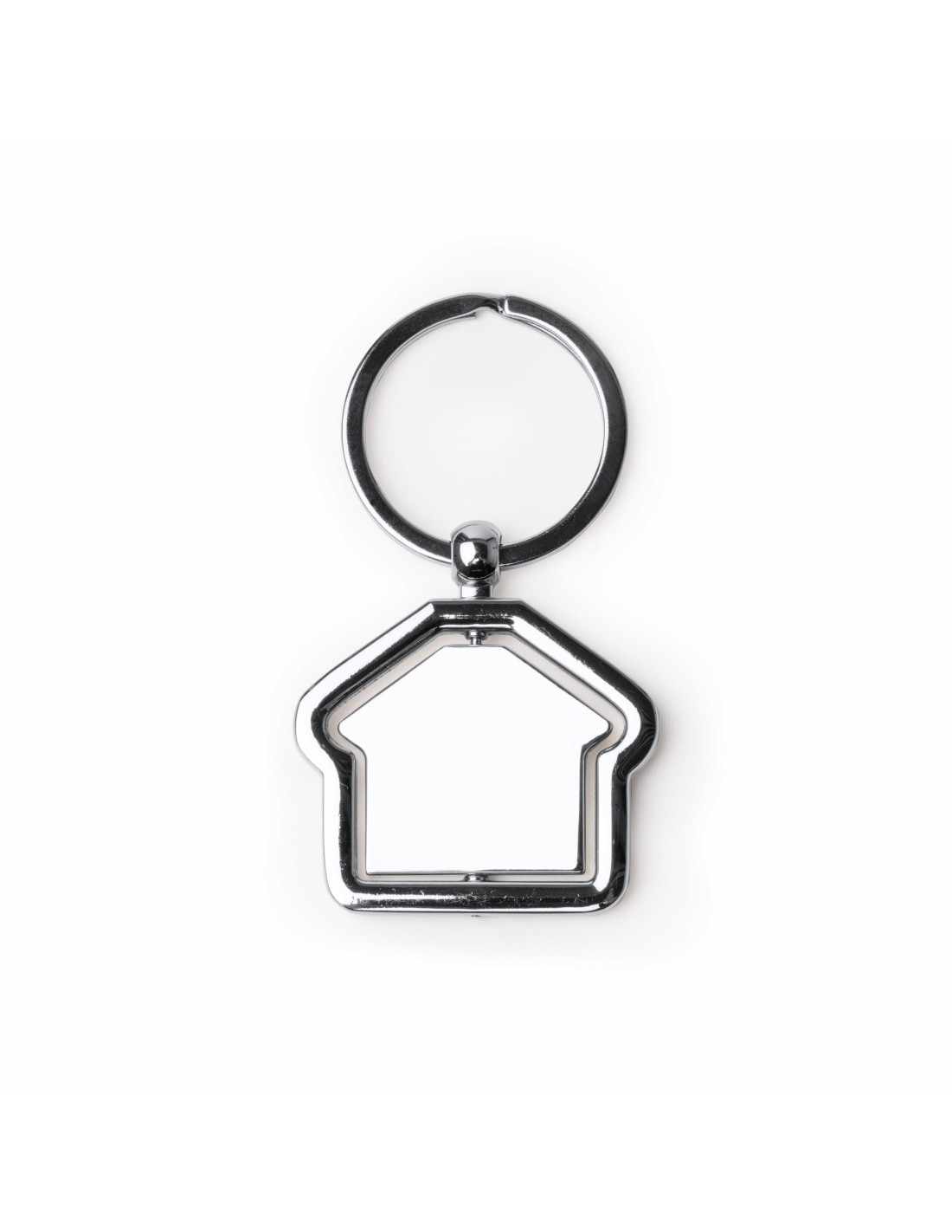 Llavero metálico giratorio con original diseño en forma de casa, que gira sobre su eje vertical dentro de un marco fijo. Incorpora una amplia superficie central especialmente diseñada para el marcaje, ideal para destacar tu marca de forma visible y atractiva. Su estructura resistente y su mecanismo giratorio aportan un toque distintivo y funcional, perfecto como artículo promocional. Es un regalo personalizado perfecto para cualquier empresa relacionada con viviendas como inmobiliarias o gestorías. Con unas dimensiones aproximadas de 4 x 7 x 0,9 cm, es un llavero práctico, duradero y con gran impacto visual.