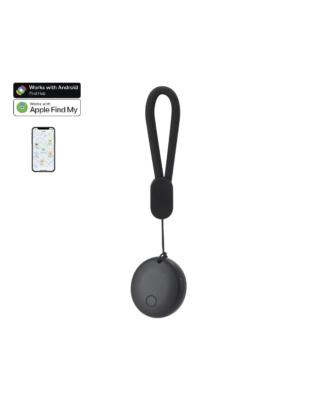 Localizador inteligente diseñado para ayudarte a encontrar objetos personales mediante funciones anti-pérdida o búsqueda de aparcamiento, entre otras utilidades prácticas en el día a día. Incorpora un cordón de agarre en poliéster que facilita su colocación en llaves, mochilas, bolsos u otros accesorios. Cuenta con sistema de conexión dual, compatible con Apple Find My y Android Find Hub, lo que permite rastrear la ubicación en tiempo real desde dispositivos iOS y Android a través de la app correspondiente. Funciona con pilas de botón incluidas, listo para su uso inmediato sin necesidad de configuraciones complejas. Una solución funcional para viajes, trabajo, eventos o acciones promocionales relacionadas con tecnología y movilidad.