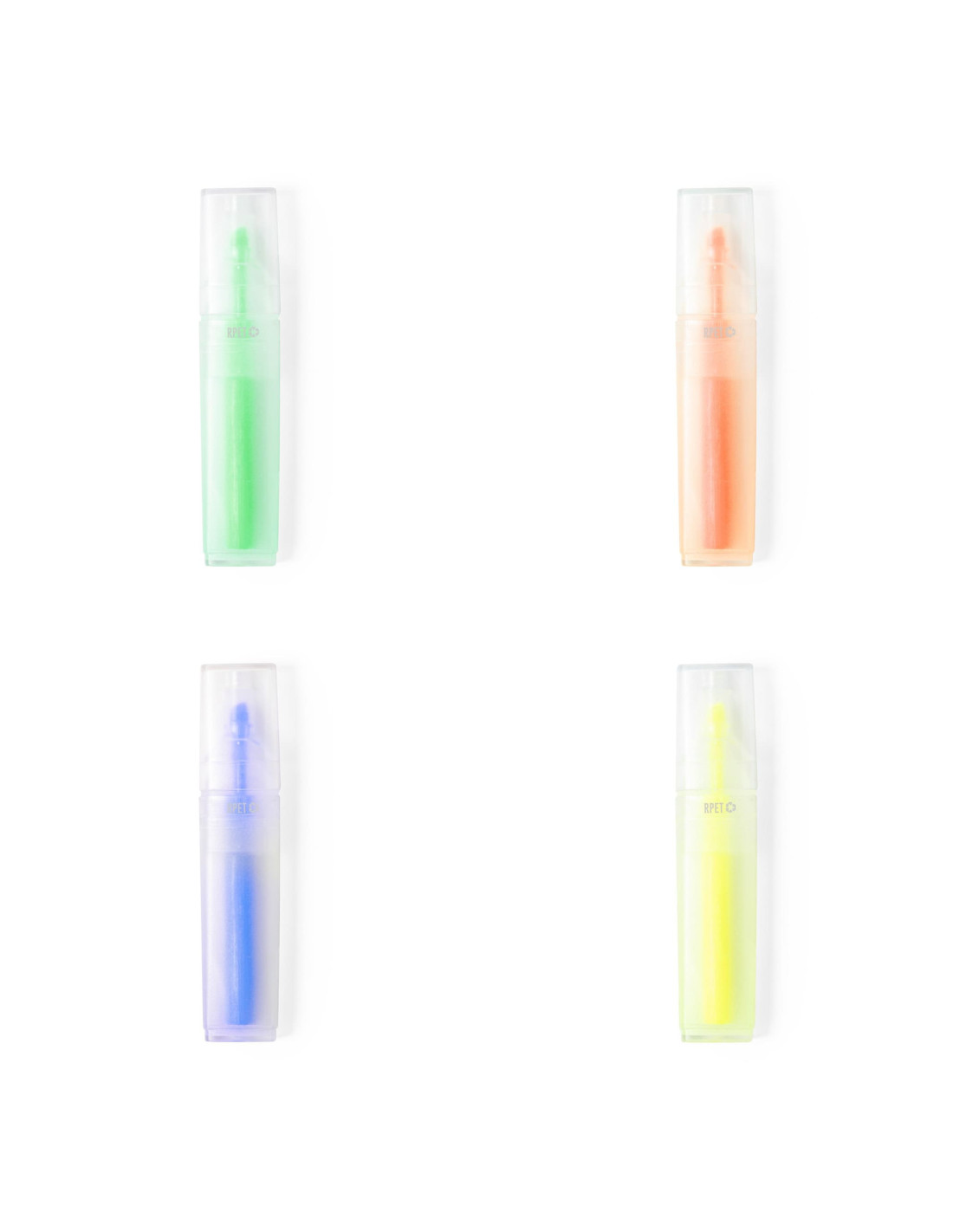 Práctico marcador fluorescente disponible en cuatro colores (amarillo, naranja, azul y verde), fabricado en RPET, un material elaborado a partir de plástico reciclado que fomenta la reutilización de residuos plásticos del planeta. Marcador con cuerpo transparente y capucha a juego. El artículo tiene impreso el distintivo RPET en el cuerpo de manera fina y elegante.