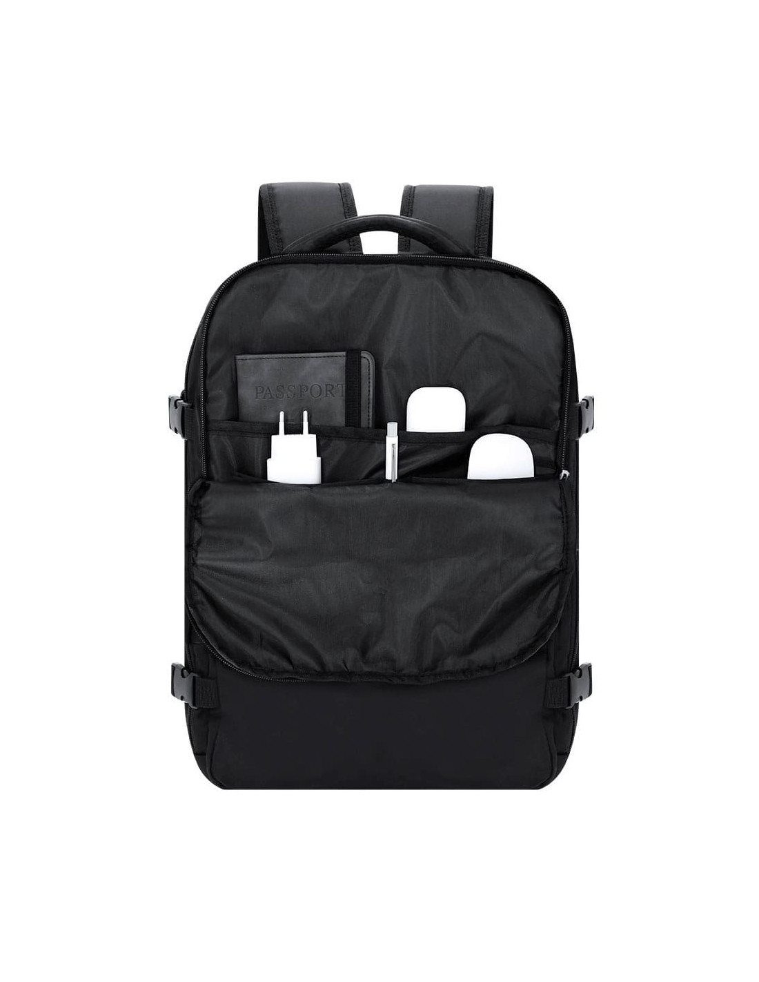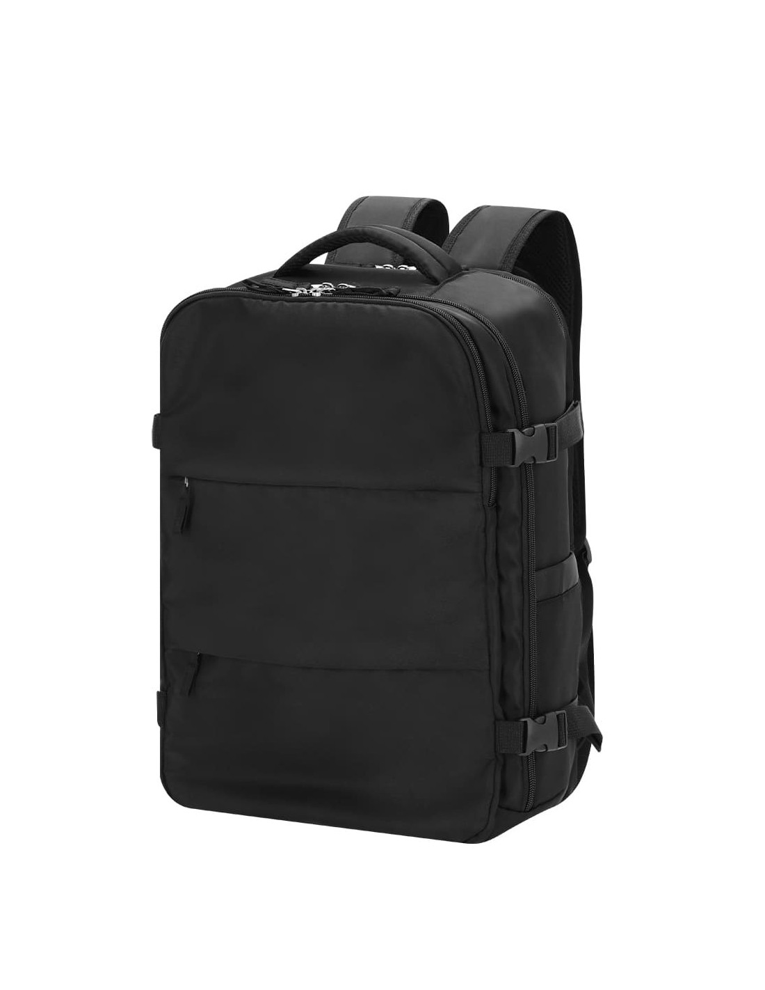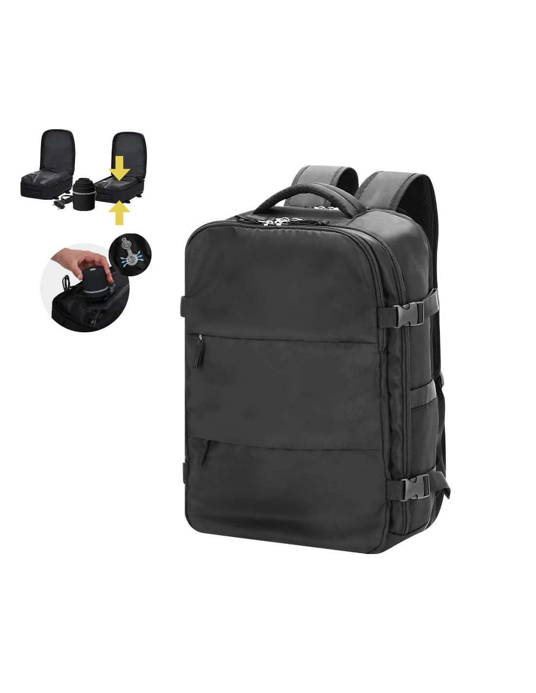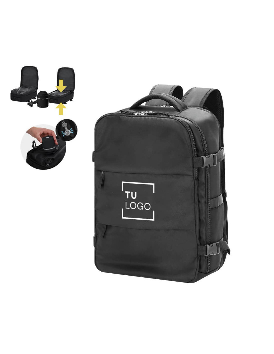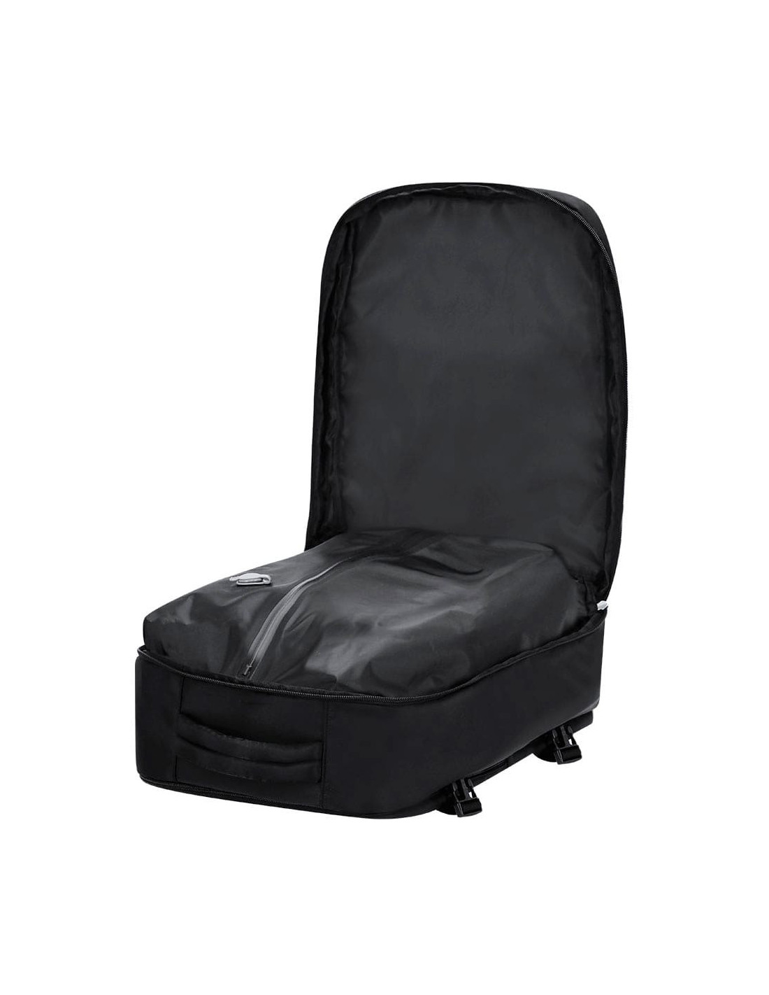 Mochila al vacío fabricada en nylon, diseñada para optimizar el espacio de carga gracias a su sistema de compresión mediante bomba de vacío incluida de 35W. Dispone de un compartimento principal extensible con bolsillo interior de vacío que permite reducir el volumen del contenido, ideal para viajes y desplazamientos largos. Incorpora un tercer compartimento con organizador interior y varios bolsillos para almacenar accesorios, documentación o dispositivos electrónicos, además de dos bolsillos frontales de menor tamaño para acceso rápido. Cuenta con hebillas laterales para ajuste del volumen, espalda y tirantes acolchados que mejoran la comodidad durante el transporte, cinta trasera para fijación a trolley, asa superior de agarre y estructura pensada para un uso intensivo en viajes de negocio, escapadas o uso diario. Incluye bomba de vacío y está confeccionada en resistente nylon, un material ligero y duradero.