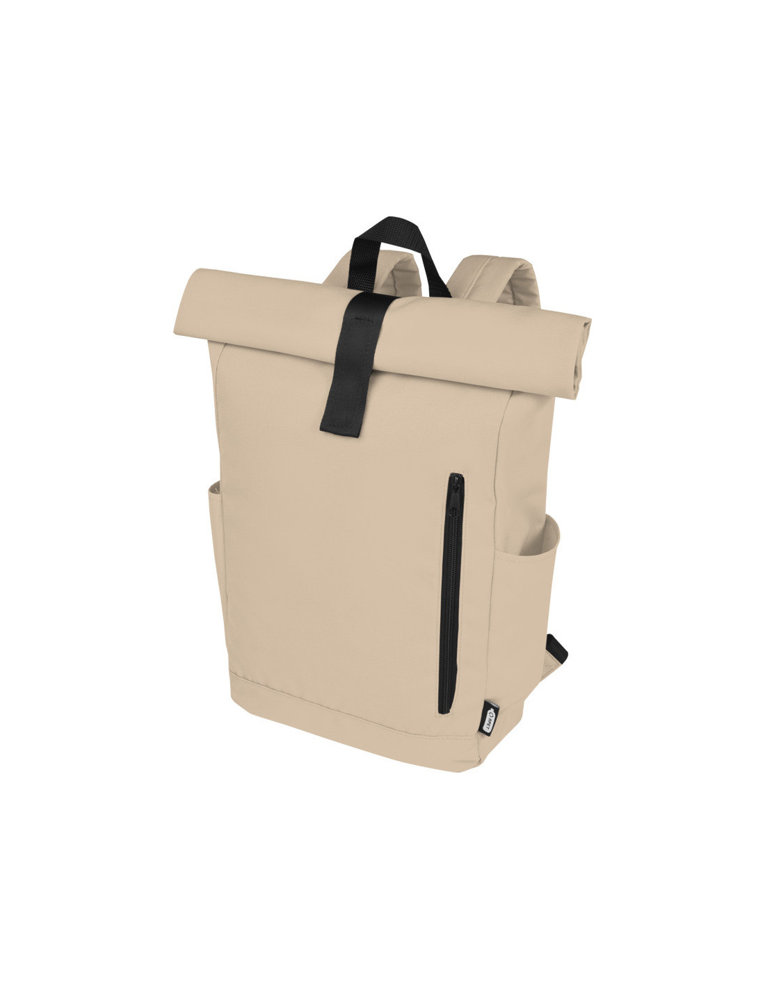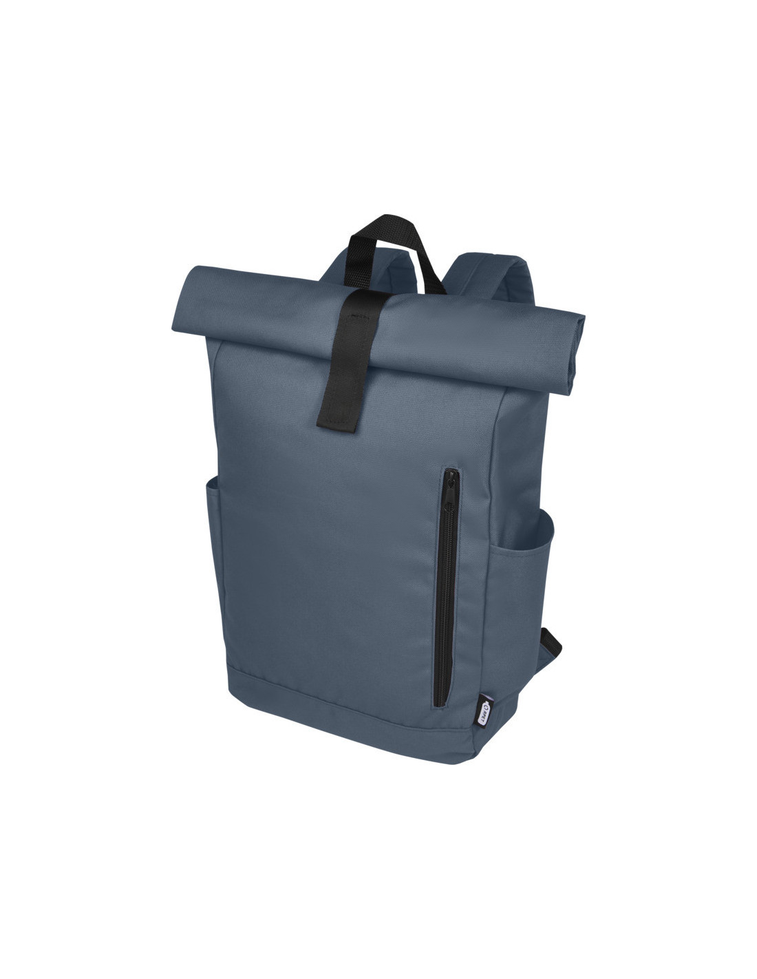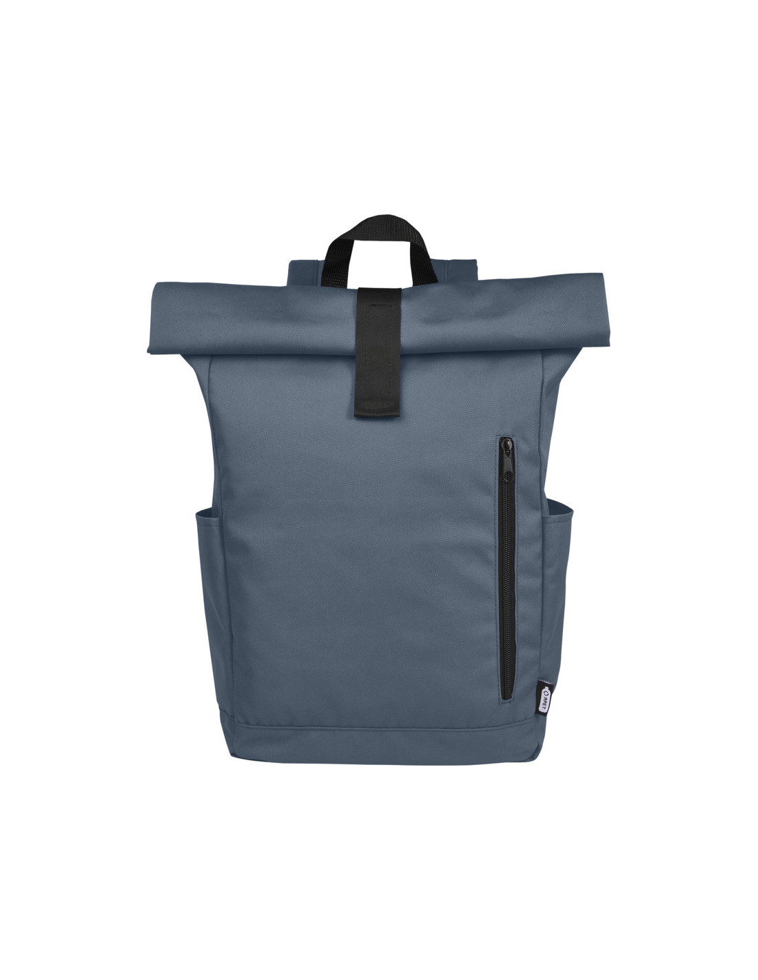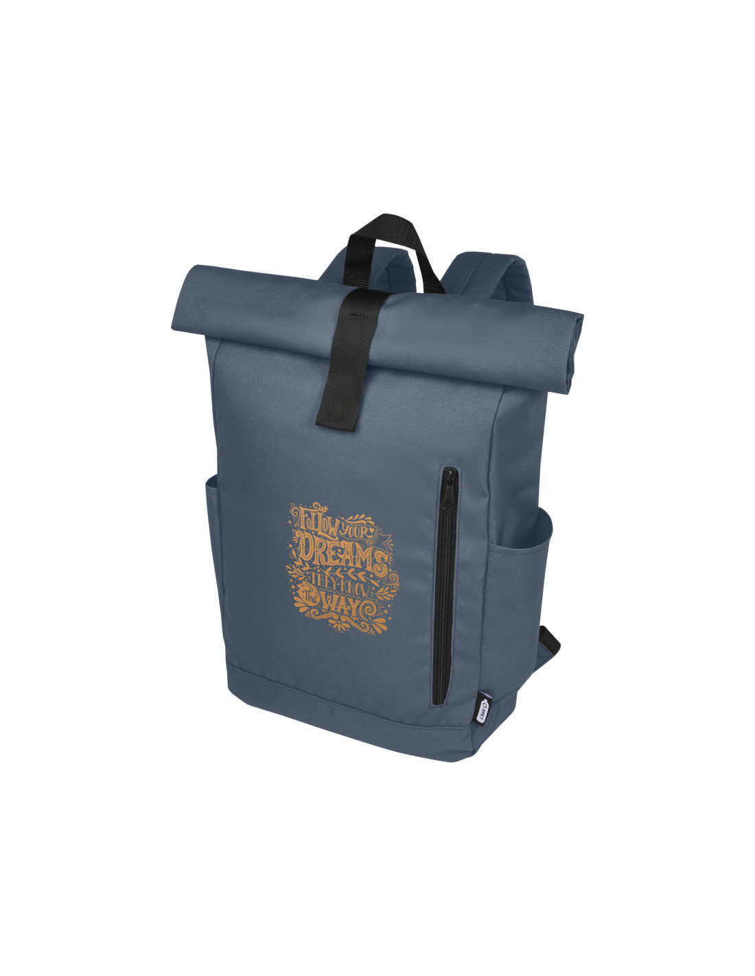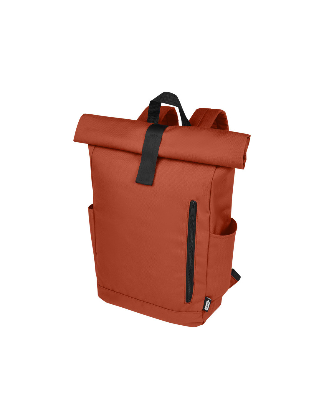 La mochila enrollable personalizada de 18 litros es una opción práctica y sostenible para el uso diario, fabricada en poliéster reciclado RPET con certificado GRS. Su diseño resistente e impermeable la hace ideal para ir al trabajo, a clase o desplazarse por la ciudad con total comodidad. Cuenta con un amplio compartimento interior acolchado para portátiles de hasta 15,6”, además de un bolsillo frontal con cremallera y dos bolsillos laterales para llevar siempre organizados los accesorios esenciales. Incorpora respaldo y asas ajustables acolchadas, asa de transporte superior y un cierre enrollable con sistema de gancho y bucle que aporta seguridad y un estilo moderno. Una mochila perfecta para quienes buscan funcionalidad, diseño urbano y un menor impacto medioambiental.