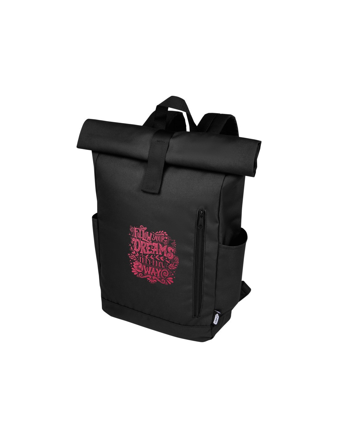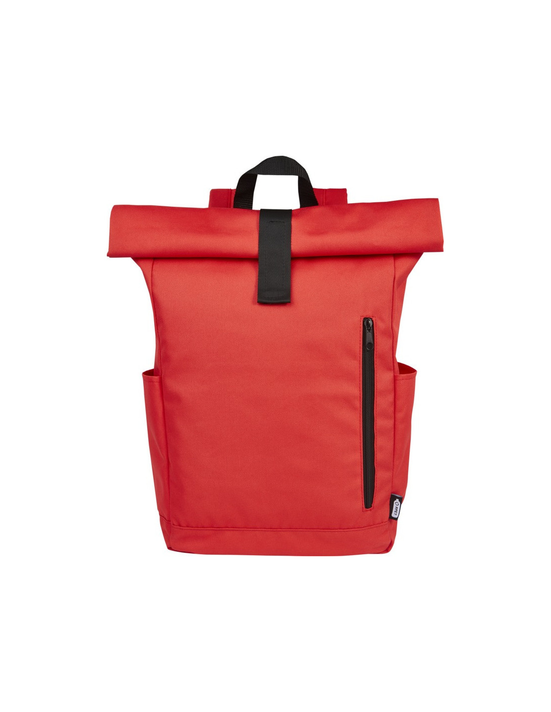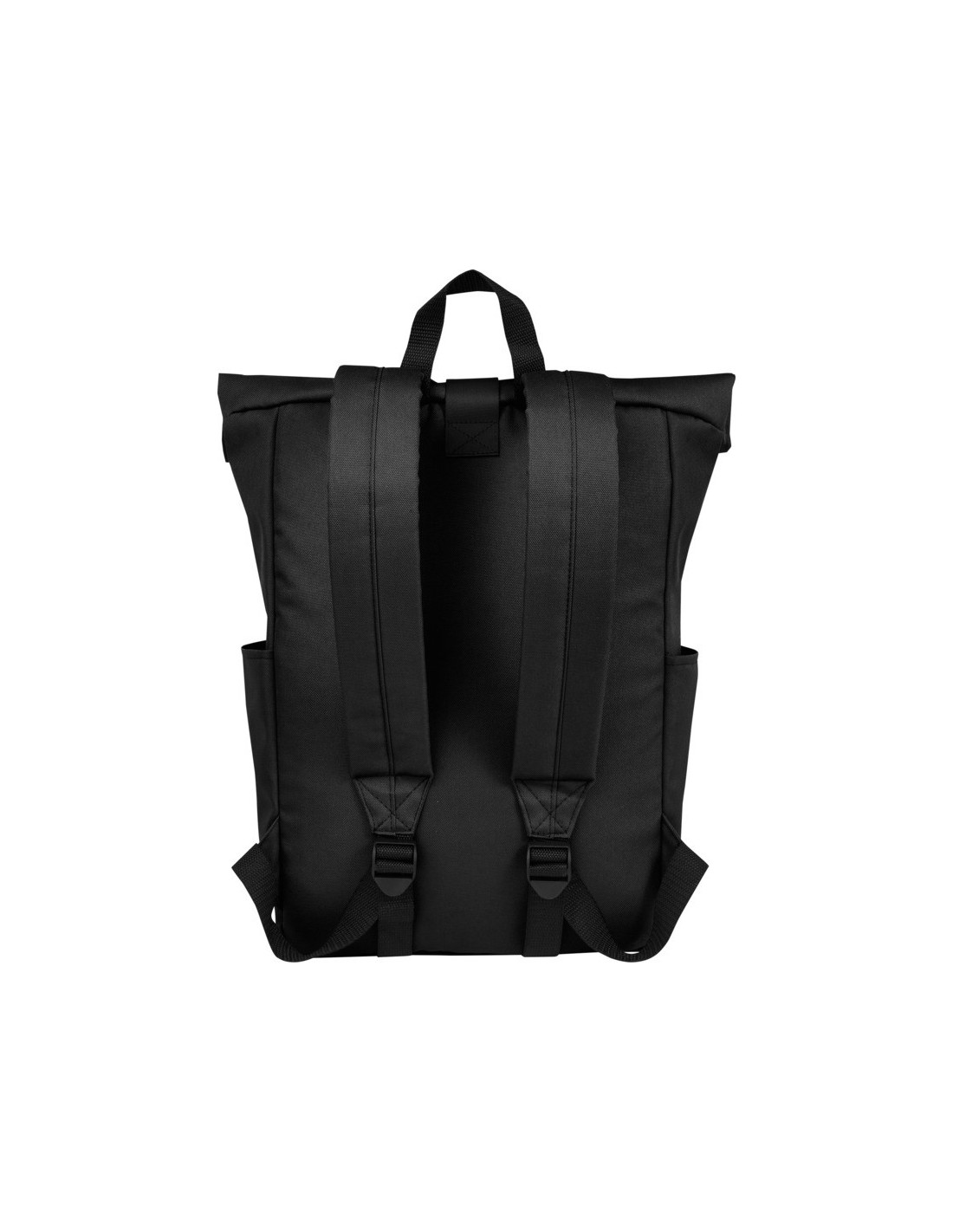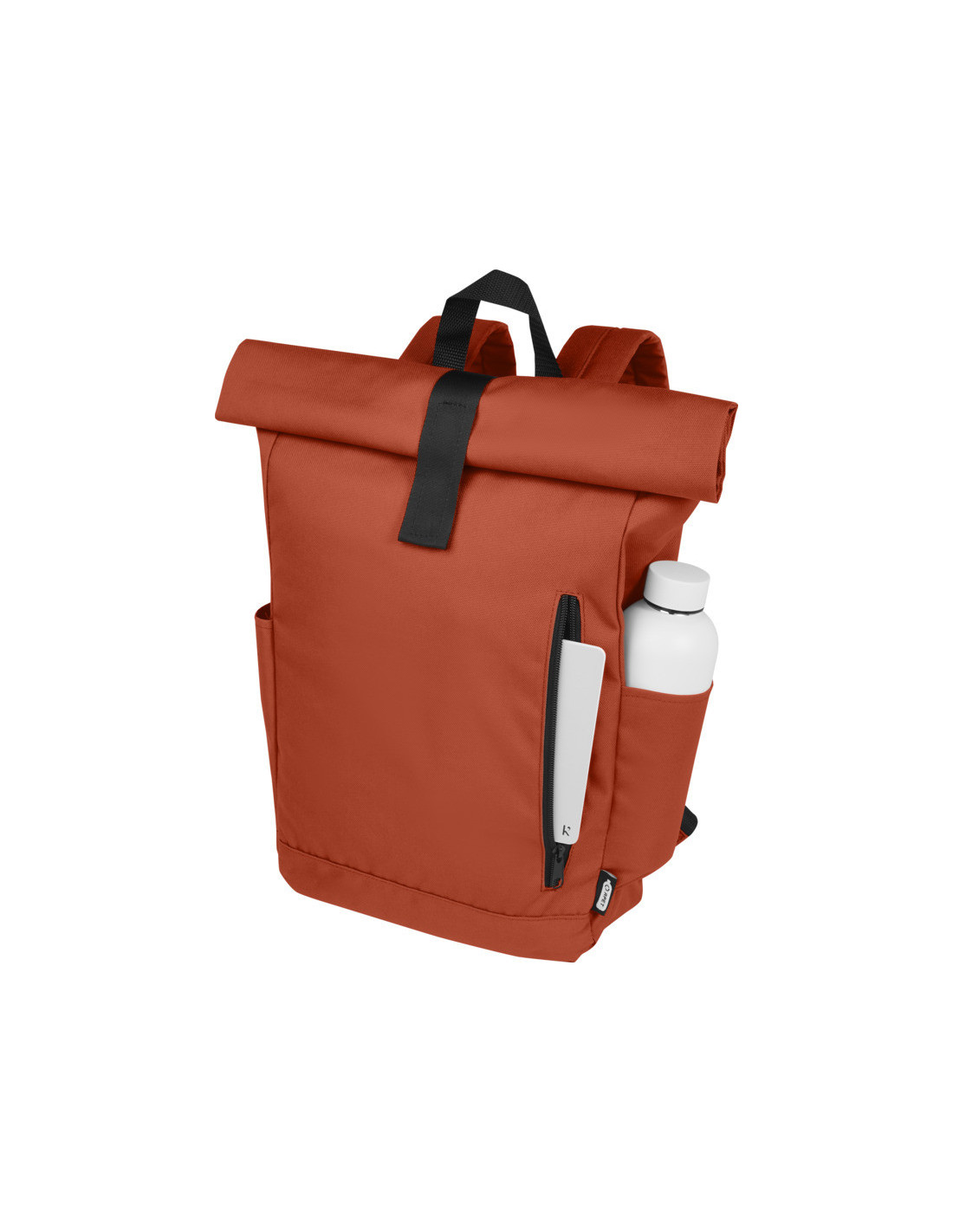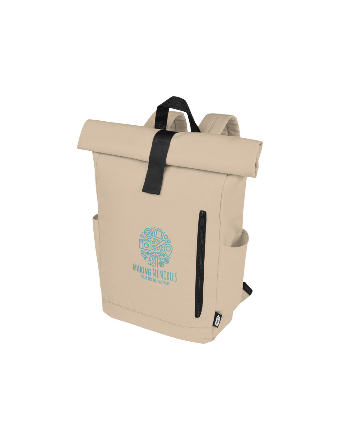 La mochila enrollable personalizada de 18 litros es una opción práctica y sostenible para el uso diario, fabricada en poliéster reciclado RPET con certificado GRS. Su diseño resistente e impermeable la hace ideal para ir al trabajo, a clase o desplazarse por la ciudad con total comodidad. Cuenta con un amplio compartimento interior acolchado para portátiles de hasta 15,6”, además de un bolsillo frontal con cremallera y dos bolsillos laterales para llevar siempre organizados los accesorios esenciales. Incorpora respaldo y asas ajustables acolchadas, asa de transporte superior y un cierre enrollable con sistema de gancho y bucle que aporta seguridad y un estilo moderno. Una mochila perfecta para quienes buscan funcionalidad, diseño urbano y un menor impacto medioambiental.