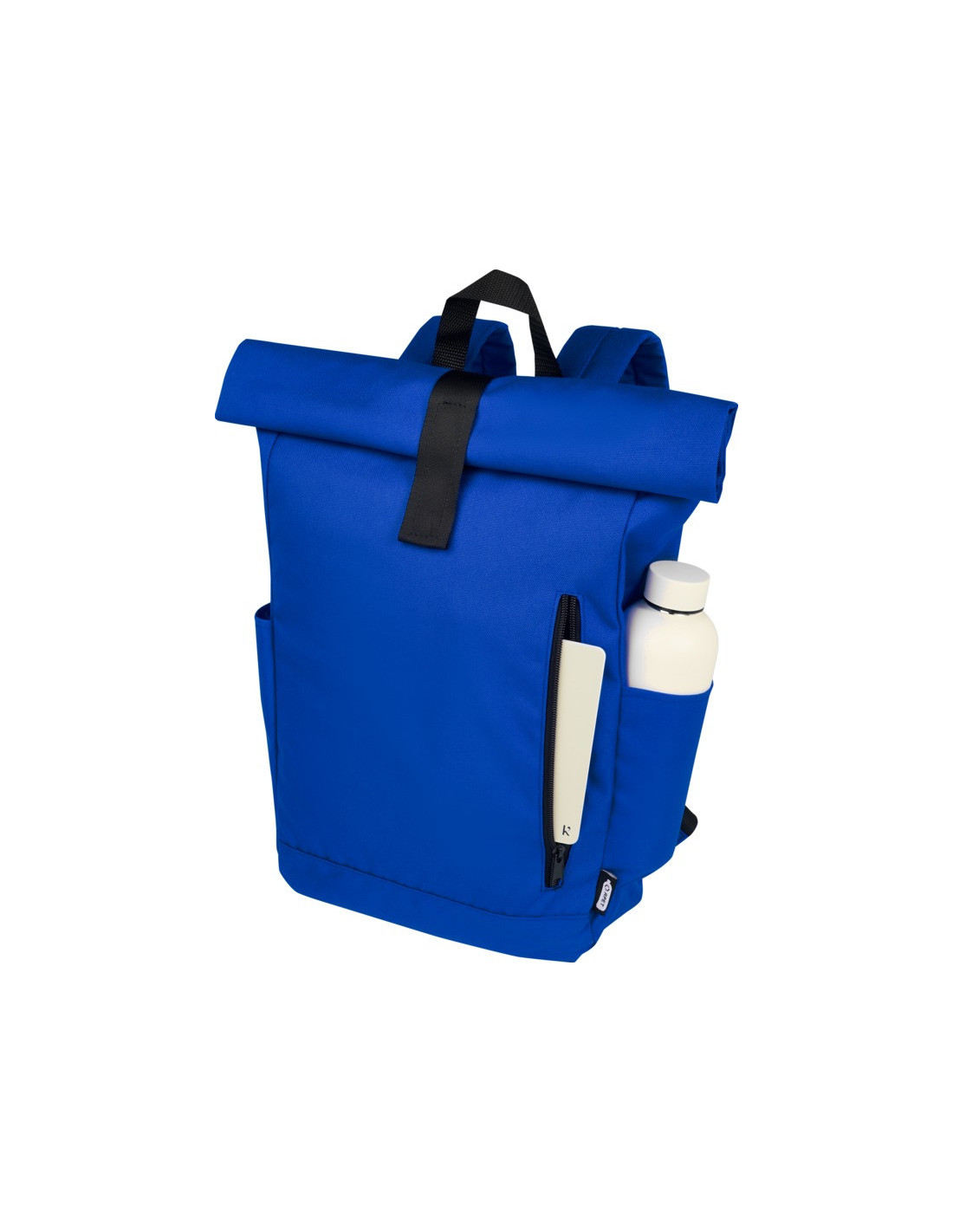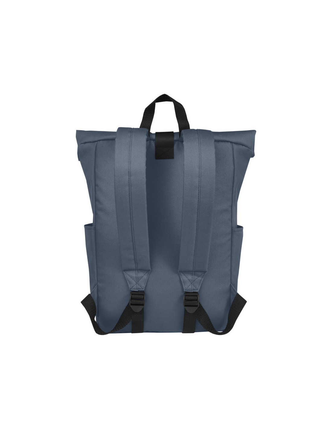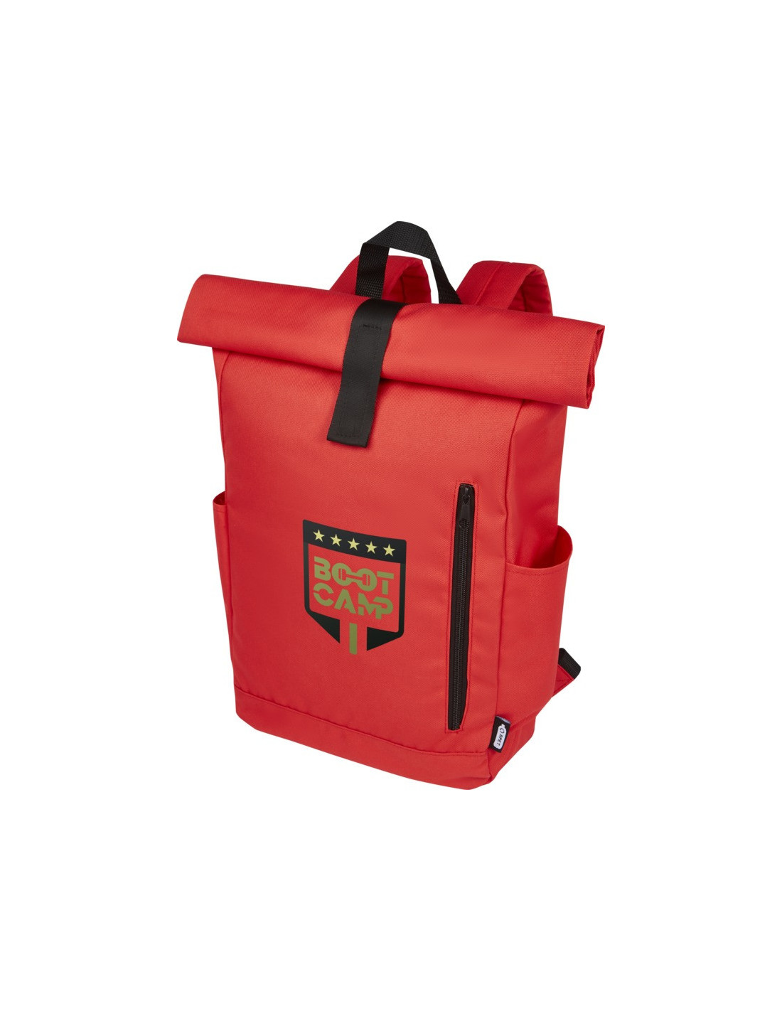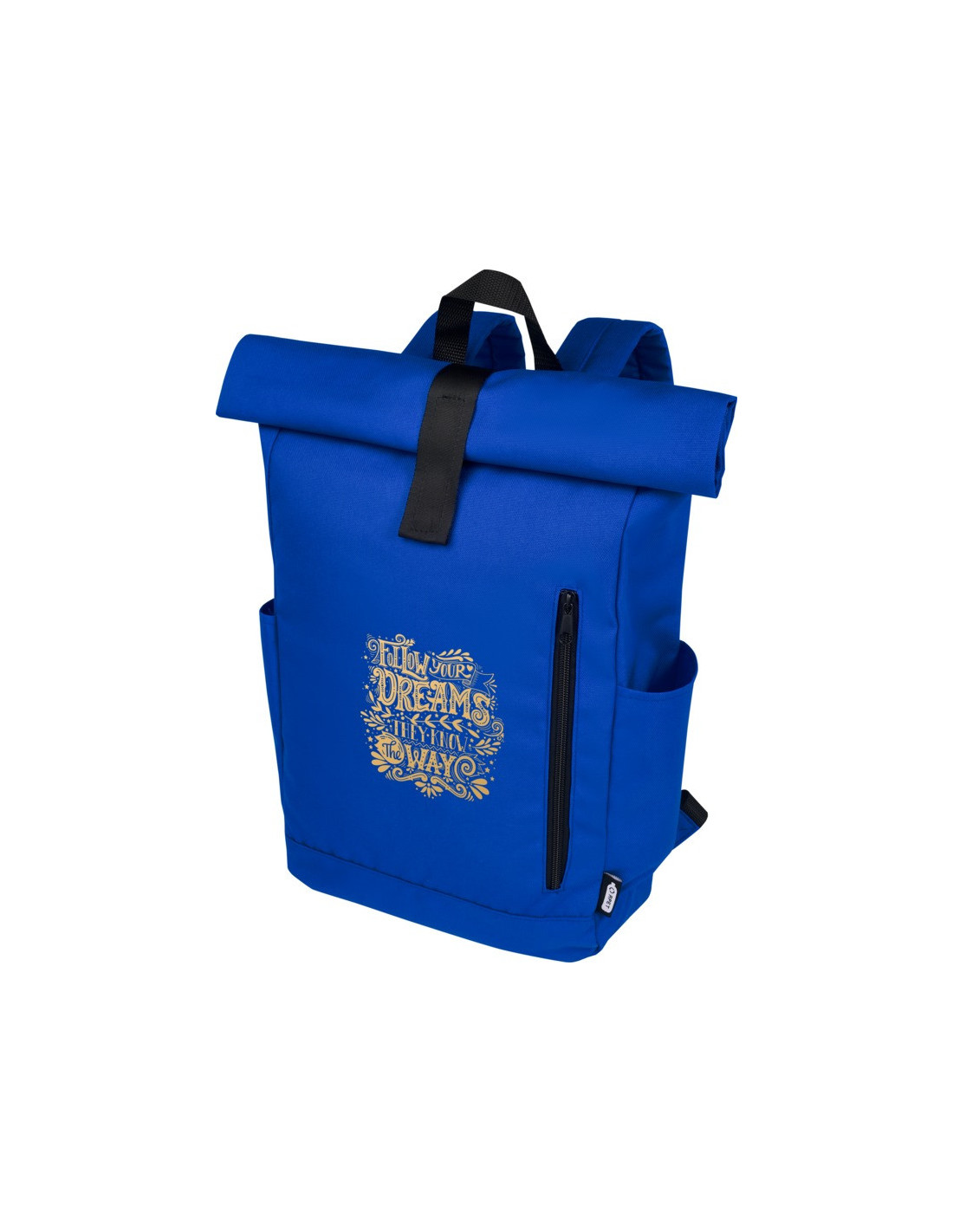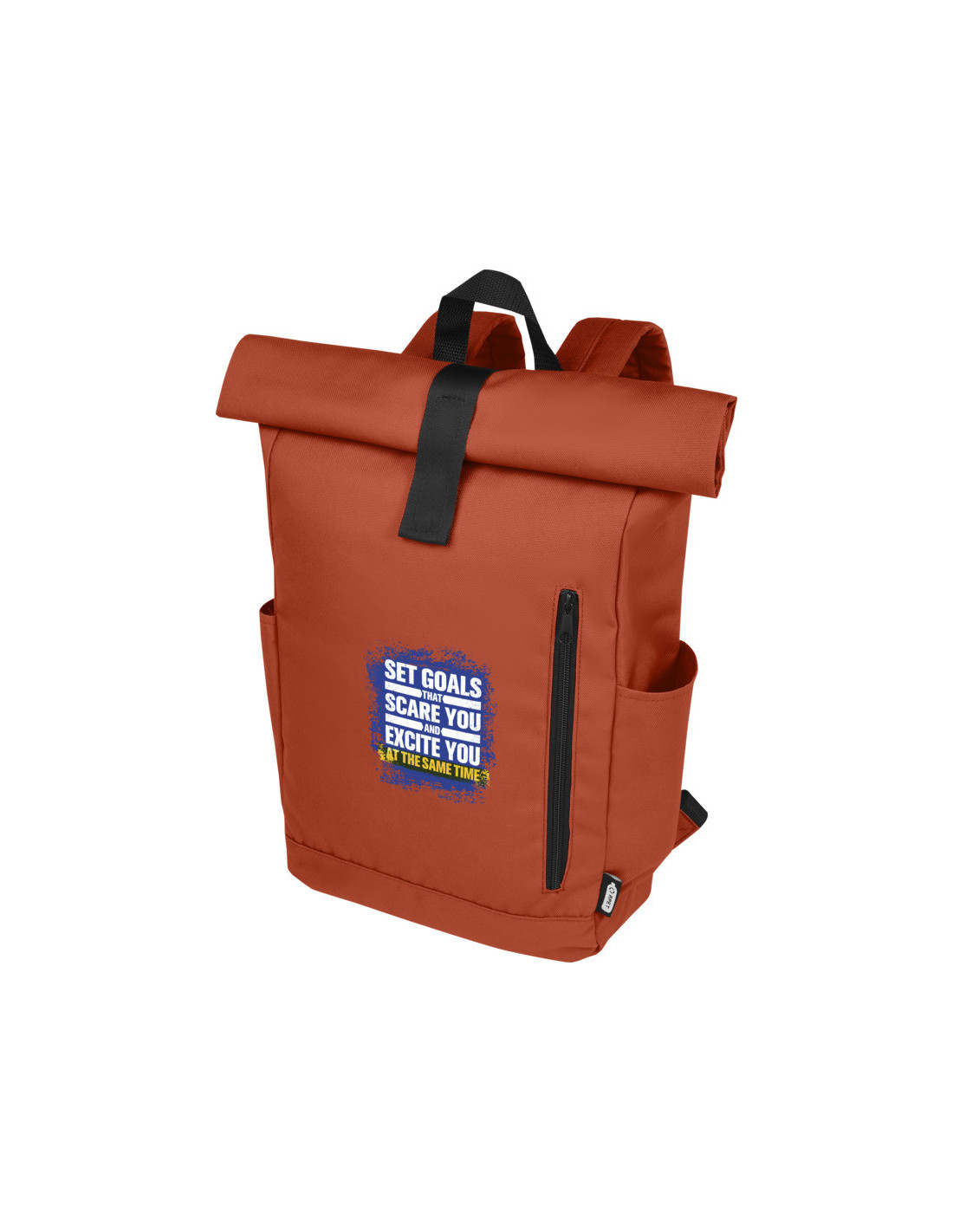 La mochila enrollable personalizada de 18 litros es una opción práctica y sostenible para el uso diario, fabricada en poliéster reciclado RPET con certificado GRS. Su diseño resistente e impermeable la hace ideal para ir al trabajo, a clase o desplazarse por la ciudad con total comodidad. Cuenta con un amplio compartimento interior acolchado para portátiles de hasta 15,6”, además de un bolsillo frontal con cremallera y dos bolsillos laterales para llevar siempre organizados los accesorios esenciales. Incorpora respaldo y asas ajustables acolchadas, asa de transporte superior y un cierre enrollable con sistema de gancho y bucle que aporta seguridad y un estilo moderno. Una mochila perfecta para quienes buscan funcionalidad, diseño urbano y un menor impacto medioambiental.