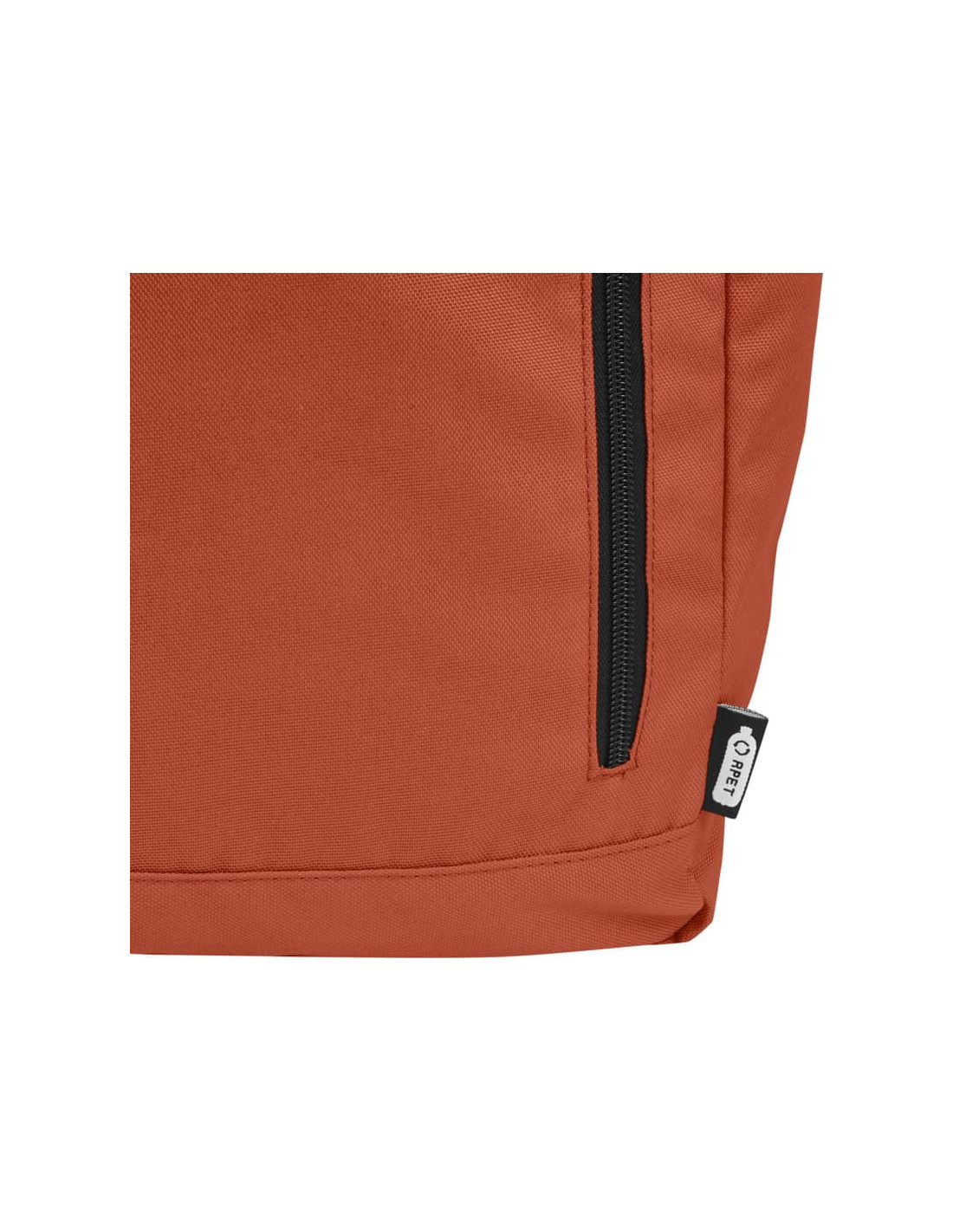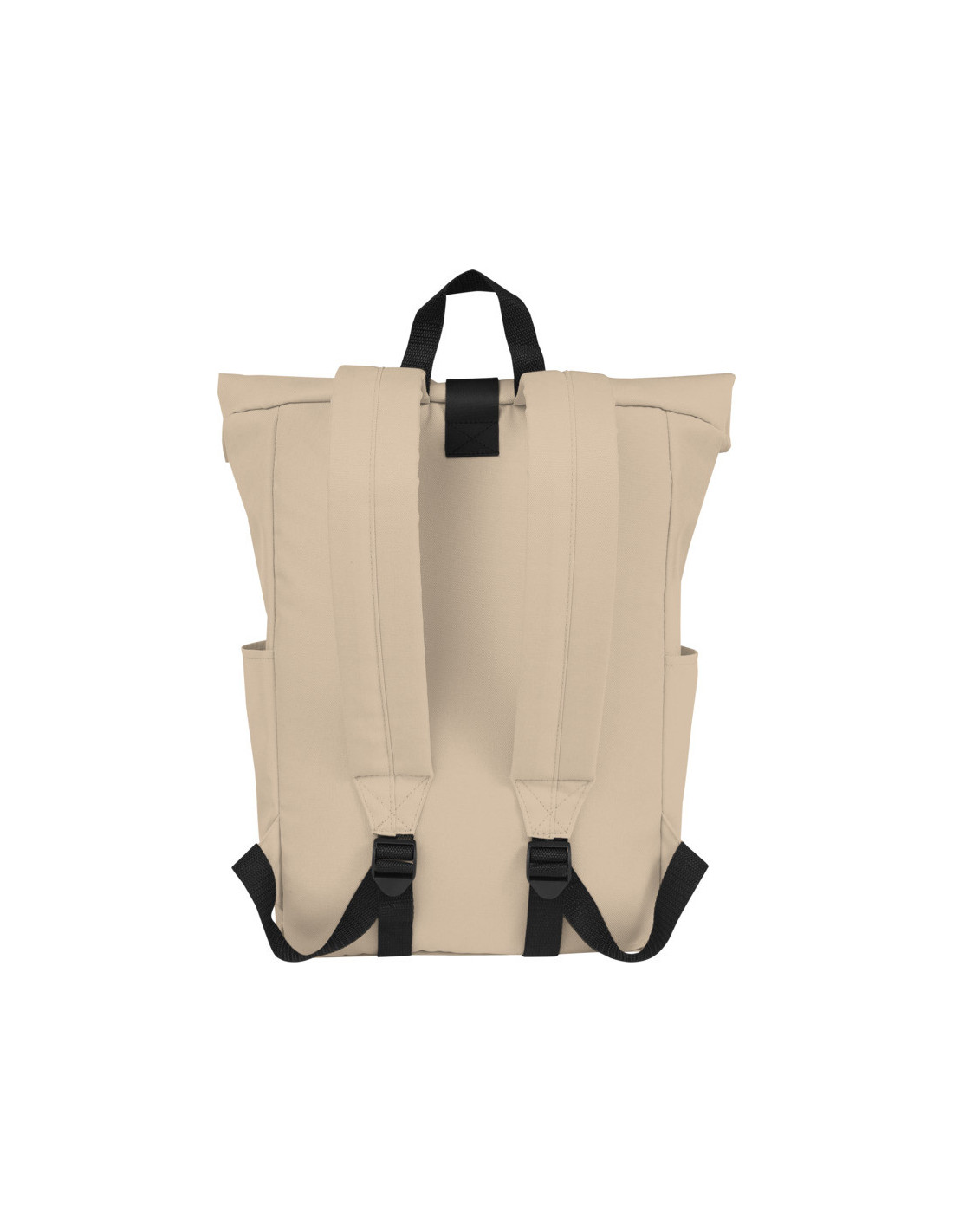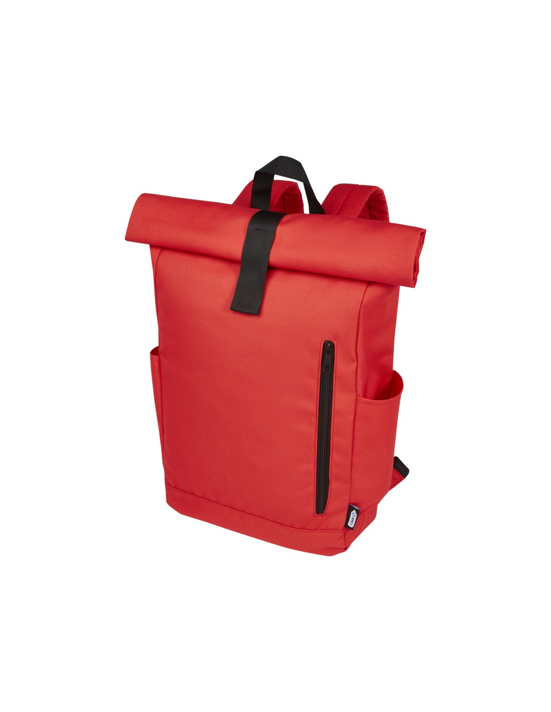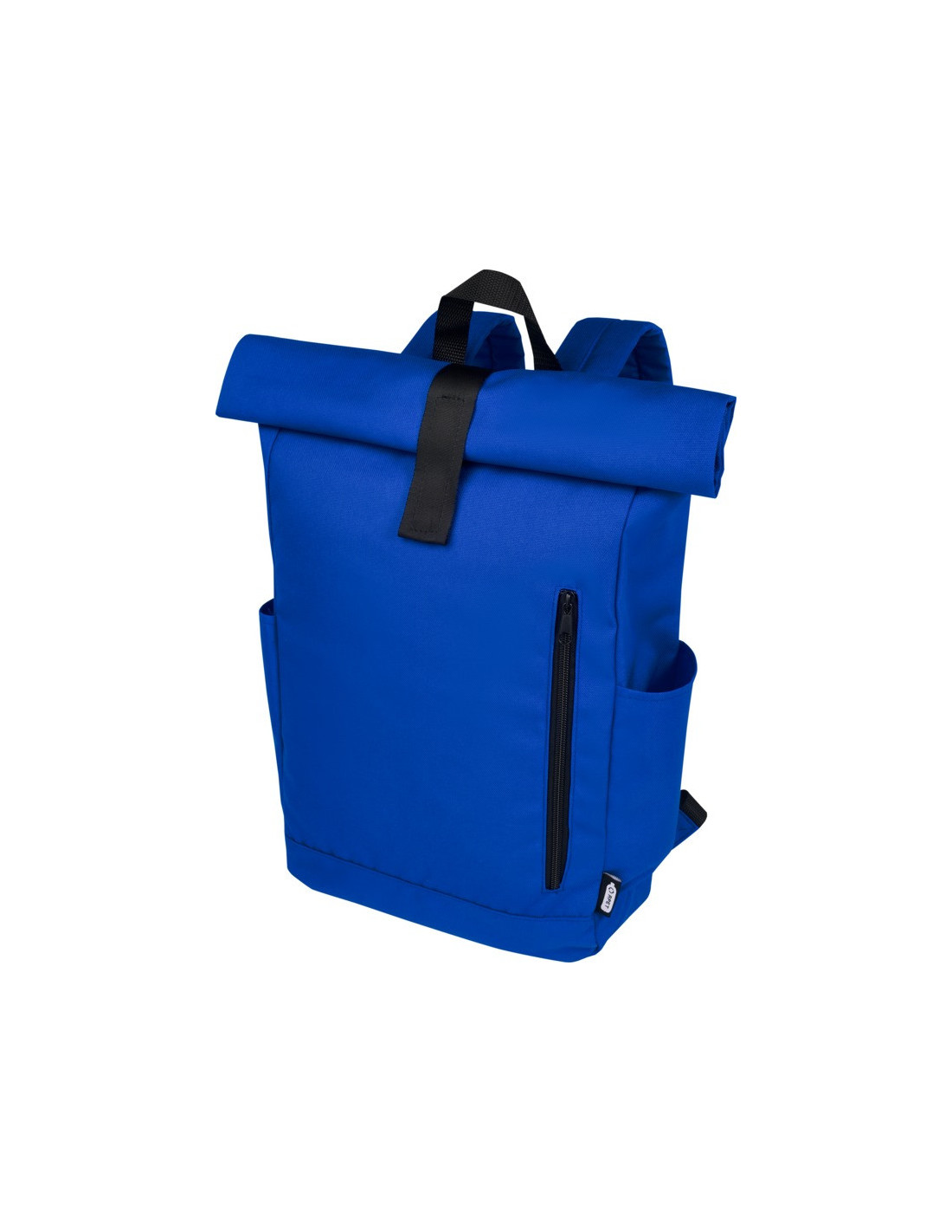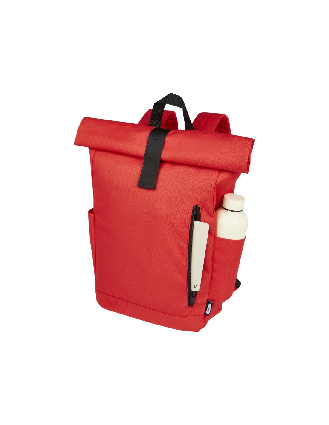 La mochila enrollable personalizada de 18 litros es una opción práctica y sostenible para el uso diario, fabricada en poliéster reciclado RPET con certificado GRS. Su diseño resistente e impermeable la hace ideal para ir al trabajo, a clase o desplazarse por la ciudad con total comodidad. Cuenta con un amplio compartimento interior acolchado para portátiles de hasta 15,6”, además de un bolsillo frontal con cremallera y dos bolsillos laterales para llevar siempre organizados los accesorios esenciales. Incorpora respaldo y asas ajustables acolchadas, asa de transporte superior y un cierre enrollable con sistema de gancho y bucle que aporta seguridad y un estilo moderno. Una mochila perfecta para quienes buscan funcionalidad, diseño urbano y un menor impacto medioambiental.