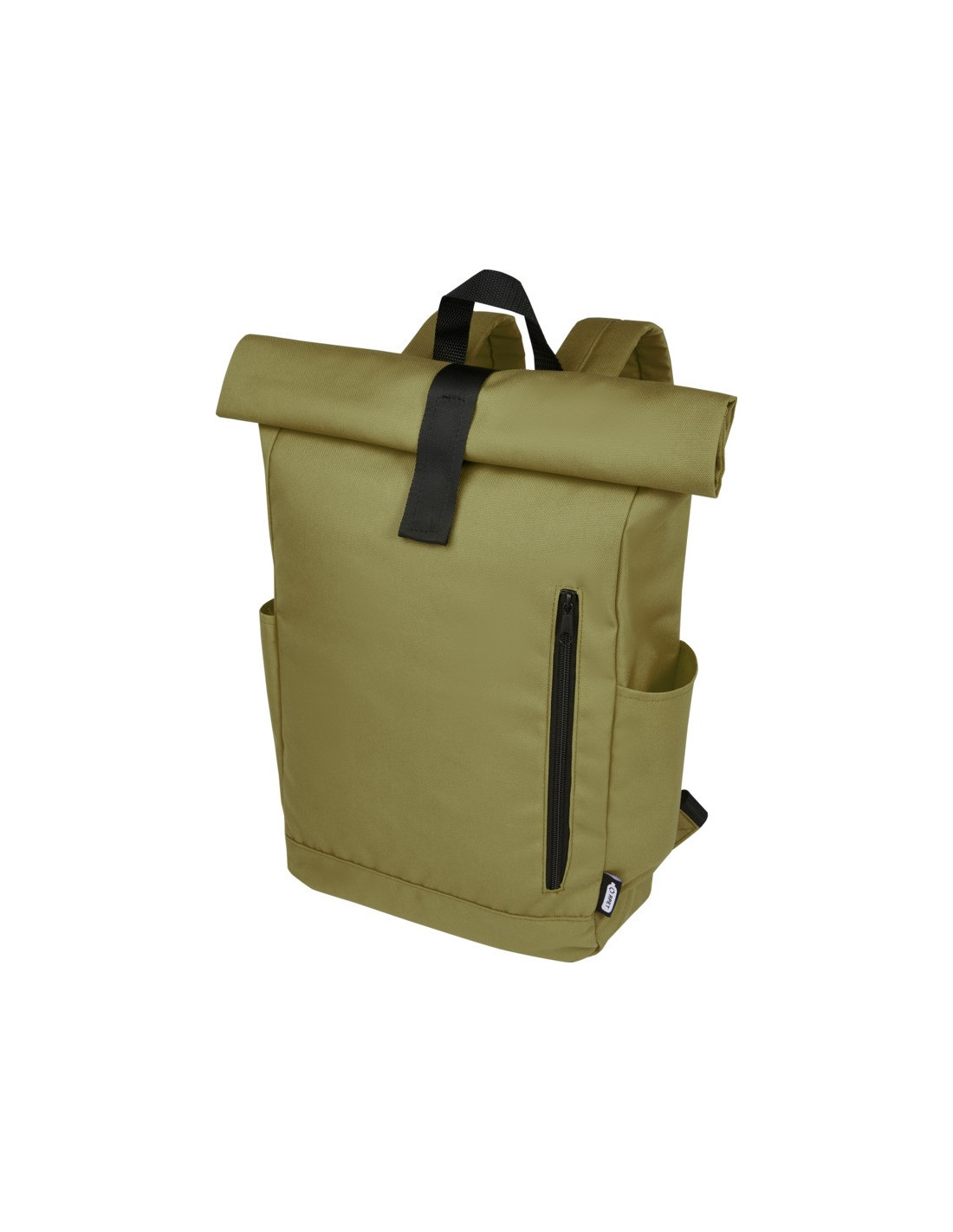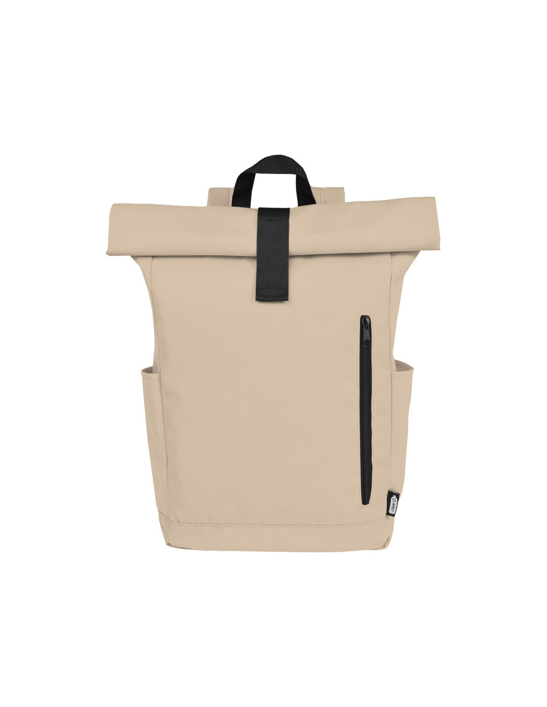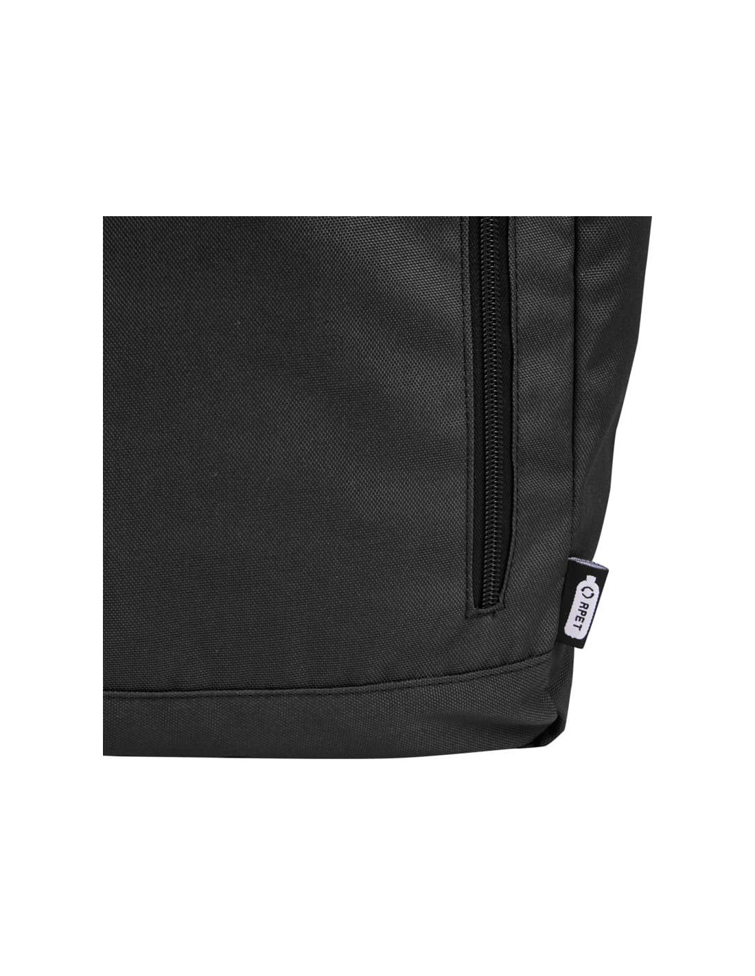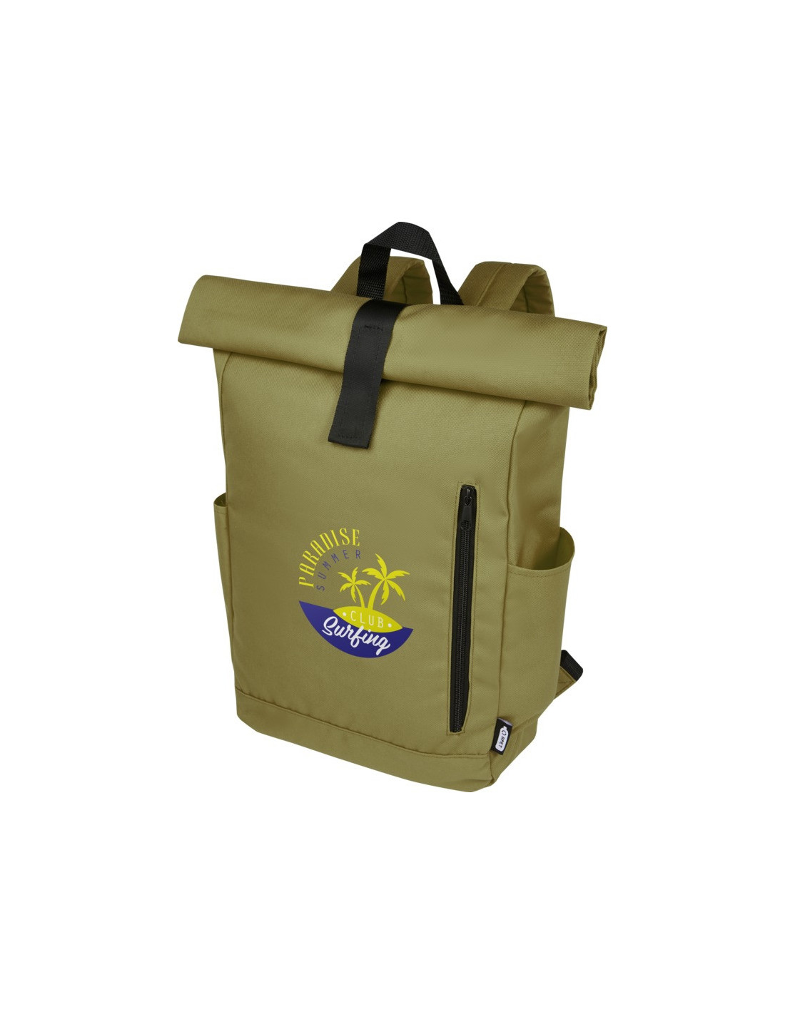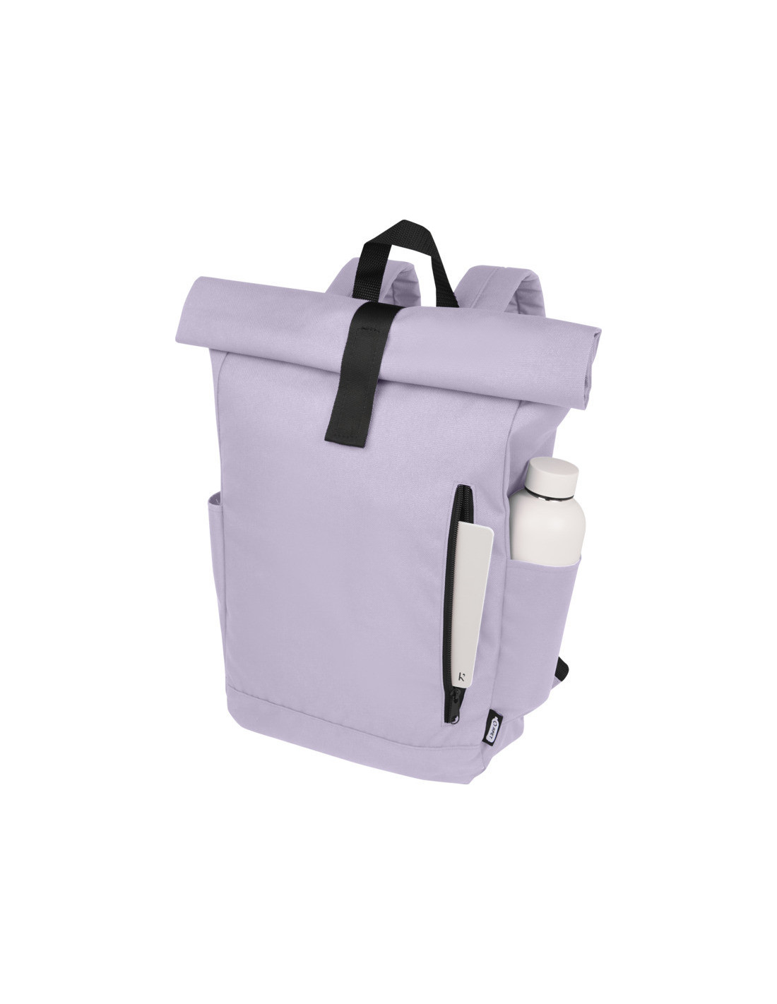 La mochila enrollable personalizada de 18 litros es una opción práctica y sostenible para el uso diario, fabricada en poliéster reciclado RPET con certificado GRS. Su diseño resistente e impermeable la hace ideal para ir al trabajo, a clase o desplazarse por la ciudad con total comodidad. Cuenta con un amplio compartimento interior acolchado para portátiles de hasta 15,6”, además de un bolsillo frontal con cremallera y dos bolsillos laterales para llevar siempre organizados los accesorios esenciales. Incorpora respaldo y asas ajustables acolchadas, asa de transporte superior y un cierre enrollable con sistema de gancho y bucle que aporta seguridad y un estilo moderno. Una mochila perfecta para quienes buscan funcionalidad, diseño urbano y un menor impacto medioambiental.