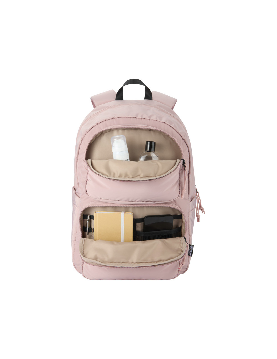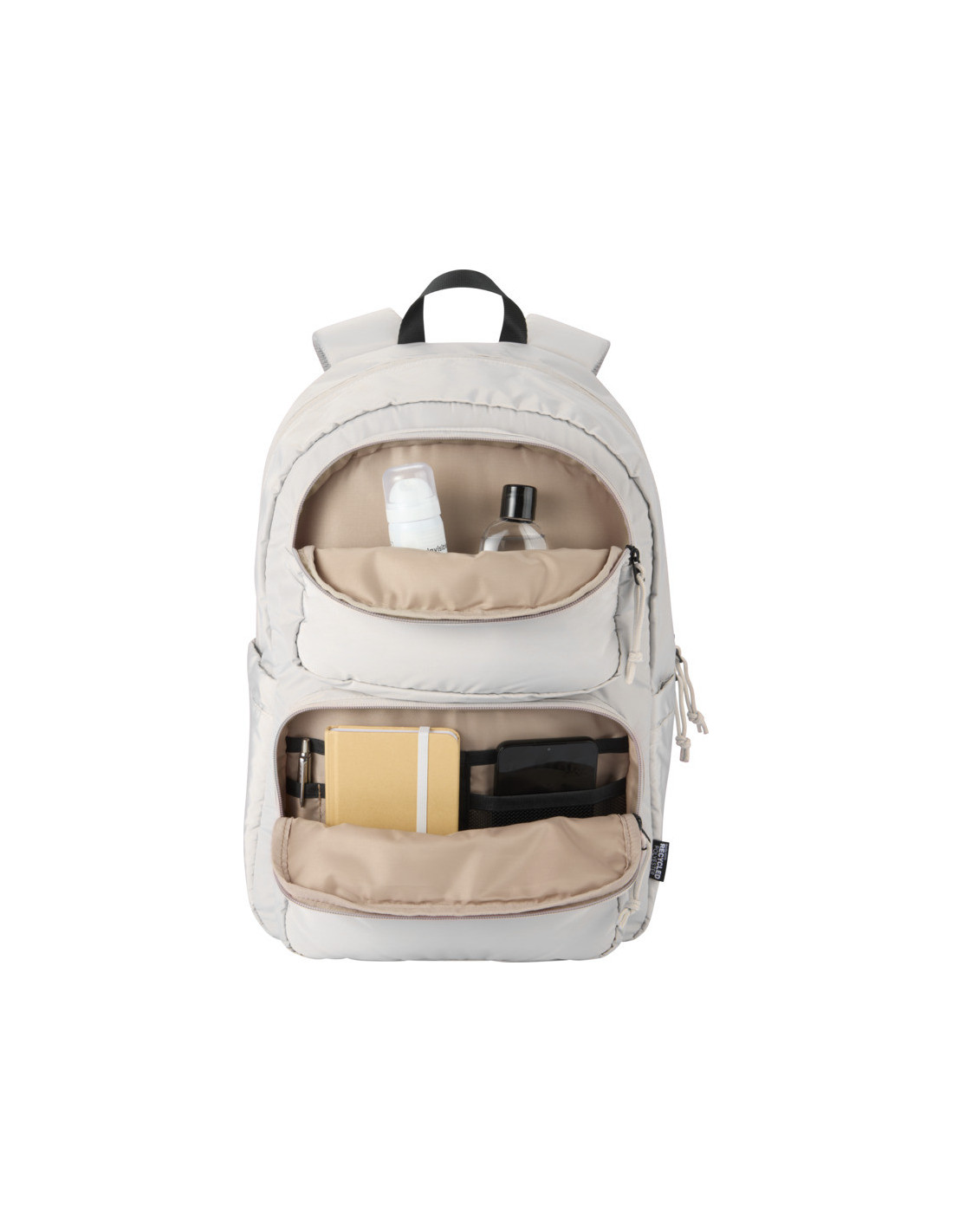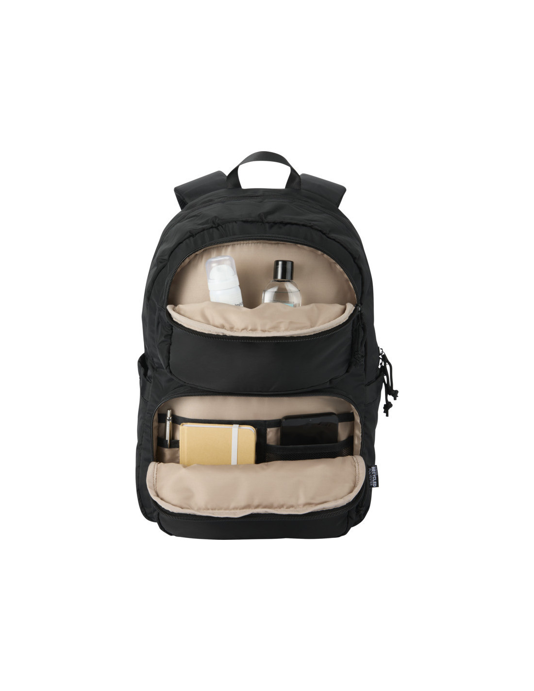 Nuestra mochila para portátil de 15,6" personalizada es una opción moderna y sostenible para quienes necesitan comodidad y organización en su rutina diaria. Con una capacidad de 18 litros y fabricada en poliéster reciclado con certificado GRS, ofrece un equilibrio perfecto entre estilo actual y compromiso medioambiental. Su interior cuenta con un compartimento acolchado diseñado para portátiles de hasta 15,6”, además de bolsillos exteriores prácticos para llevar accesorios, documentos o cargadores siempre accesibles. Gracias a su acabado repelente al agua, protege tus pertenencias frente a la humedad en el uso diario y durante los viajes. La parte trasera de malla transpirable mejora la comodidad, mientras que la cinta para sujetarla a la maleta facilita el transporte en viajes en avión o tren. Su acolchado característico aporta un toque elegante y una protección adicional, convirtiéndola en una mochila ideal para trabajo, estudios o escapadas.